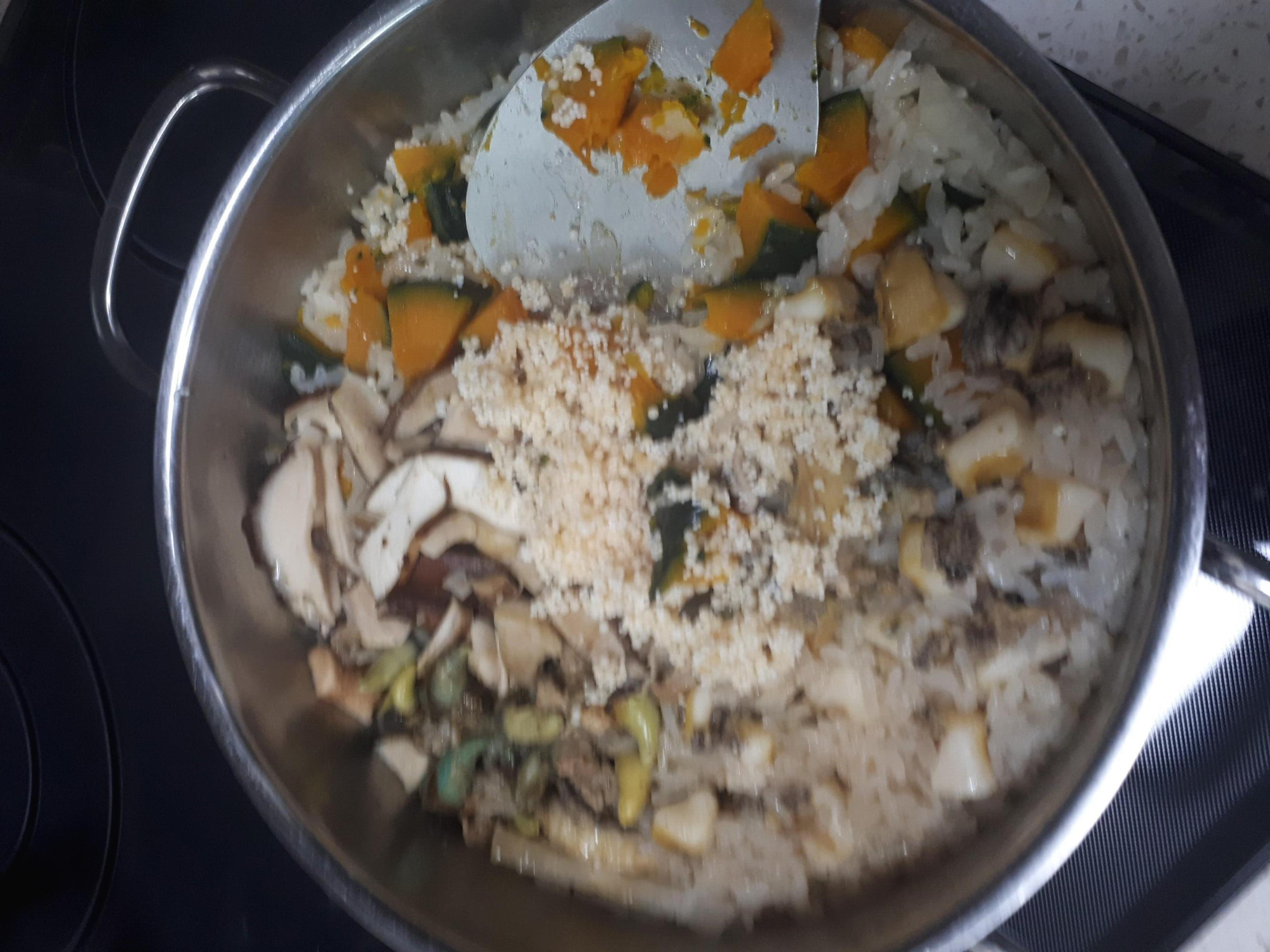 야채실에 있는 단호박을 썰고 전복을 올린 후 밥을 짓는데, 밥이 끓은 후 뜸이 들 때 날치알을 한팩 넣어 주면 맛있는 전복 영양밥이 된다.