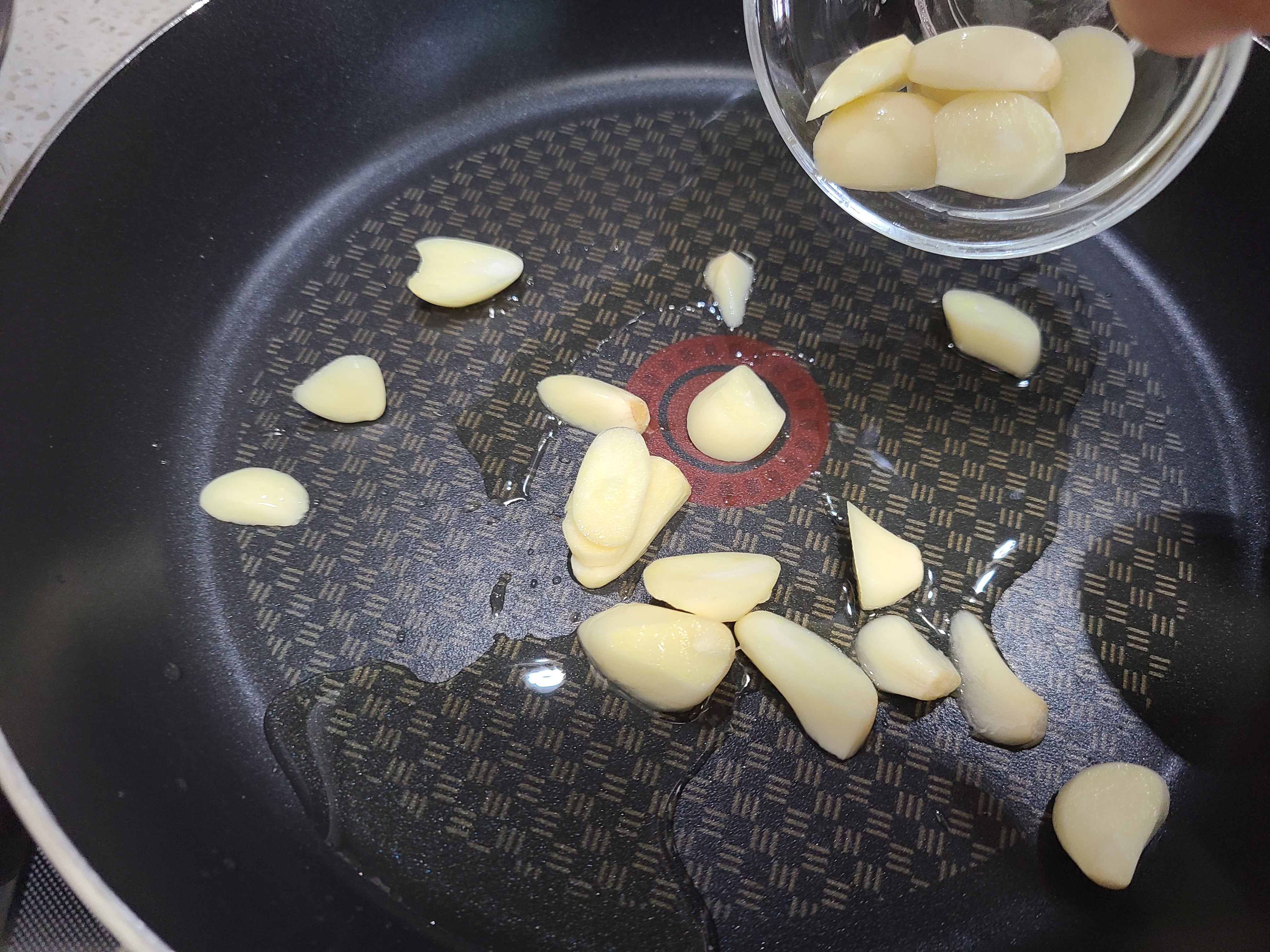 5. 달궈진 프라이팬에 식용유를 두르고 마늘을 먼저 넣고 볶아준다.