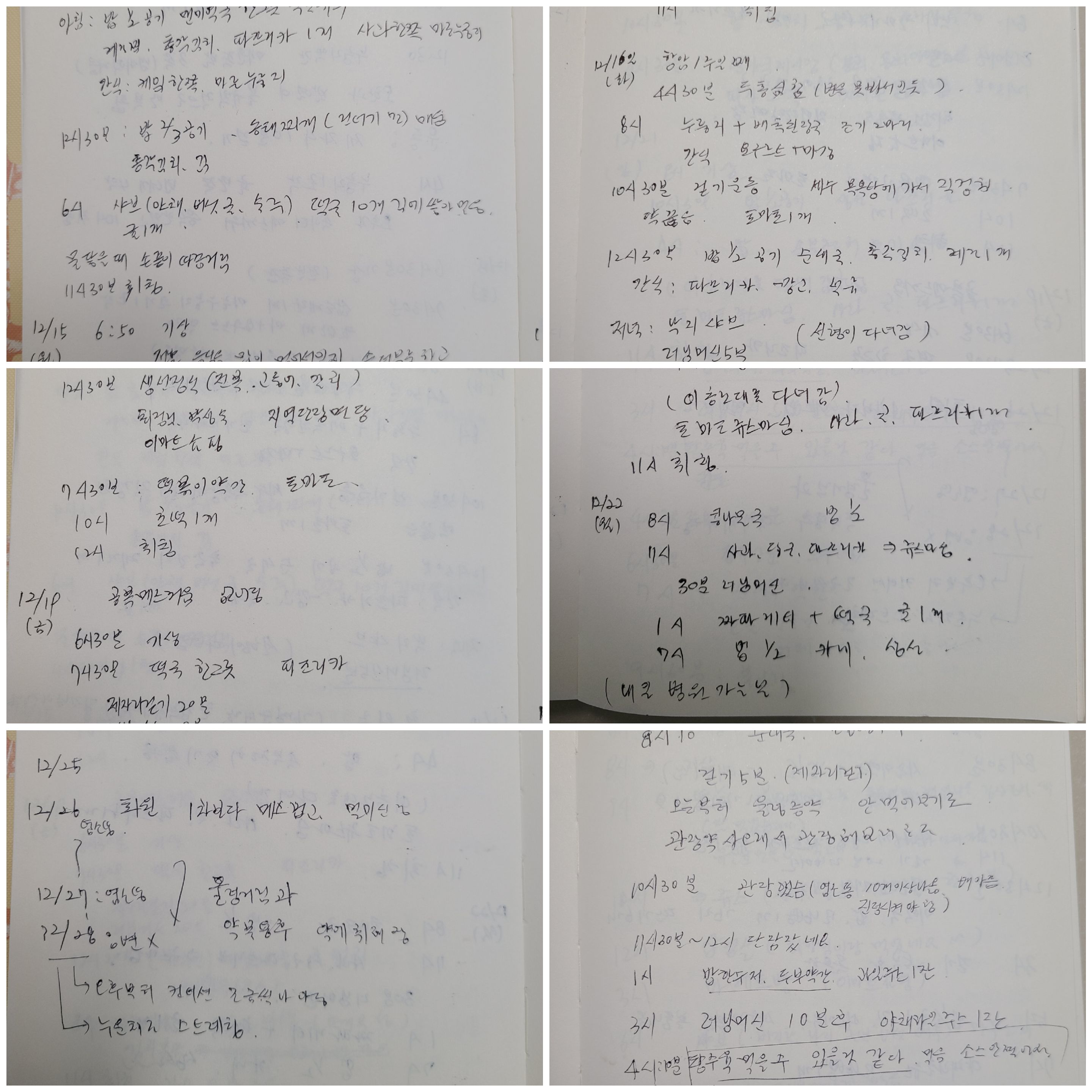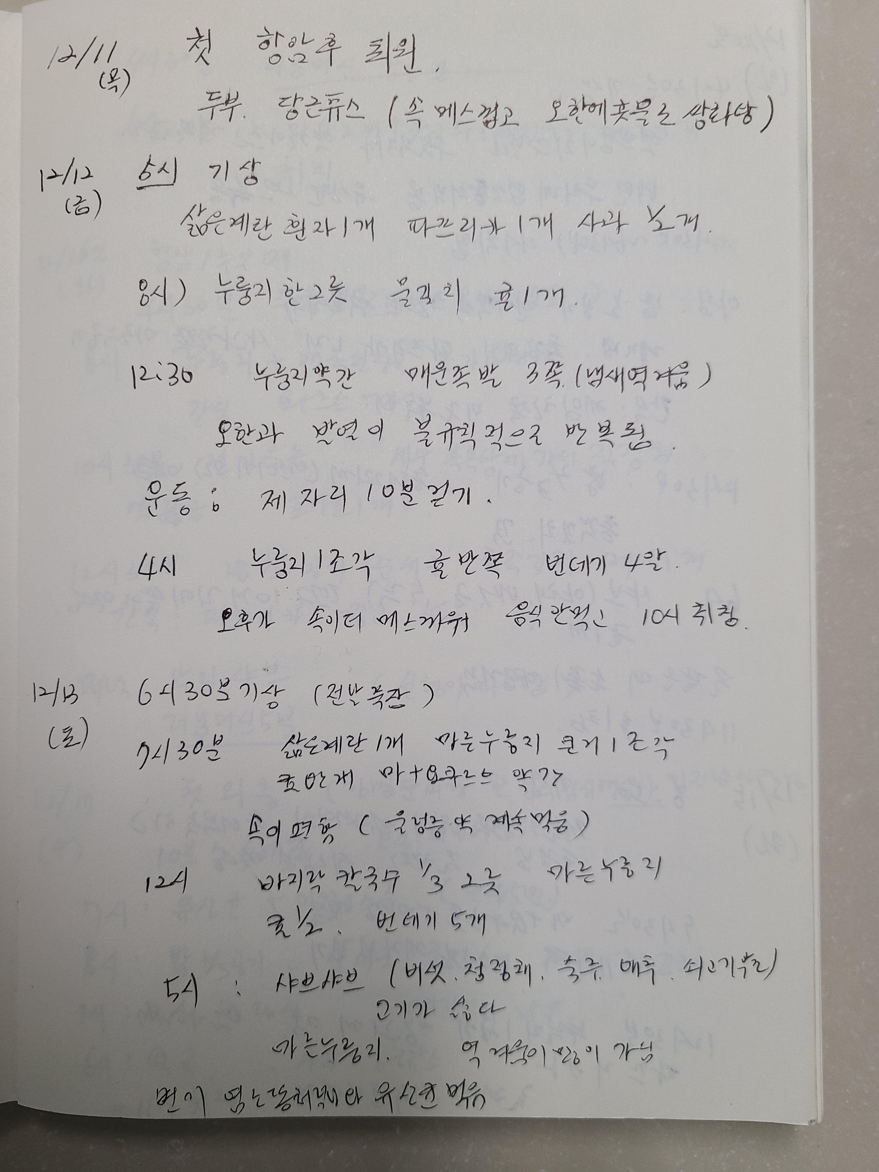 항암치료 1회 차를 끝내고 나서부터 딸의 권유로 노트에 적기 시작했다. 퇴원 후 내가 어떻게 지내는지를 직접 보지 못하니 기록을 남기게 해서 살펴보려고 한다고 했다. 항암치료 후 몸의 반응과 먹은 음식, 그리고 운동 등 모든 것을 기록하라고 했다. 그래야 가족들이 내가 무엇을 먹을 수 있는지도 알고 참고할 수 있다고 했다.