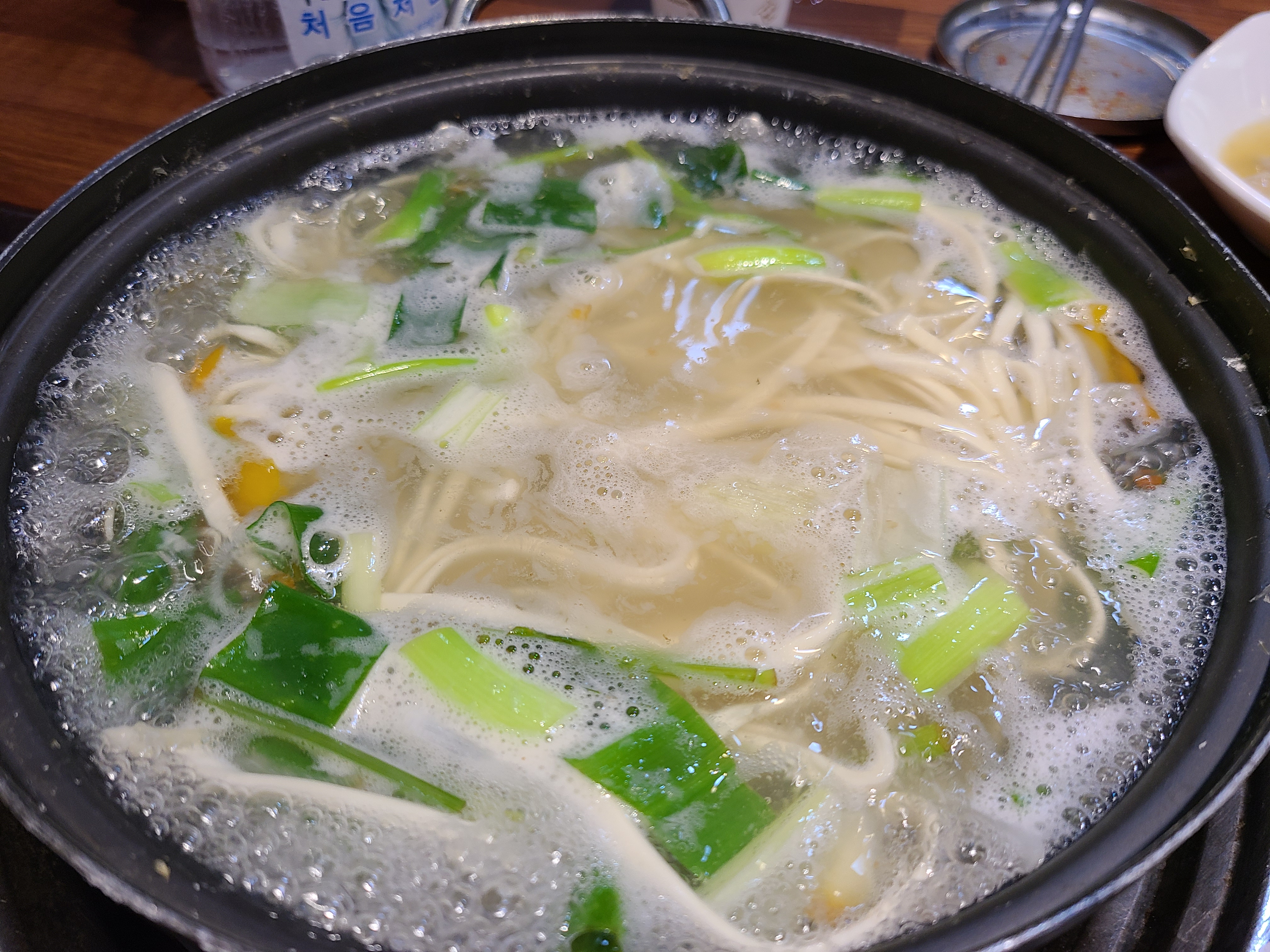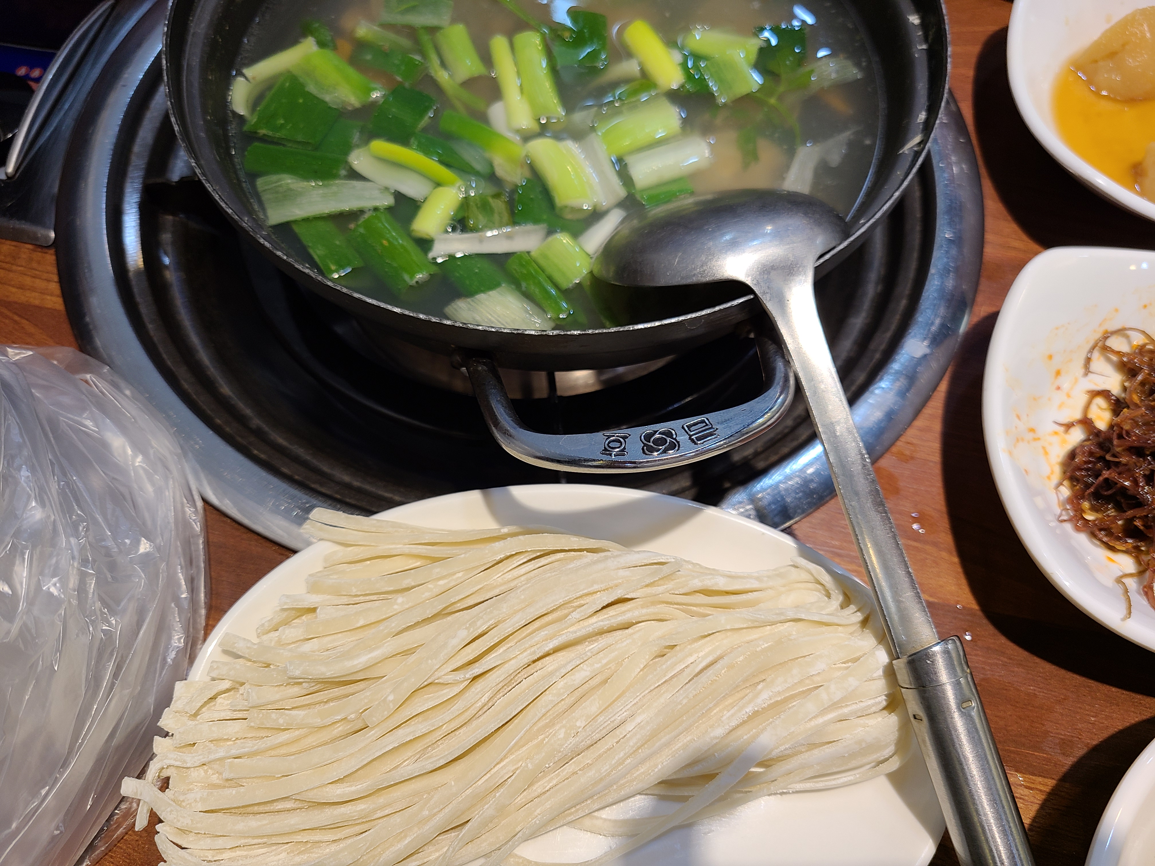 칼국수 사리를 주문해서 바지락탕에 넣고 끓여 먹으니 맛이 좋았다. 계산할 때 보니 바지락탕에 칼국수가 기본으로 나오는 거라고 했다.