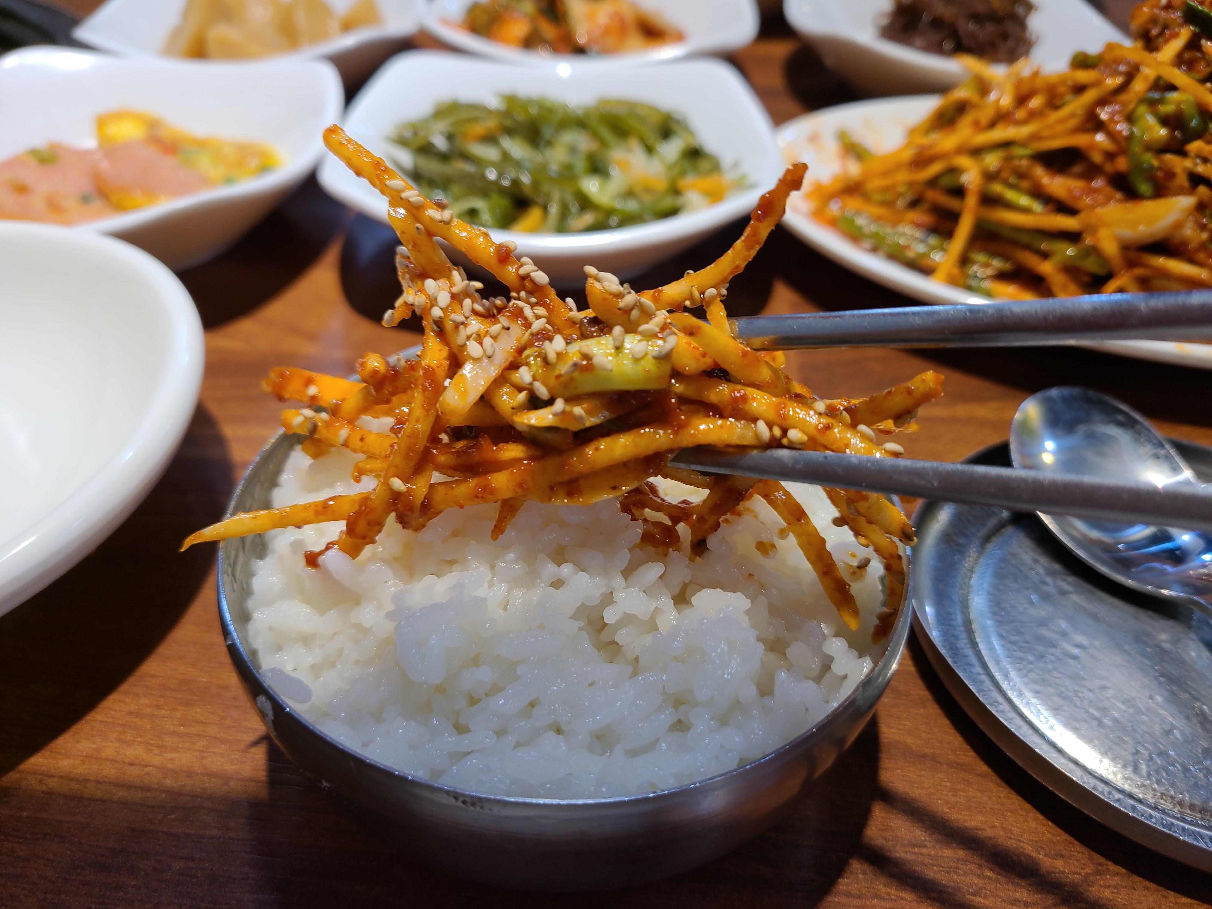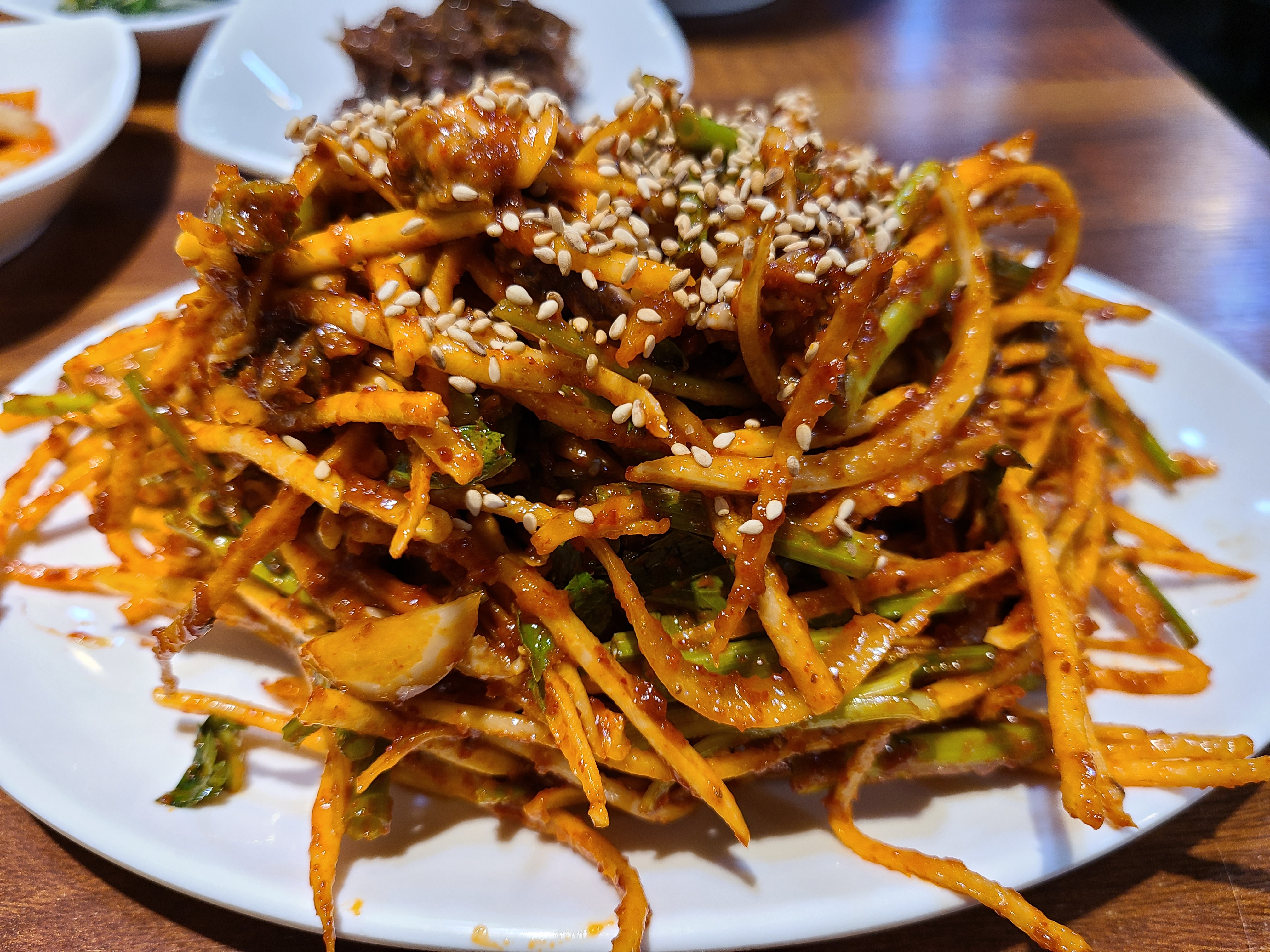 꼬막회무침이 나왔는데 담겨 나온 모양에서 먹음직스러워 보였다. 꼬막회무침을 한입 먹어보니 강진에서 먹어본 바지락 회무침과는 또 다른 맛이었는데, 다른 지역에서 먹어본 꼬막회무침보다 훨씬 맛이 있다. 꼬막회무침에 무채가 절이지 않고 생으로 들어 있는데 씹히는 식감이 너무 좋았다.