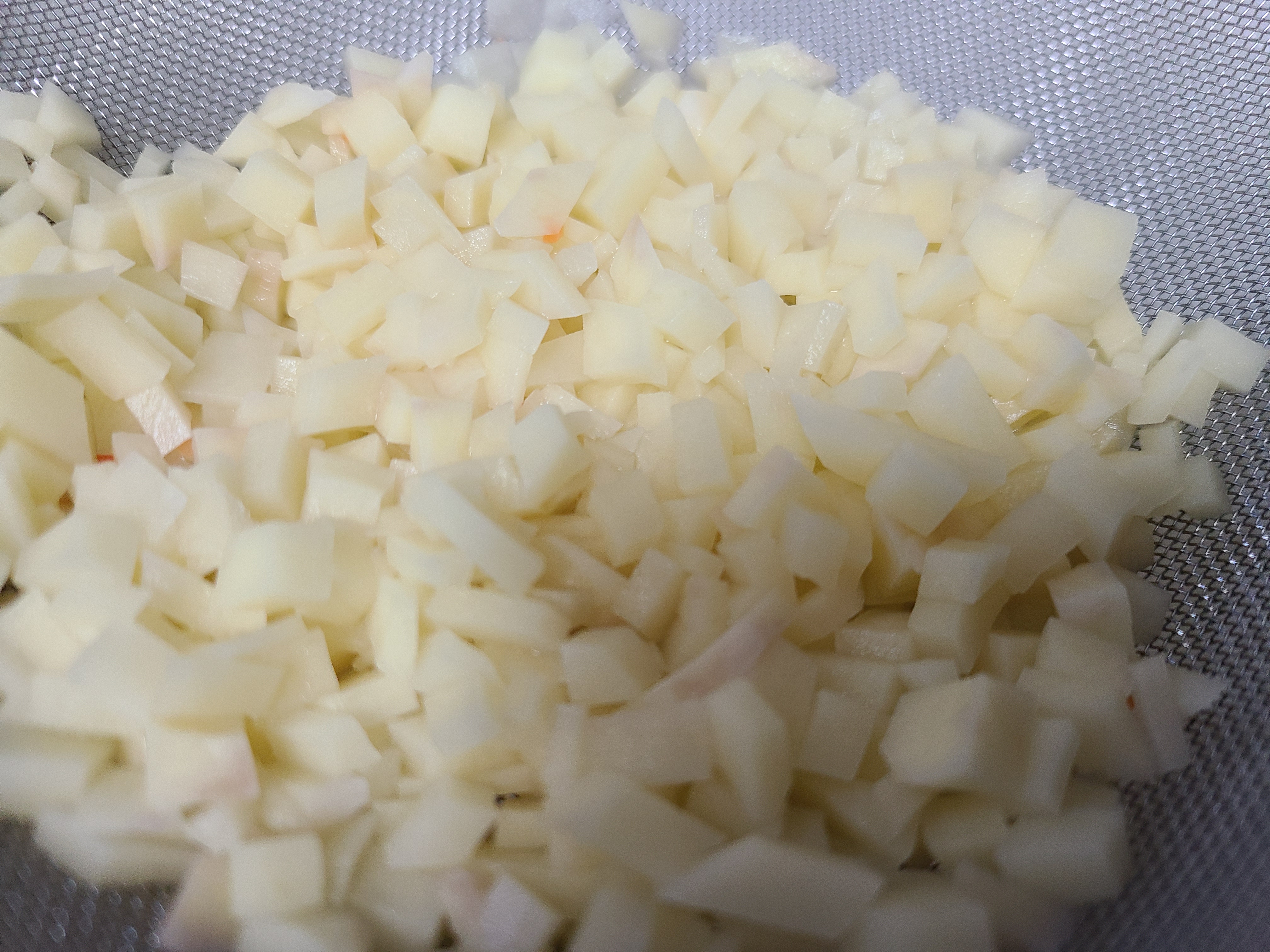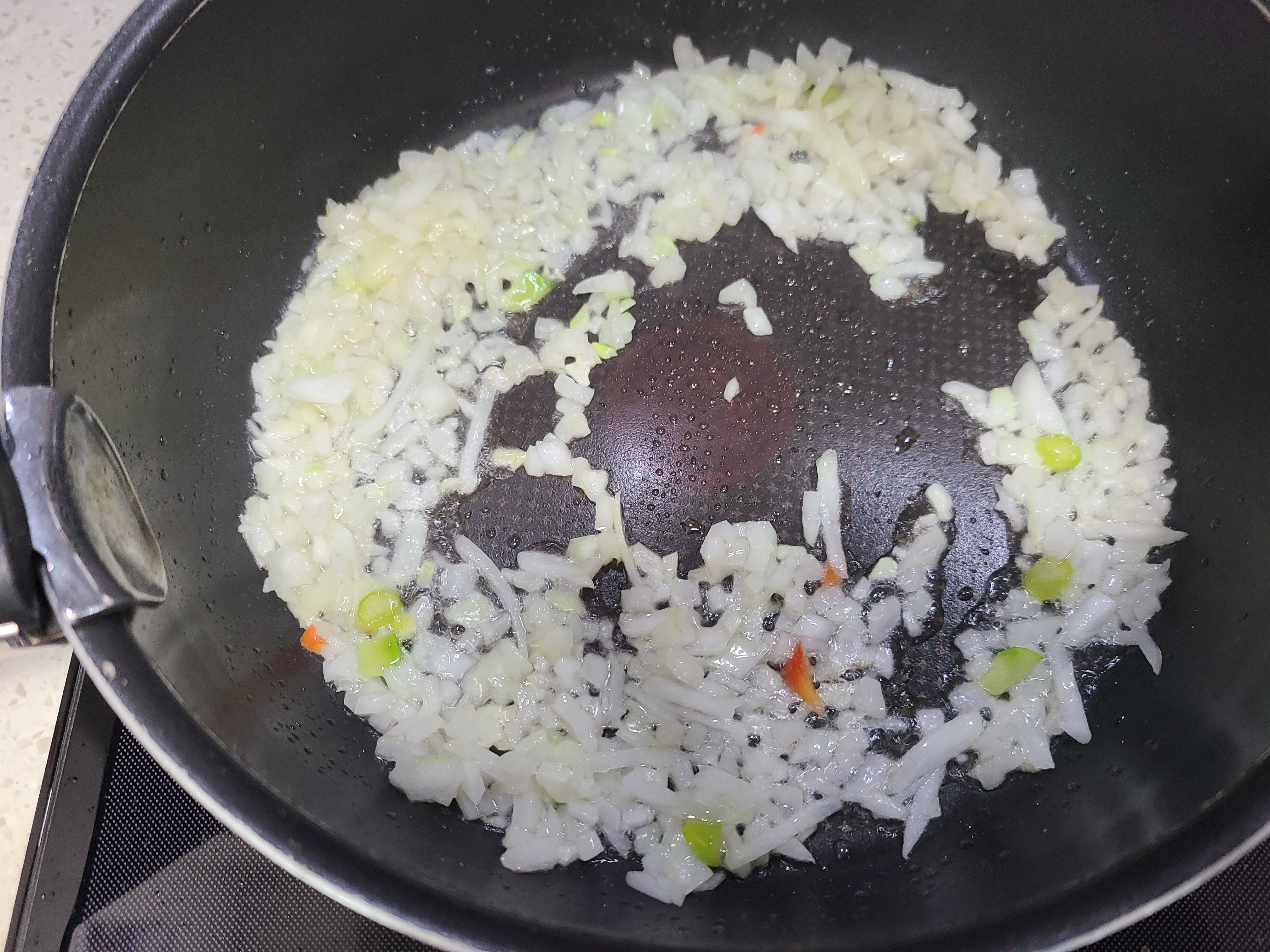 2. 프라이팬을 달궈준 후 양파를 먼저 볶다가 감자를 넣고 볶아준다. 소금 한 꼬집을 넣어준다.