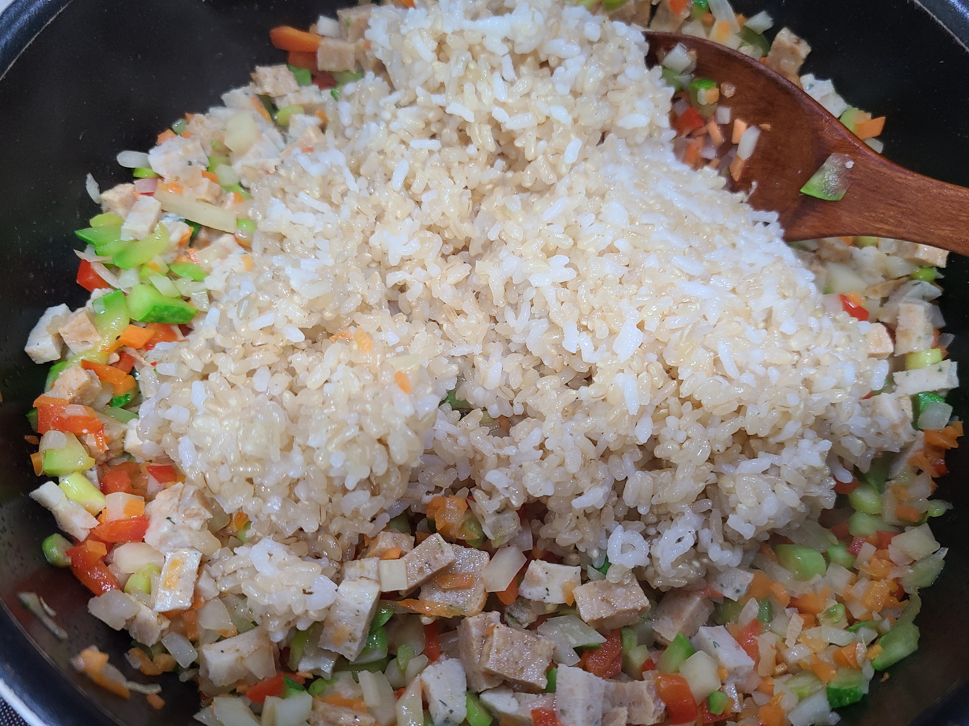 5. 불을 약하게 줄인 후 현미 완두콩밥 2 공기를 전자레인지에 따뜻하게 데운 후 넣어준다.