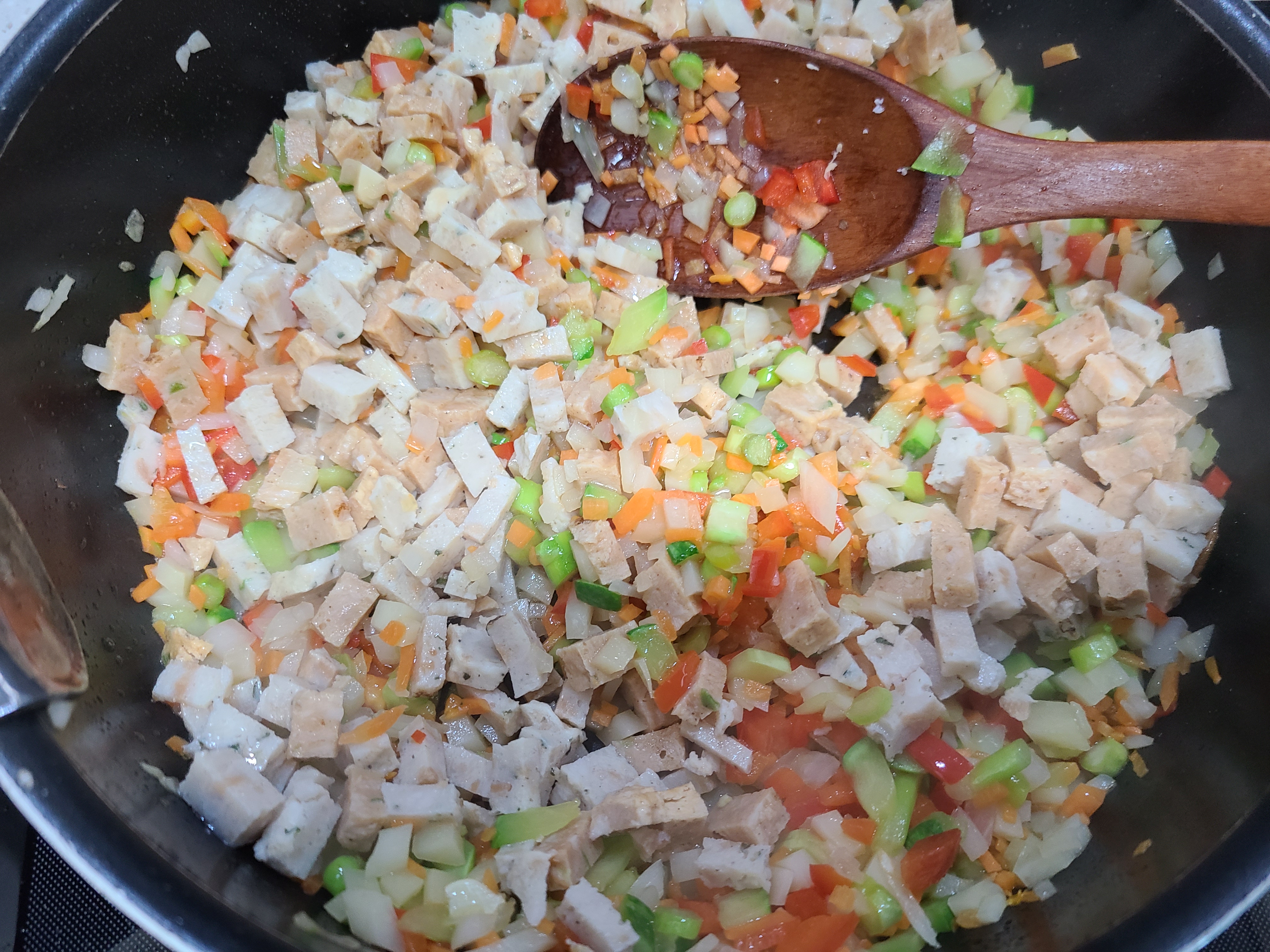 4. 야채가 숨이 죽어 갈 때 닭가슴살 스테이크 썰어놓은 것을 넣고 볶아준다.