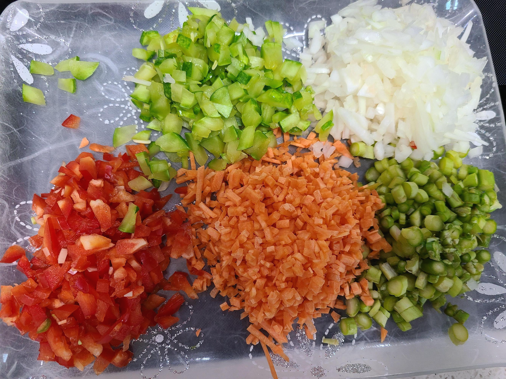 양파, 파프리카, 당근, 아스파라거스를 잘게 썰어준다.