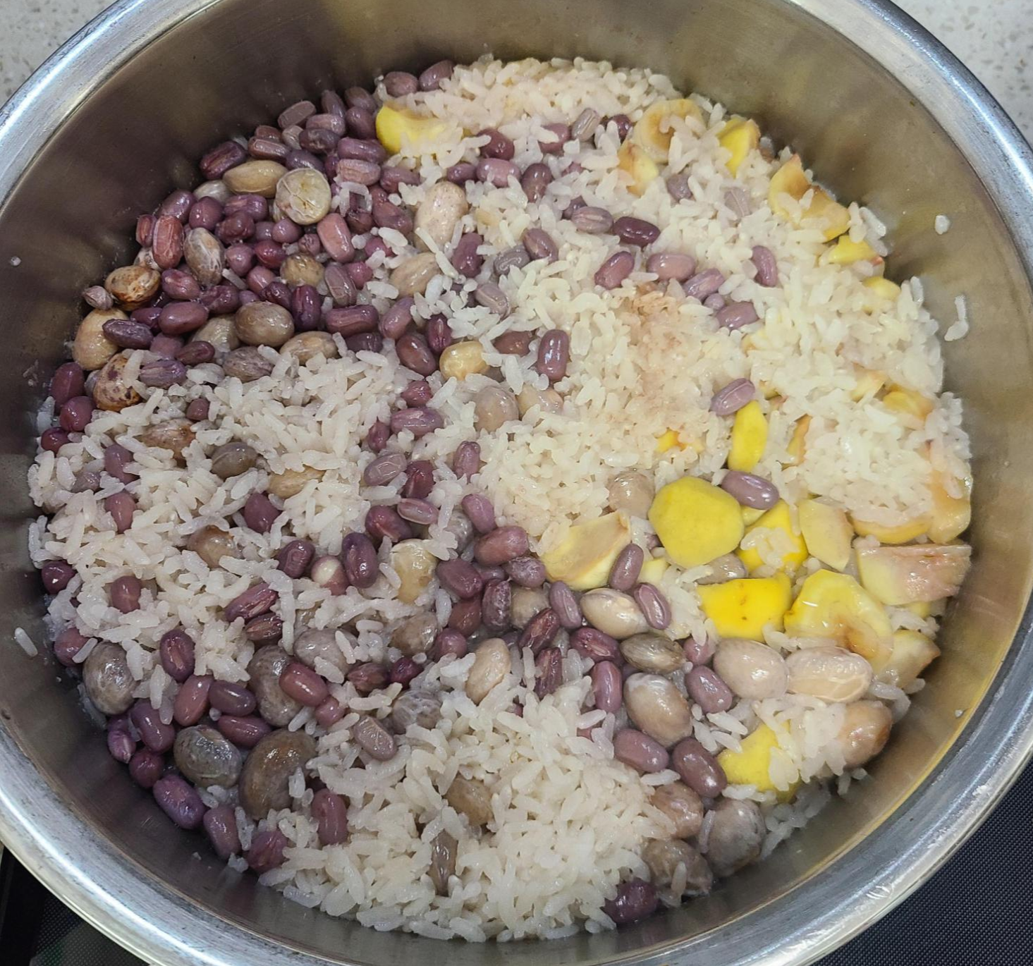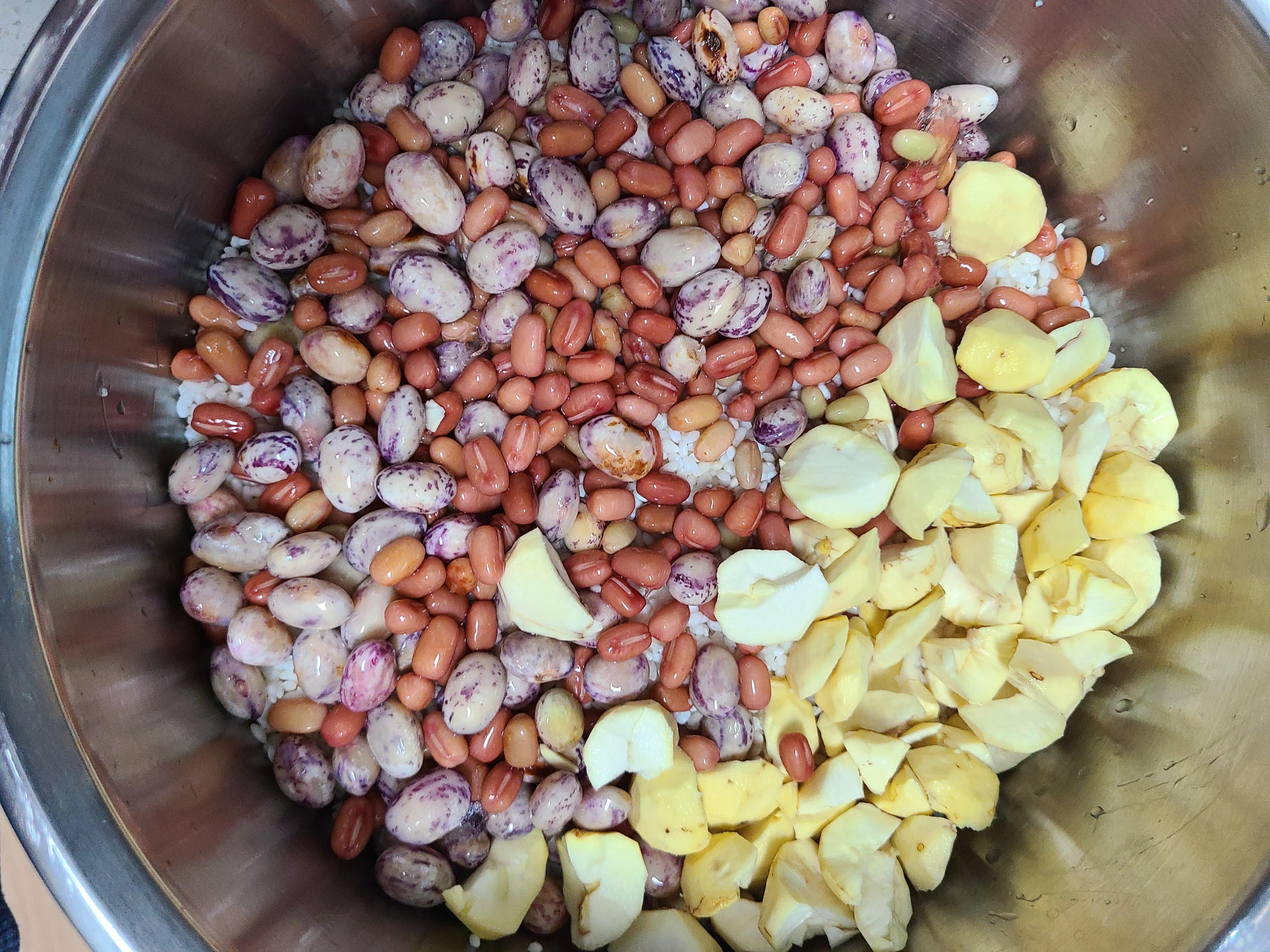불린 찹쌀을 먼저 넣어주고 팥과 호랑이콩을 위에 얹어준다. 밤은 4등분으로 쪼개어서 얹어 준다.