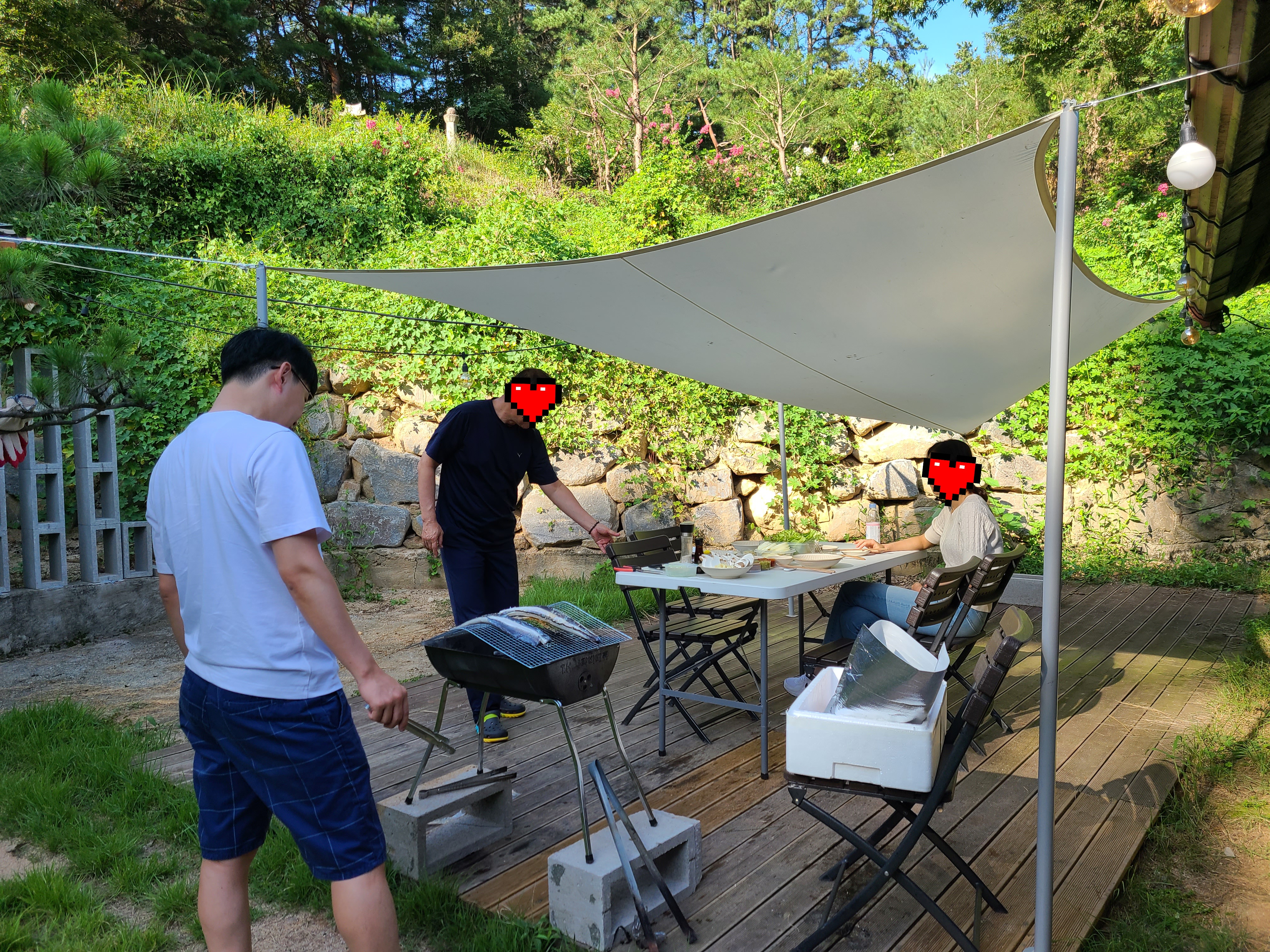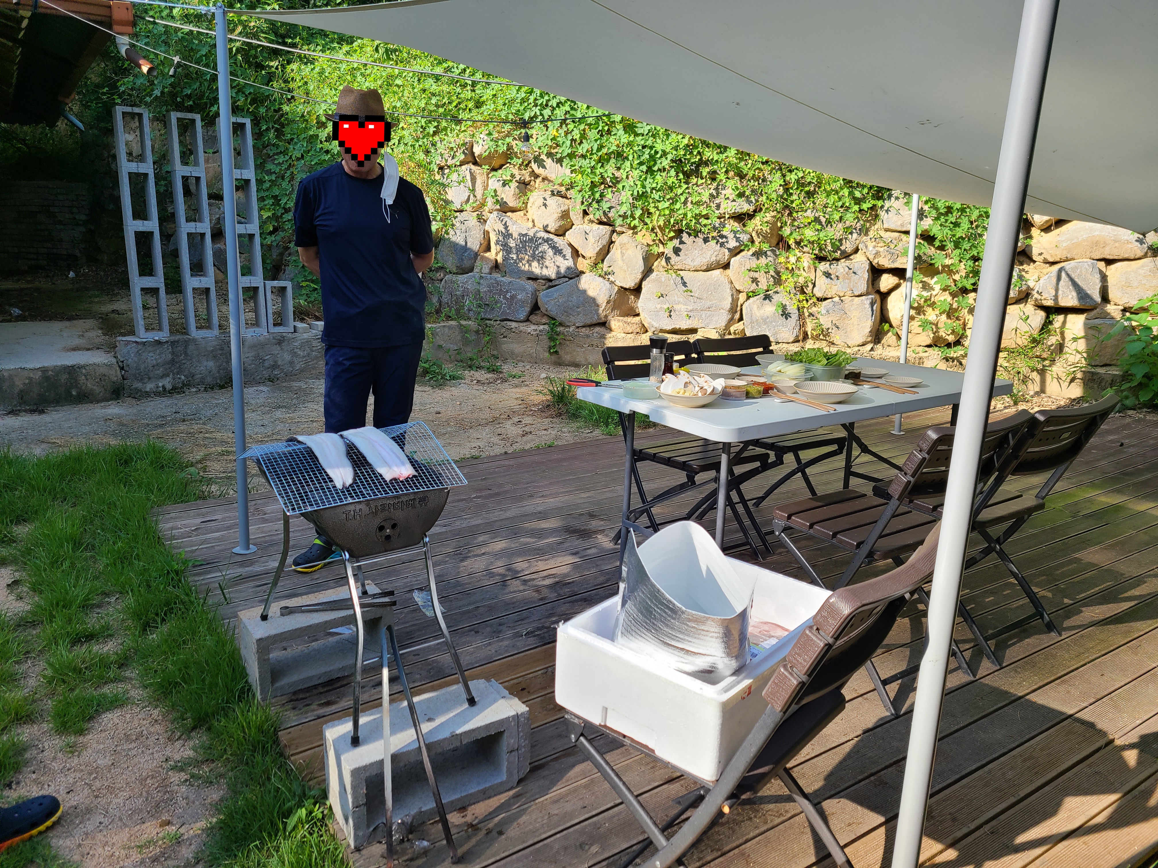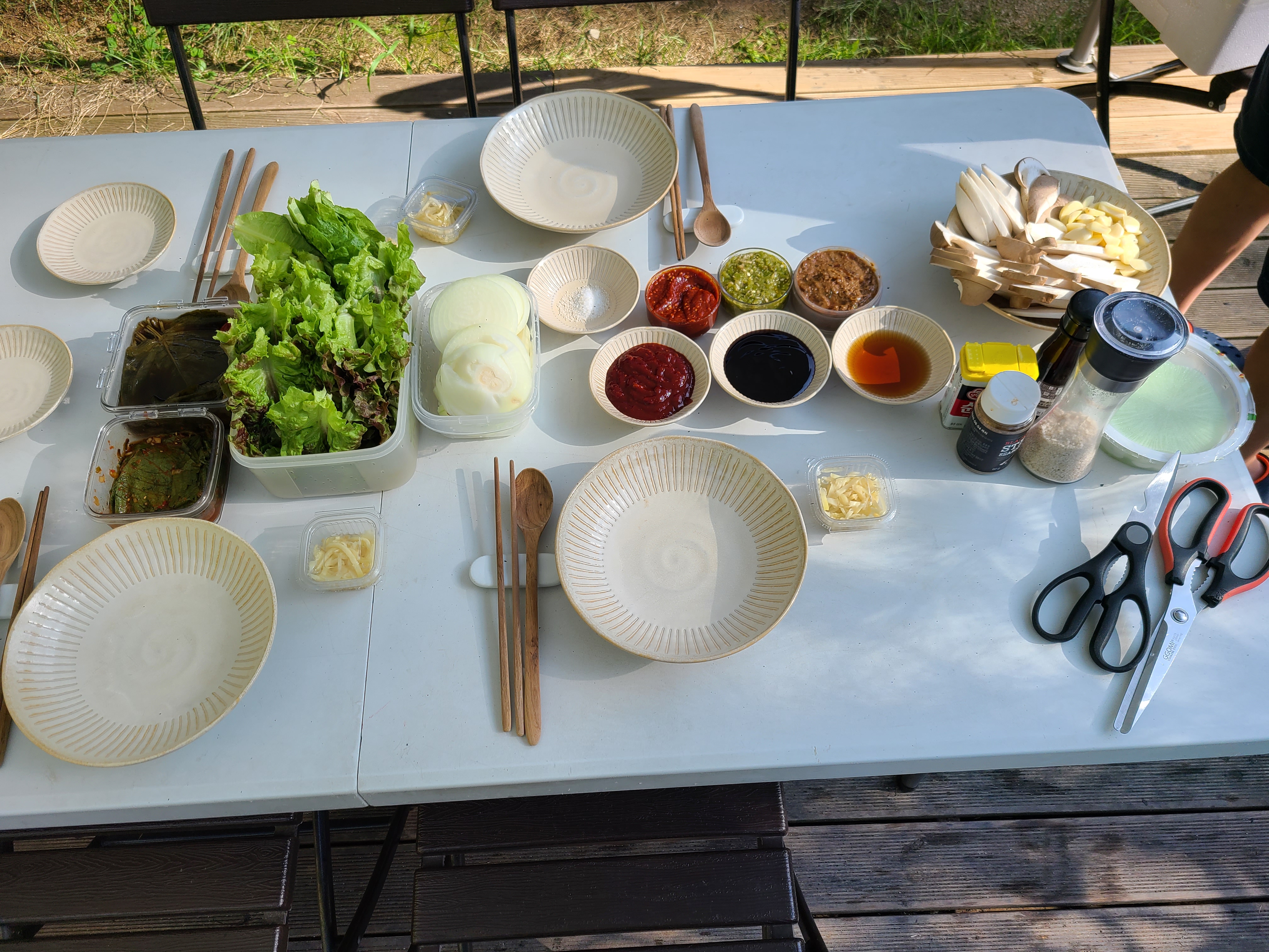 집에서 준비해온 야채와 버섯 양념장 그리고 깻잎 장아찌까지 바베큐장에 있는 식탁에 차려놓았다.