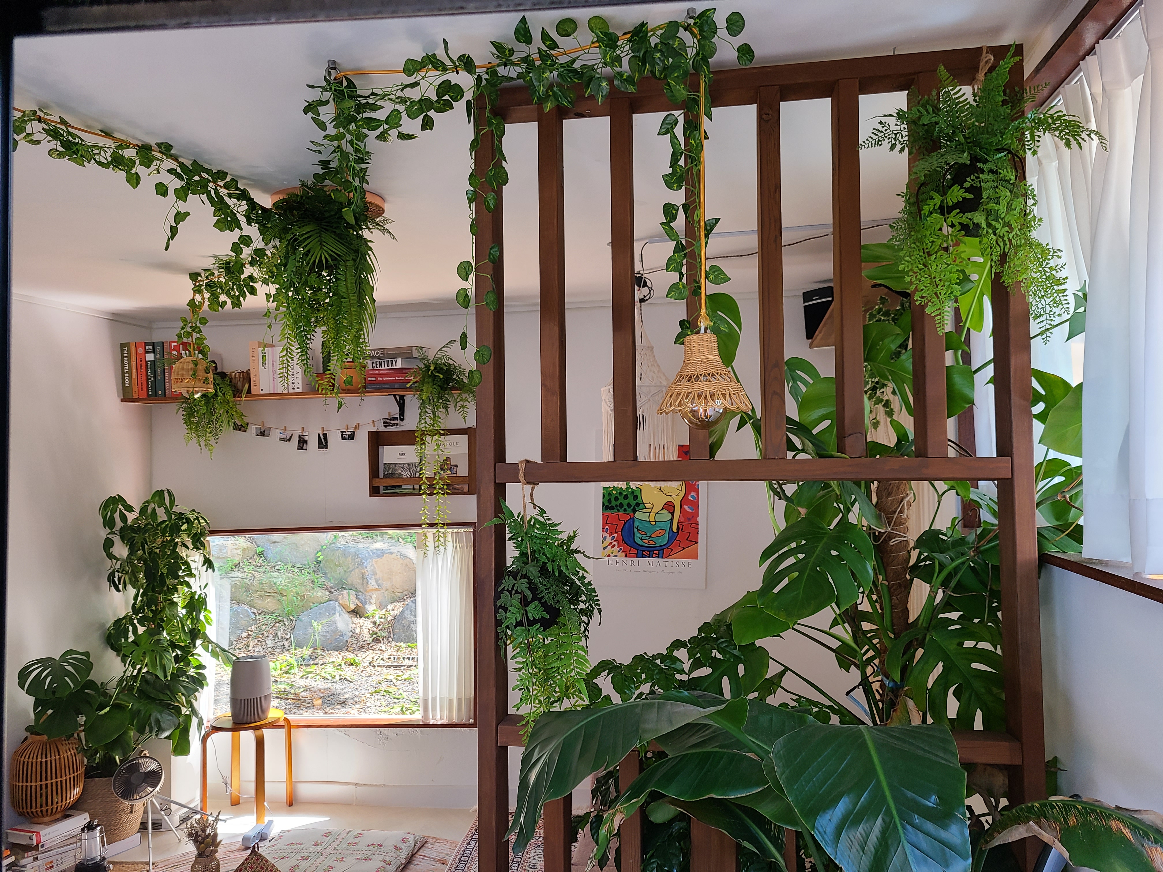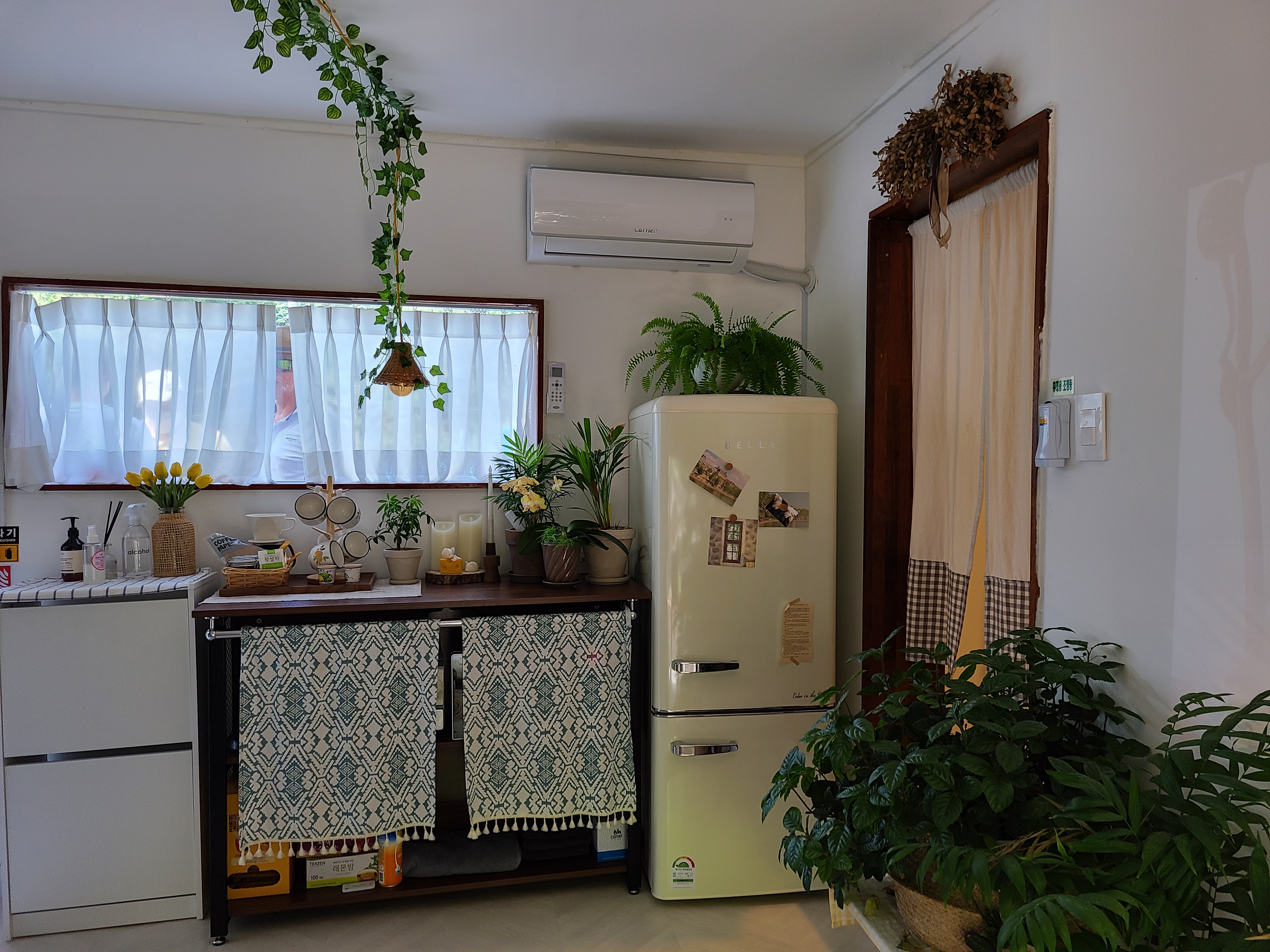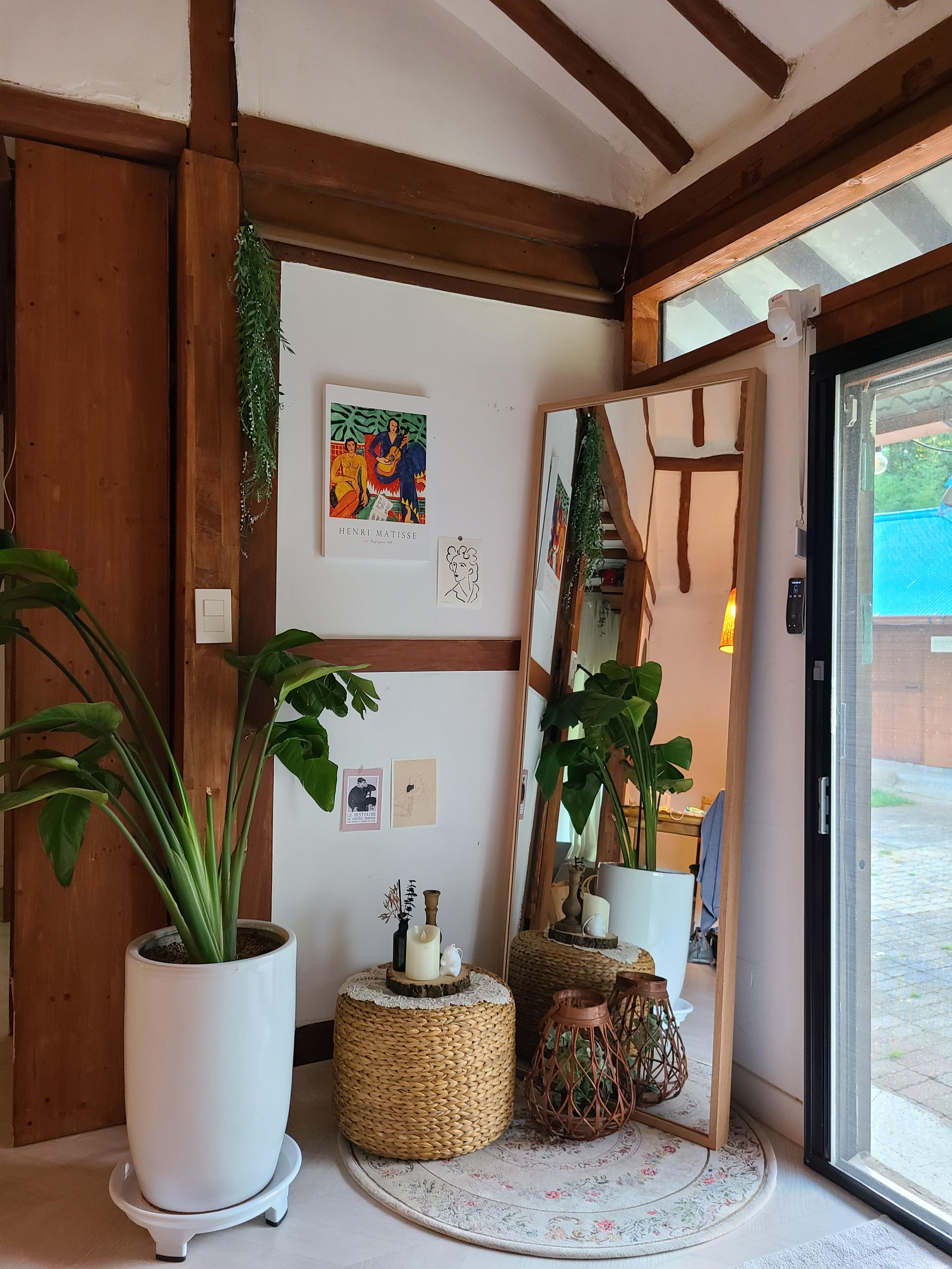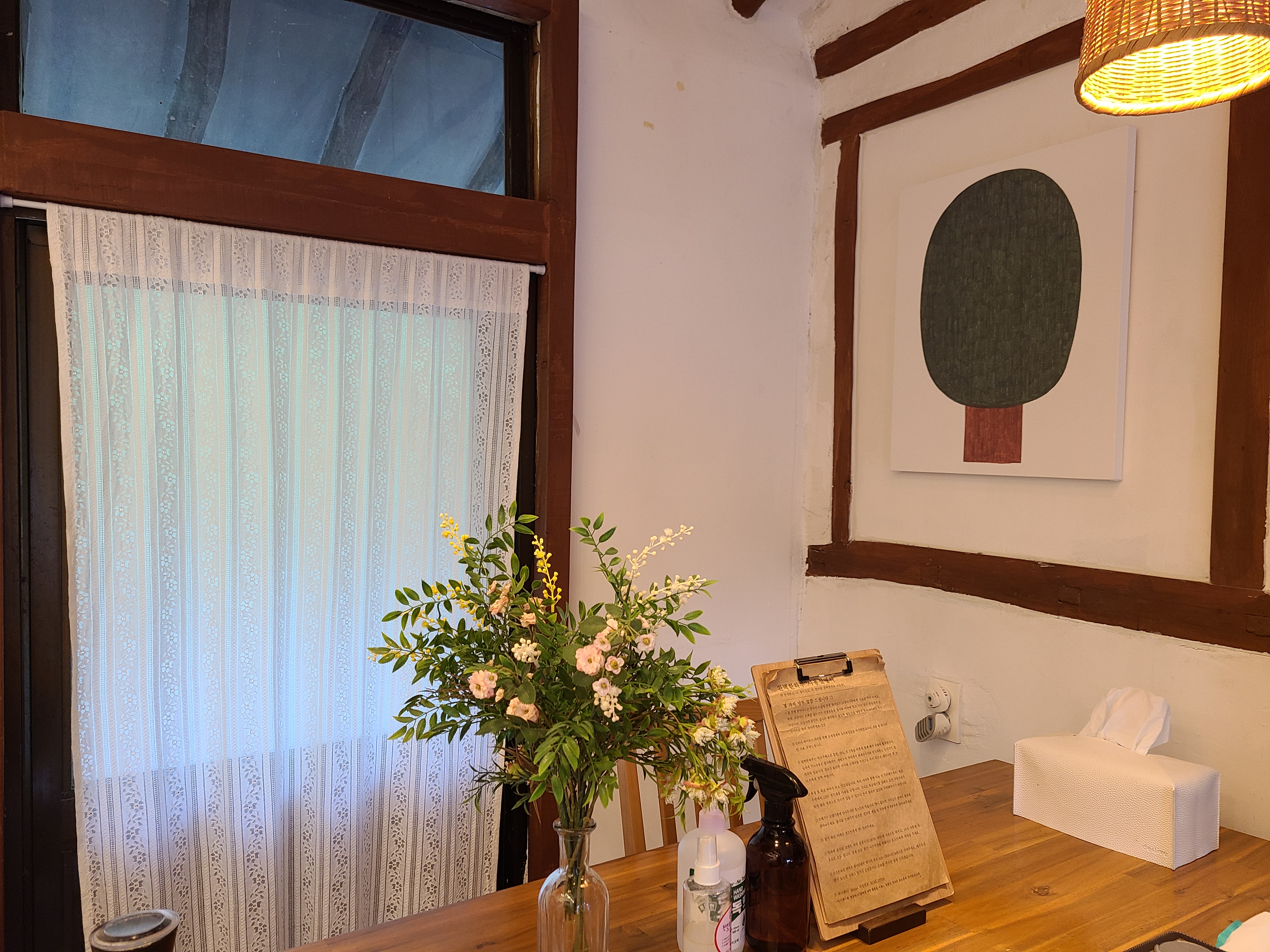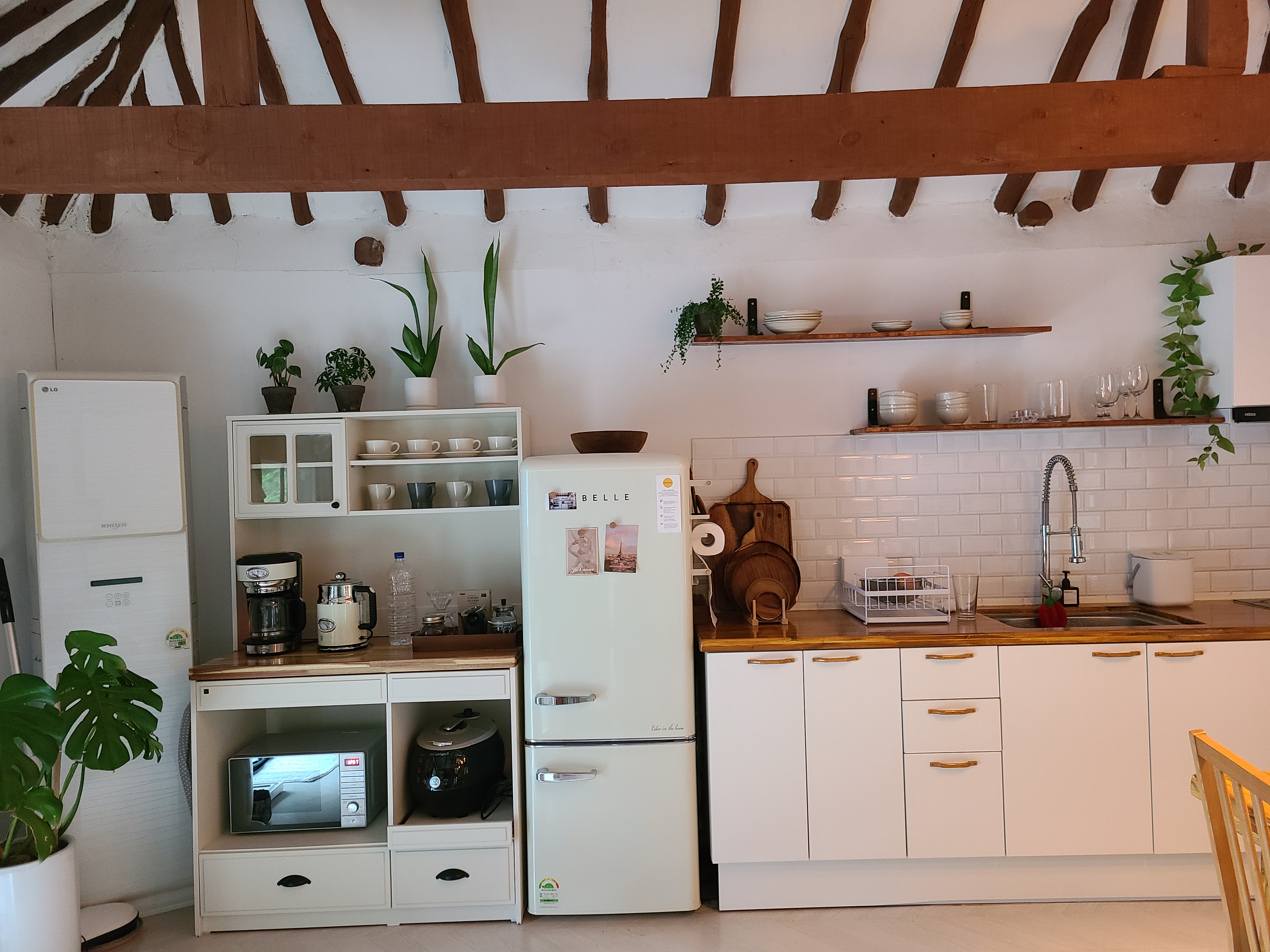 집 천정의 석가래를 그대로 두고 흰색으로 천정과 벽을 칠한 후 나무색을 그대로 바른 것이 정갈하고 차분해 보인다. 집안 곳곳에 놓인 화분과 식탁 위 조화가 서로 너무 잘 어울렸다.