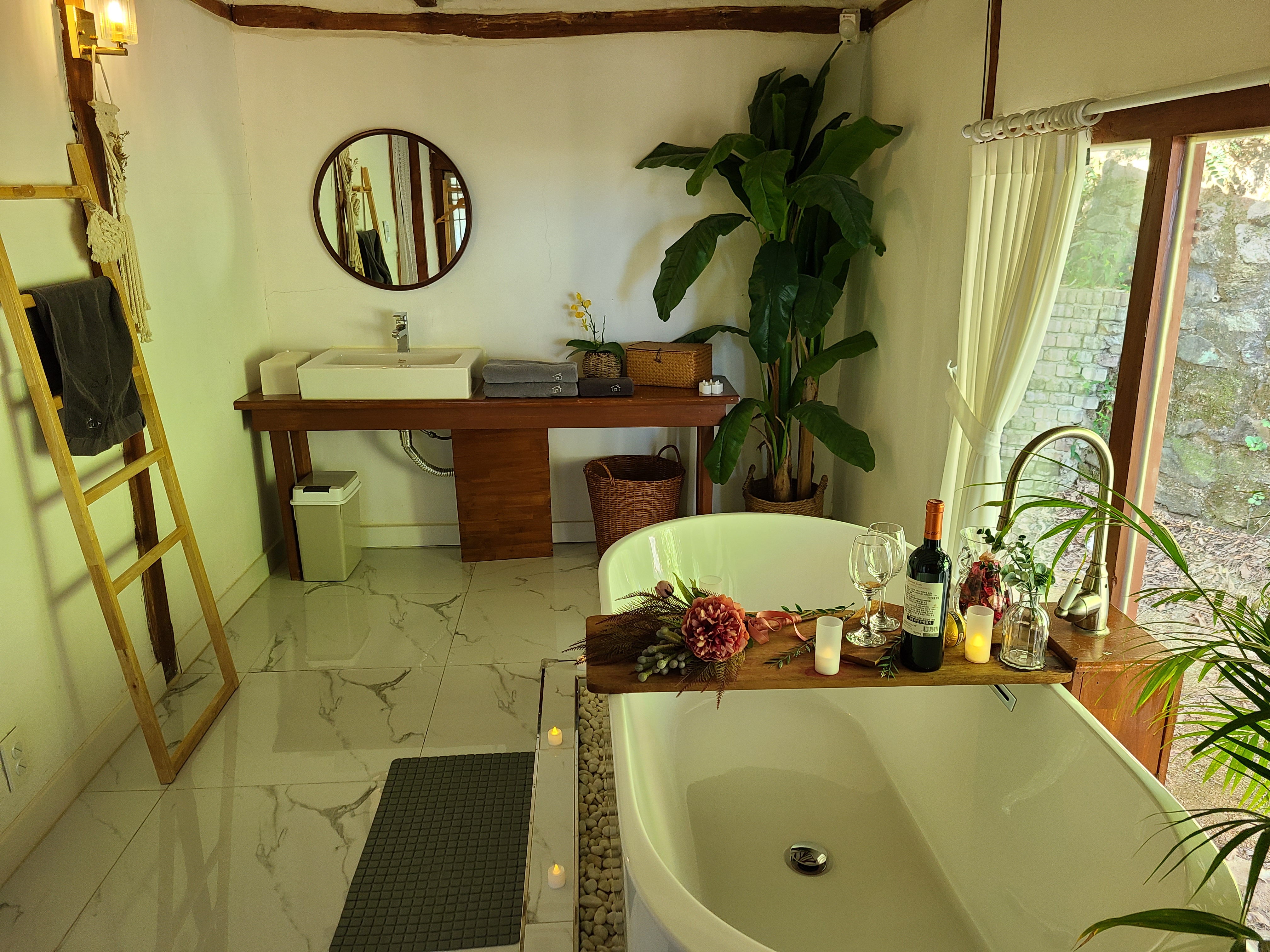 침실을 지나쳐서 정면으로 들어가니 커다란 욕 조위에 와인과 컵이 놓여있었다.(추가 옵션임) 욕조에 물을 받아 거품목욕을 하며 와인을 즐길 수 있게 해 놓았다.