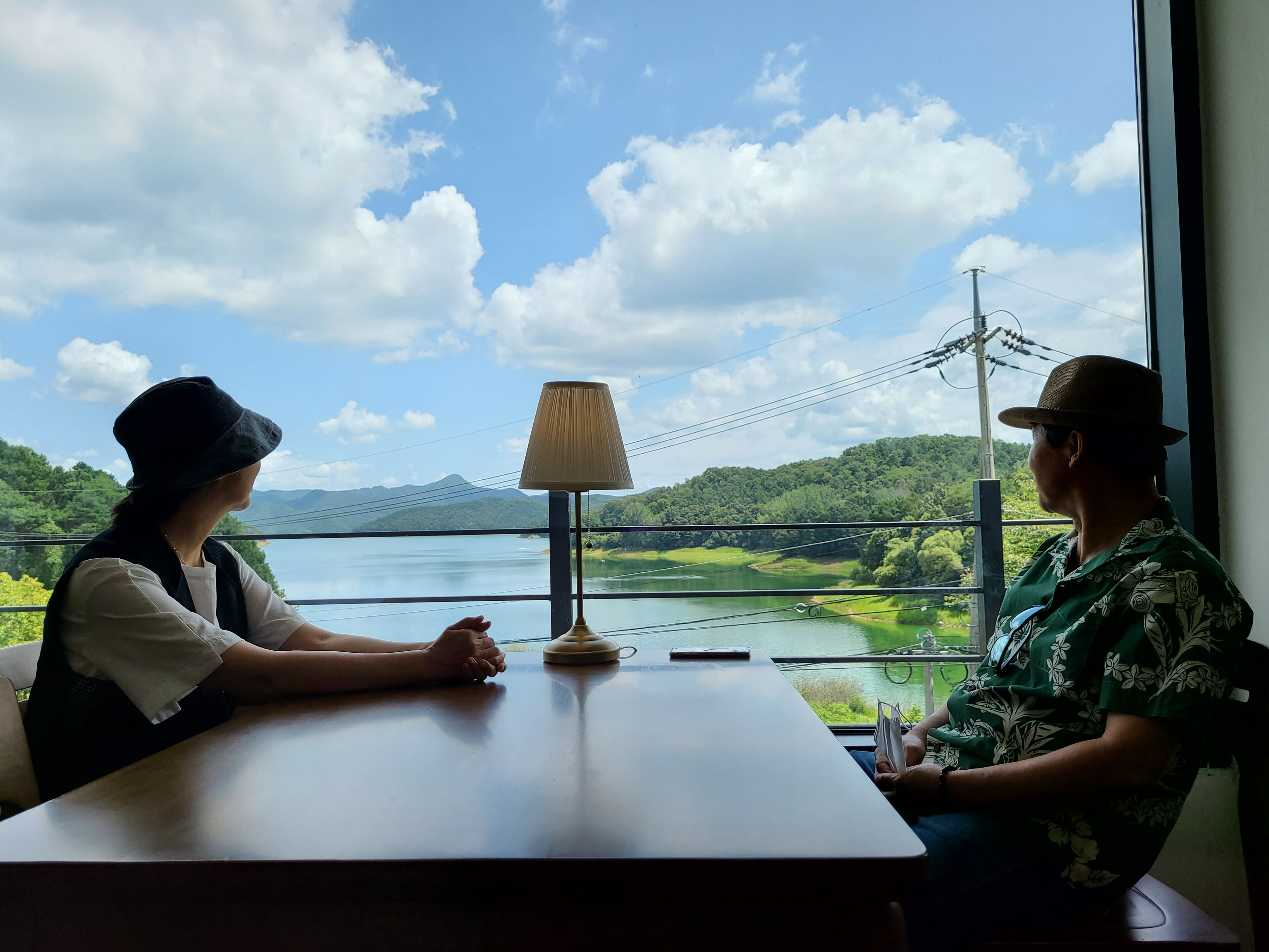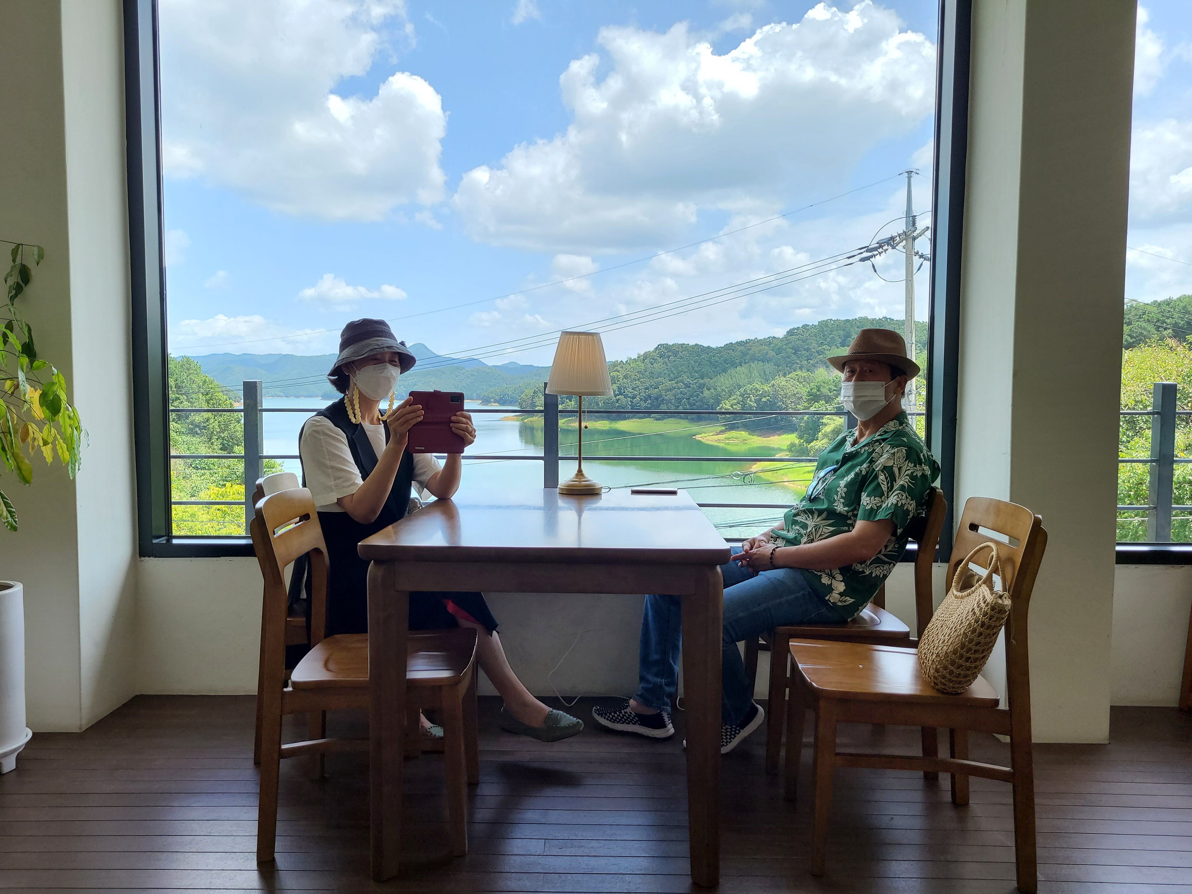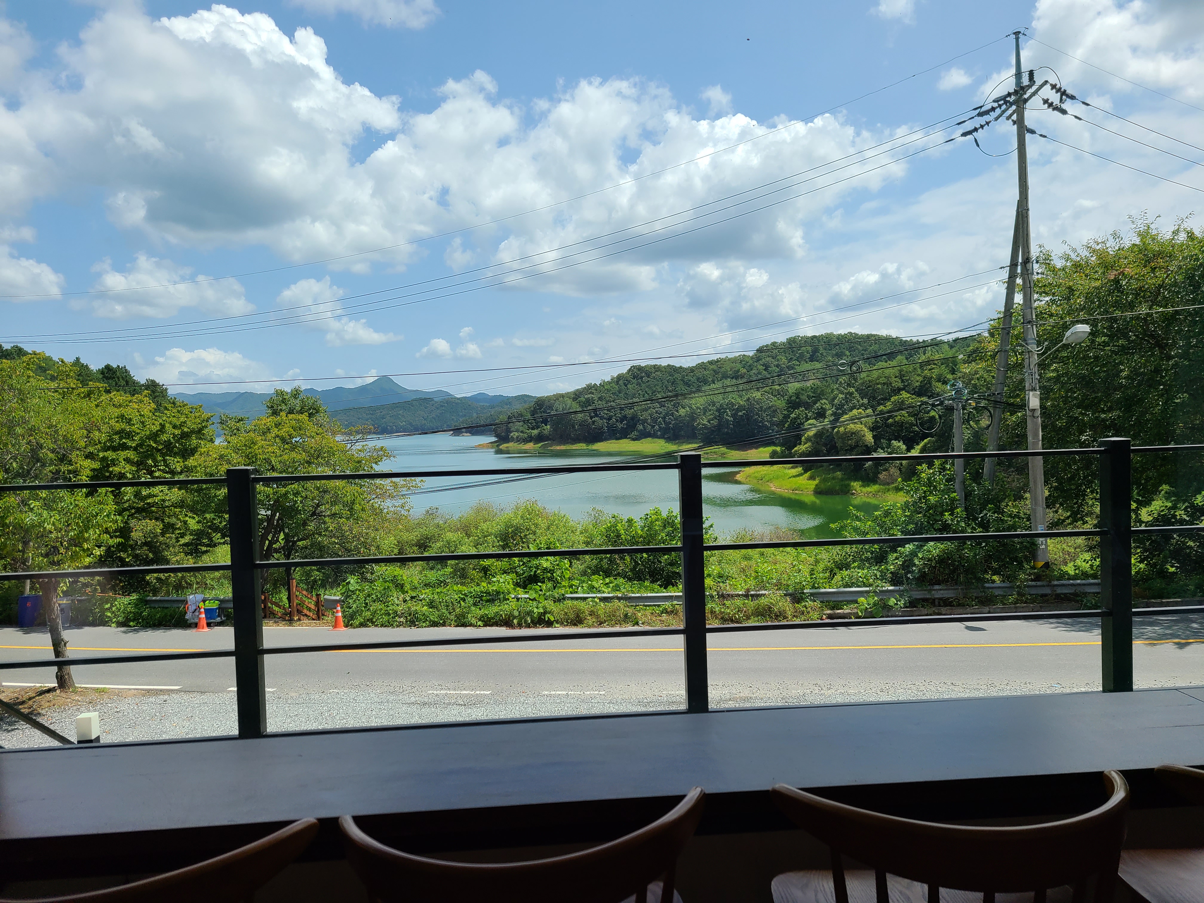 삼삼 카페 2층에서 커다란 창으로 대청호를 바라보는 모습이 너무 좋았다.