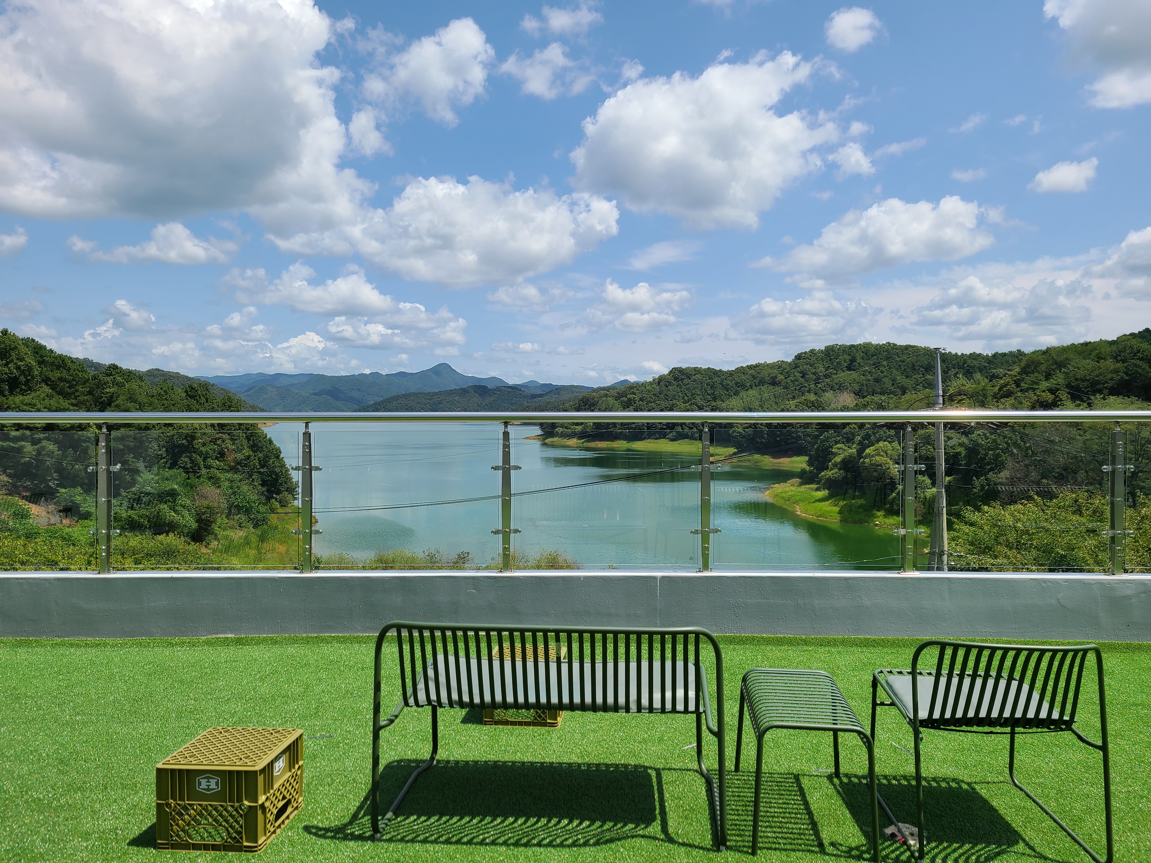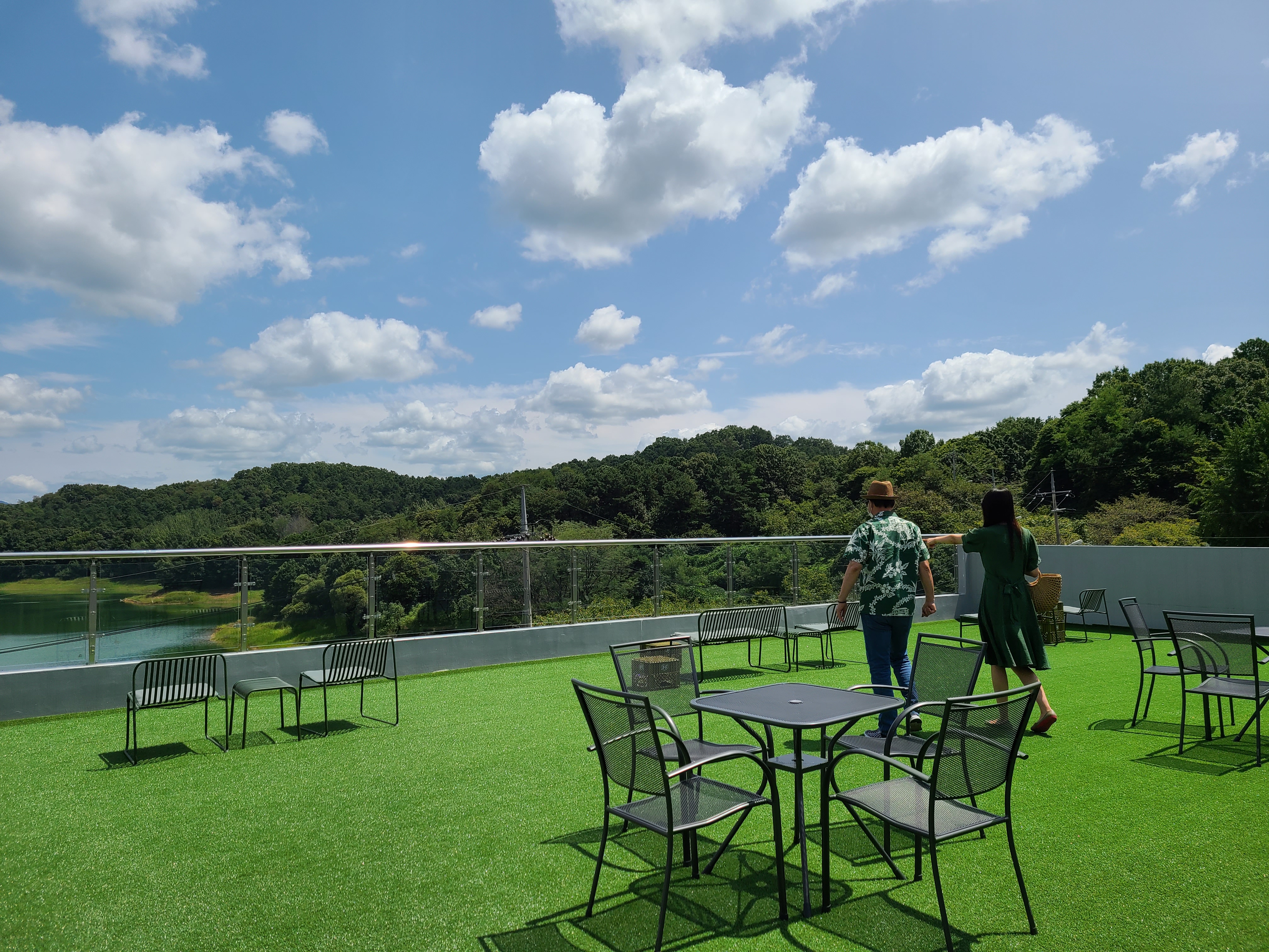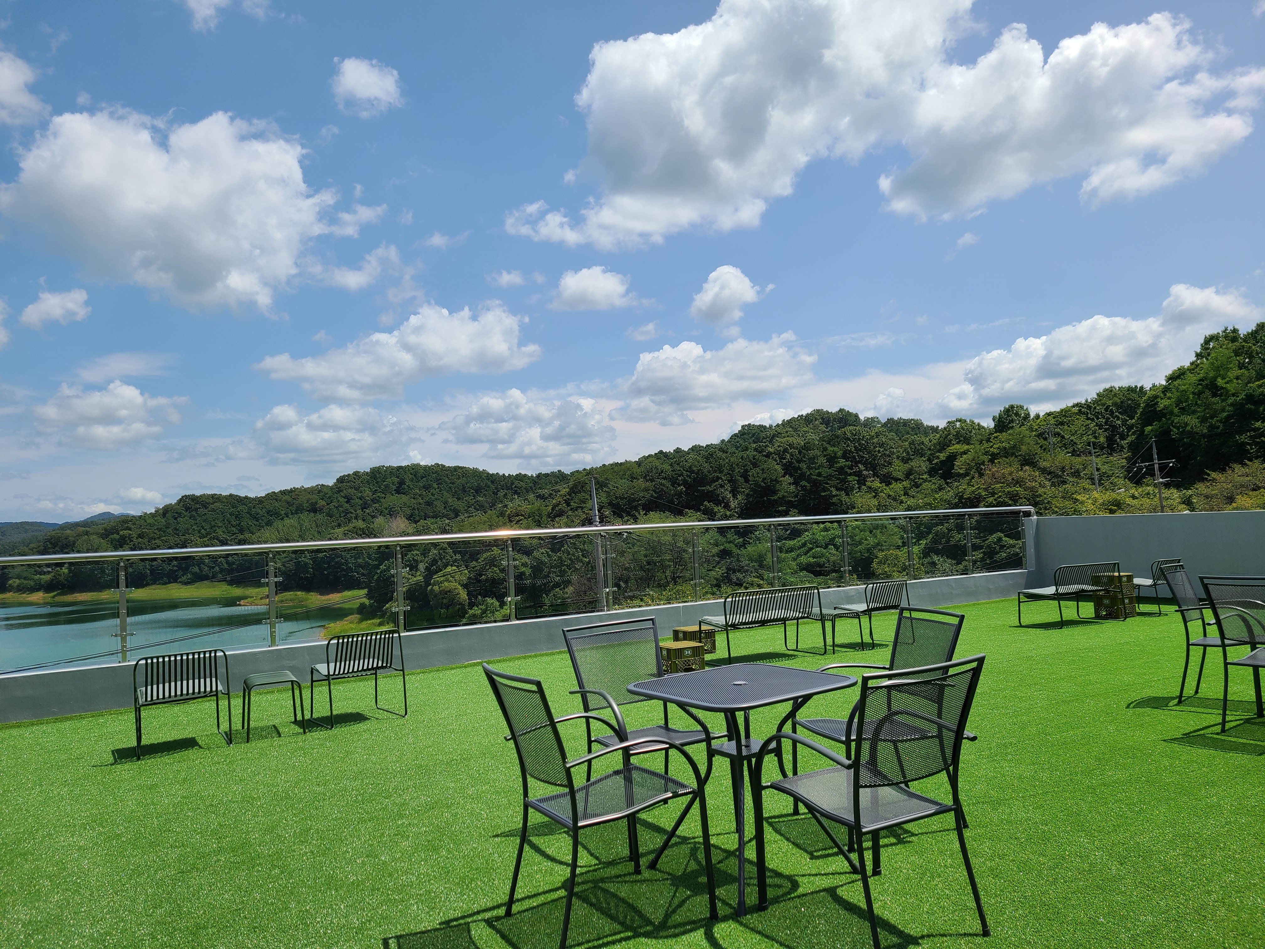 3층에는 인조잔디가 깔려있고 그위에 철재 테이블이 놓여있다. 날씨가 더워서인지 앉아있는 사람이 없었다.