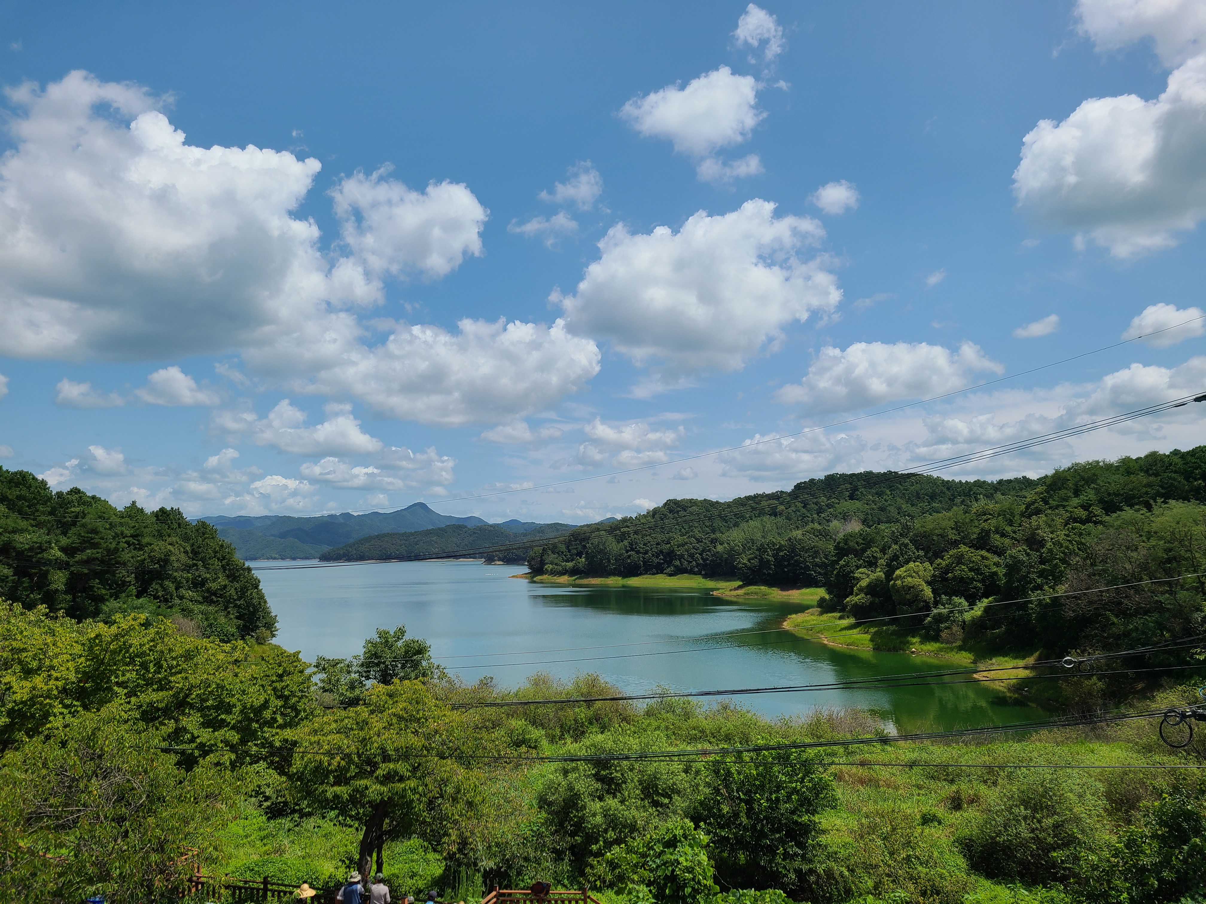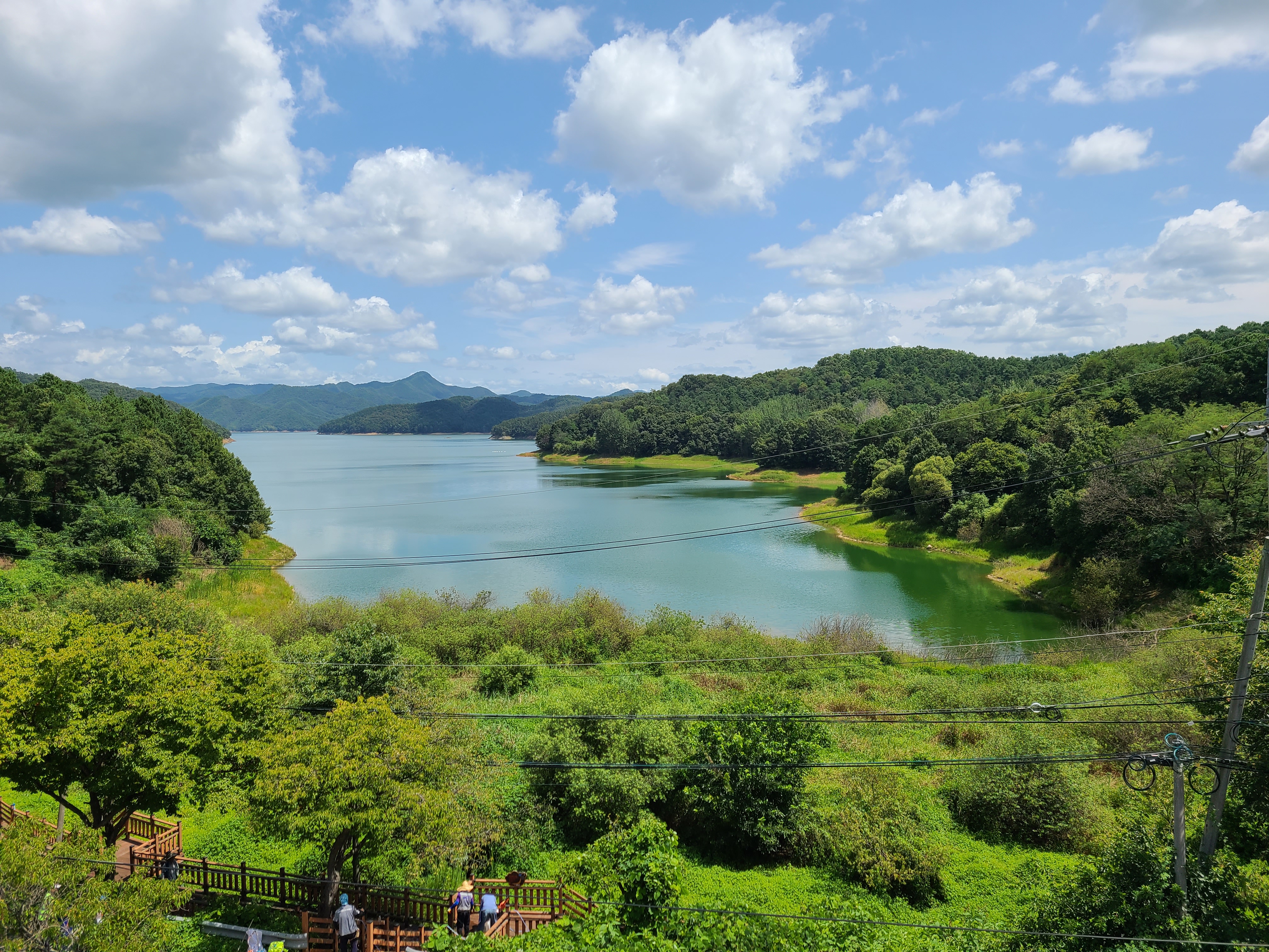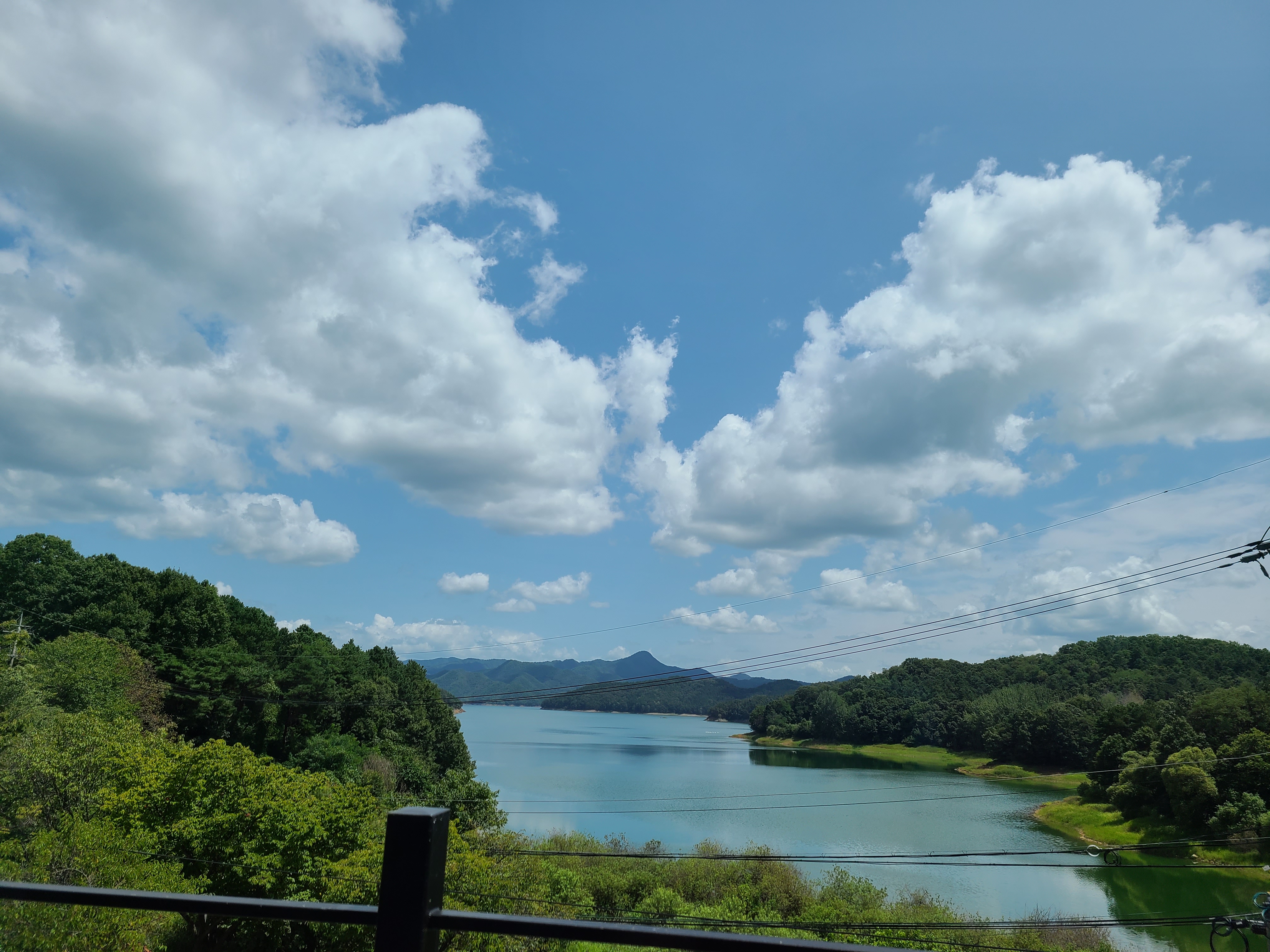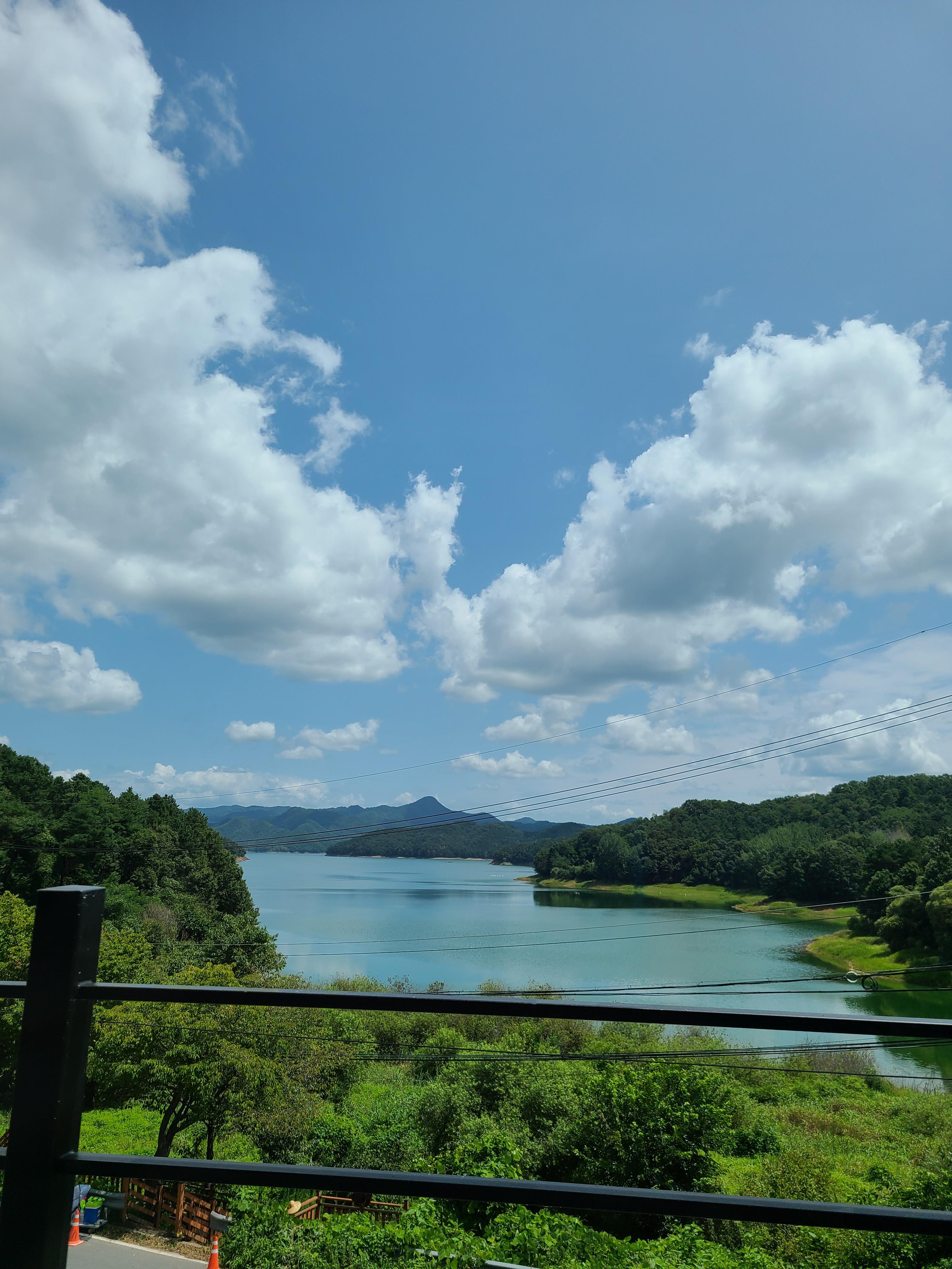 파란 하늘에 뭉게구름이 꽤 많았다. 그 하늘이 그대로 대청호를 비추고 있다.