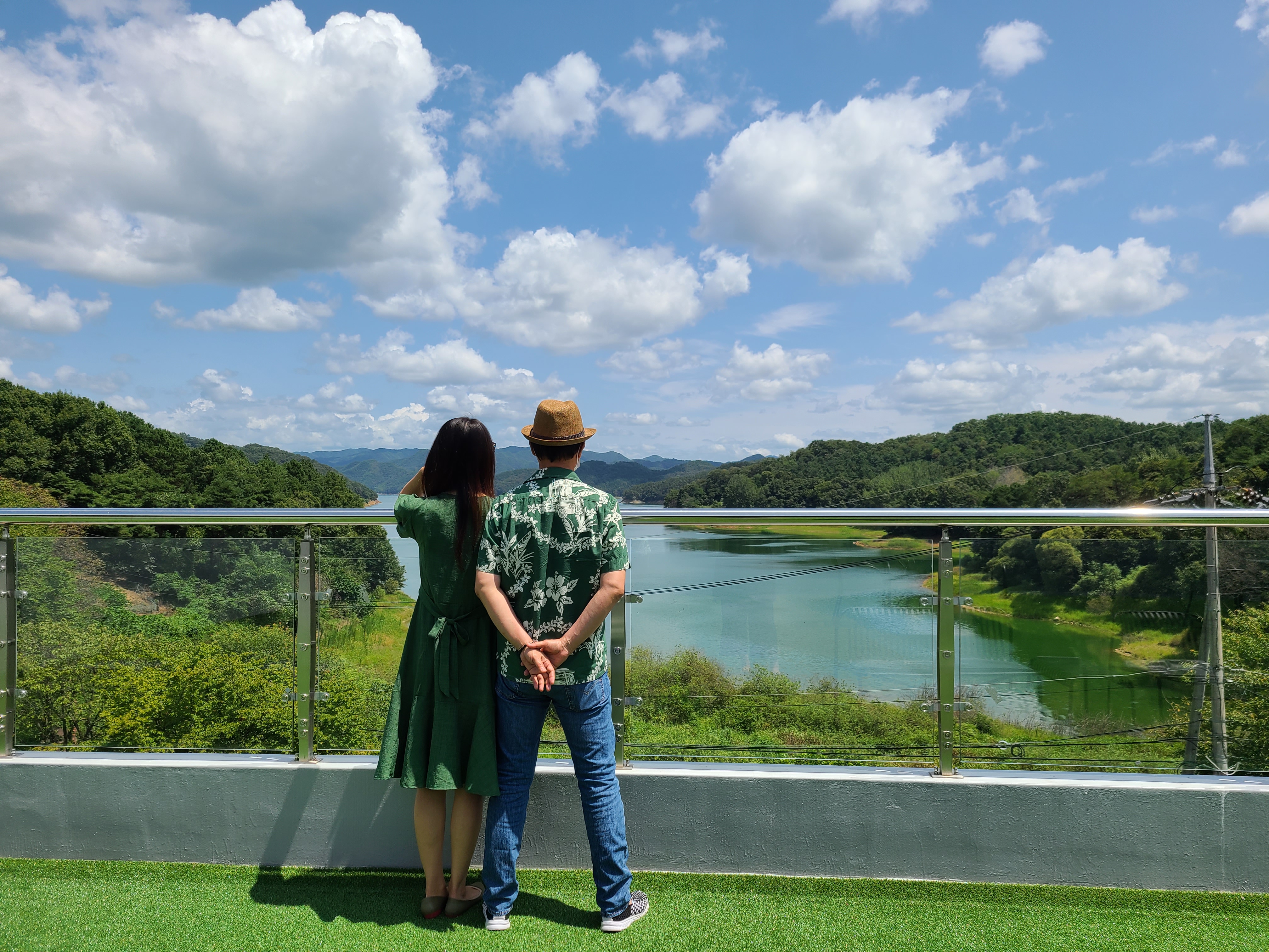사위가 대청호를 바라보고 있는 우리 모습을 근사하게 찍어 주었다.