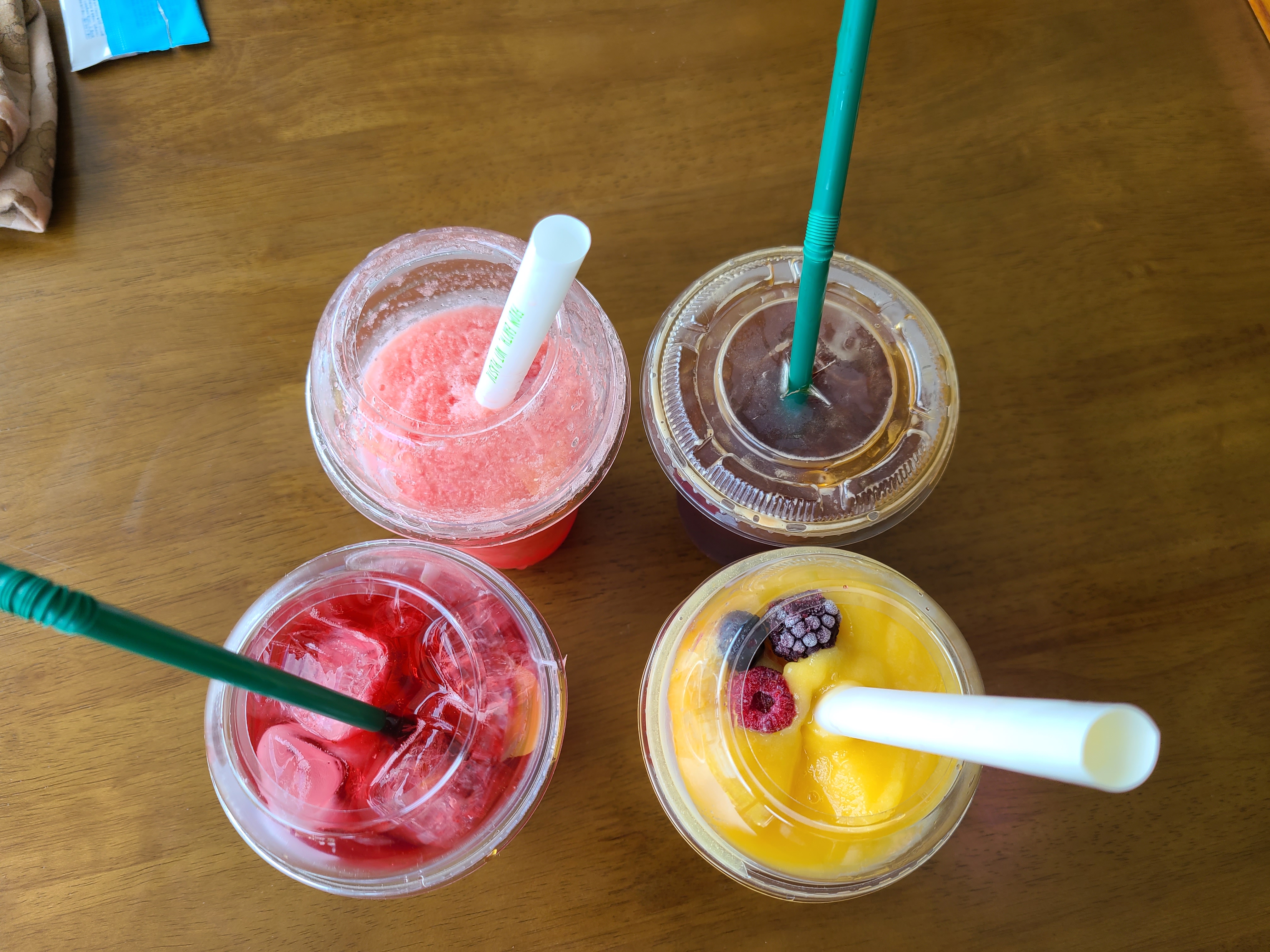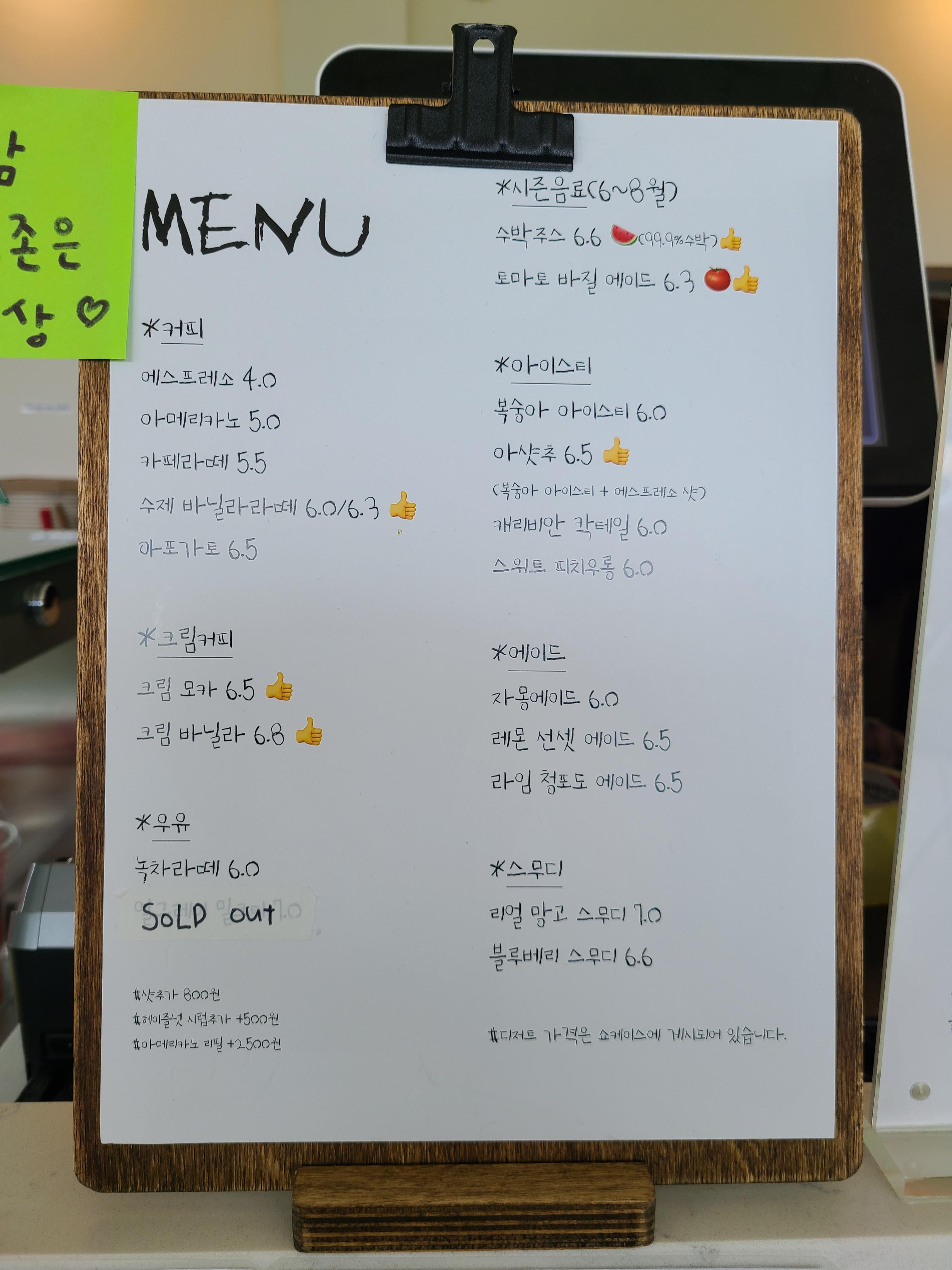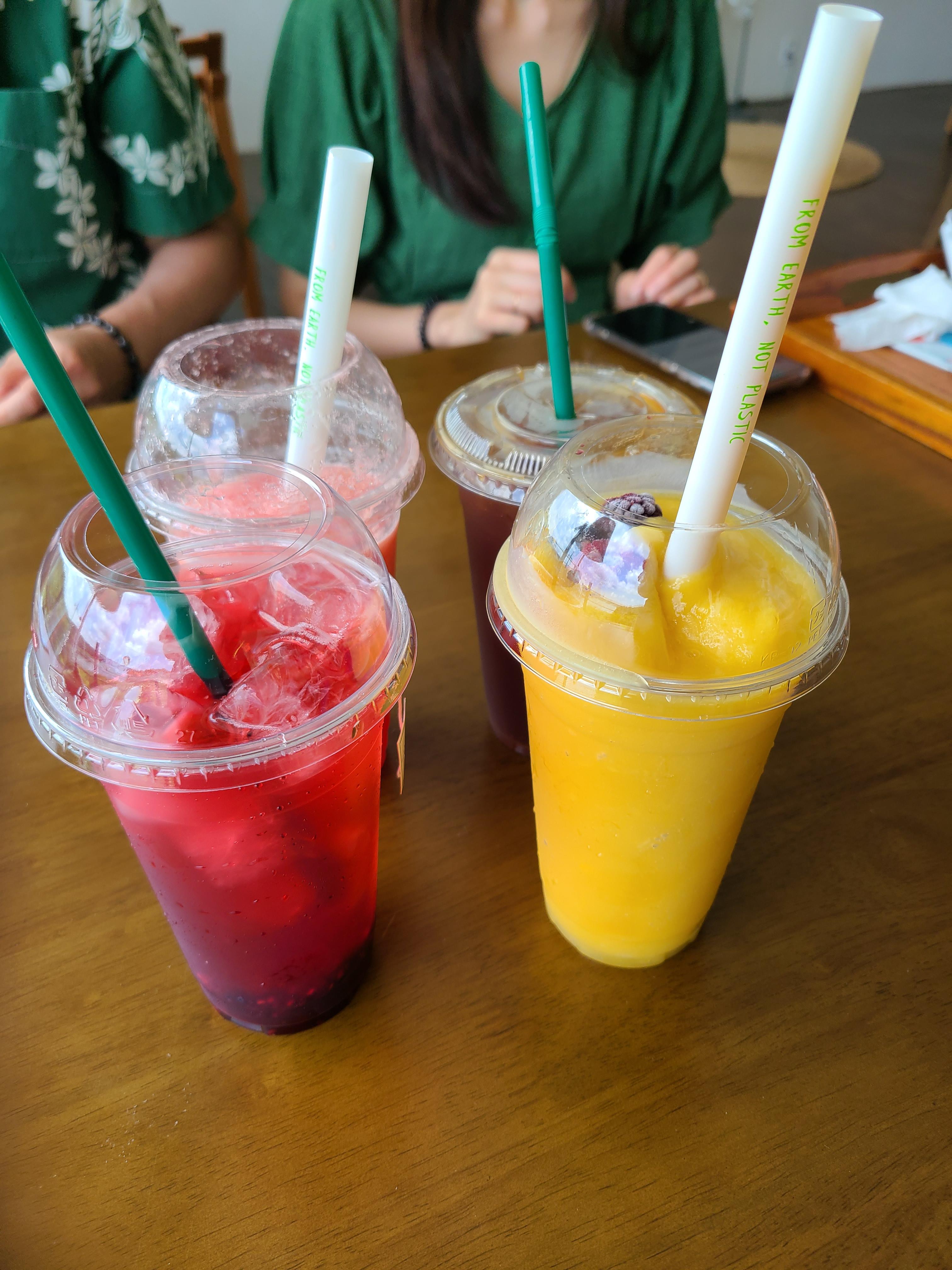 아침에 빵을 먹고 나왔기에 케이크는 생략하고 아이스 아메리카노(5.0), 수박주스(6.6), 캐리비안 칵테일(6.0), 리얼 망고 스무디(7.0)를 주문했다.