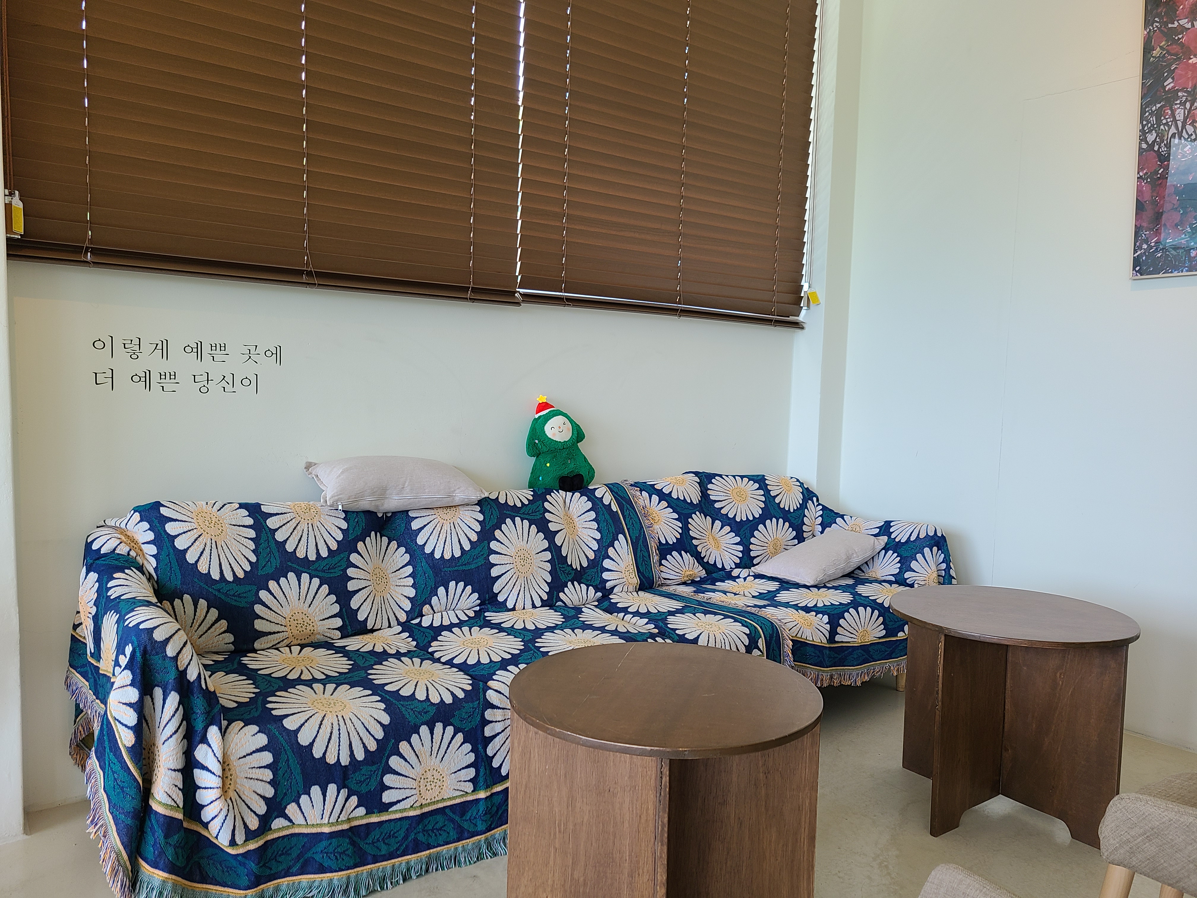 1층 안쪽에 놓은 좌석 벽에 '이렇게 예쁜 곳에 더 예쁜 당신이'라 글귀가 눈에 들어온다. 각자의 음료를 주문하고 2층으로 올라갔다.