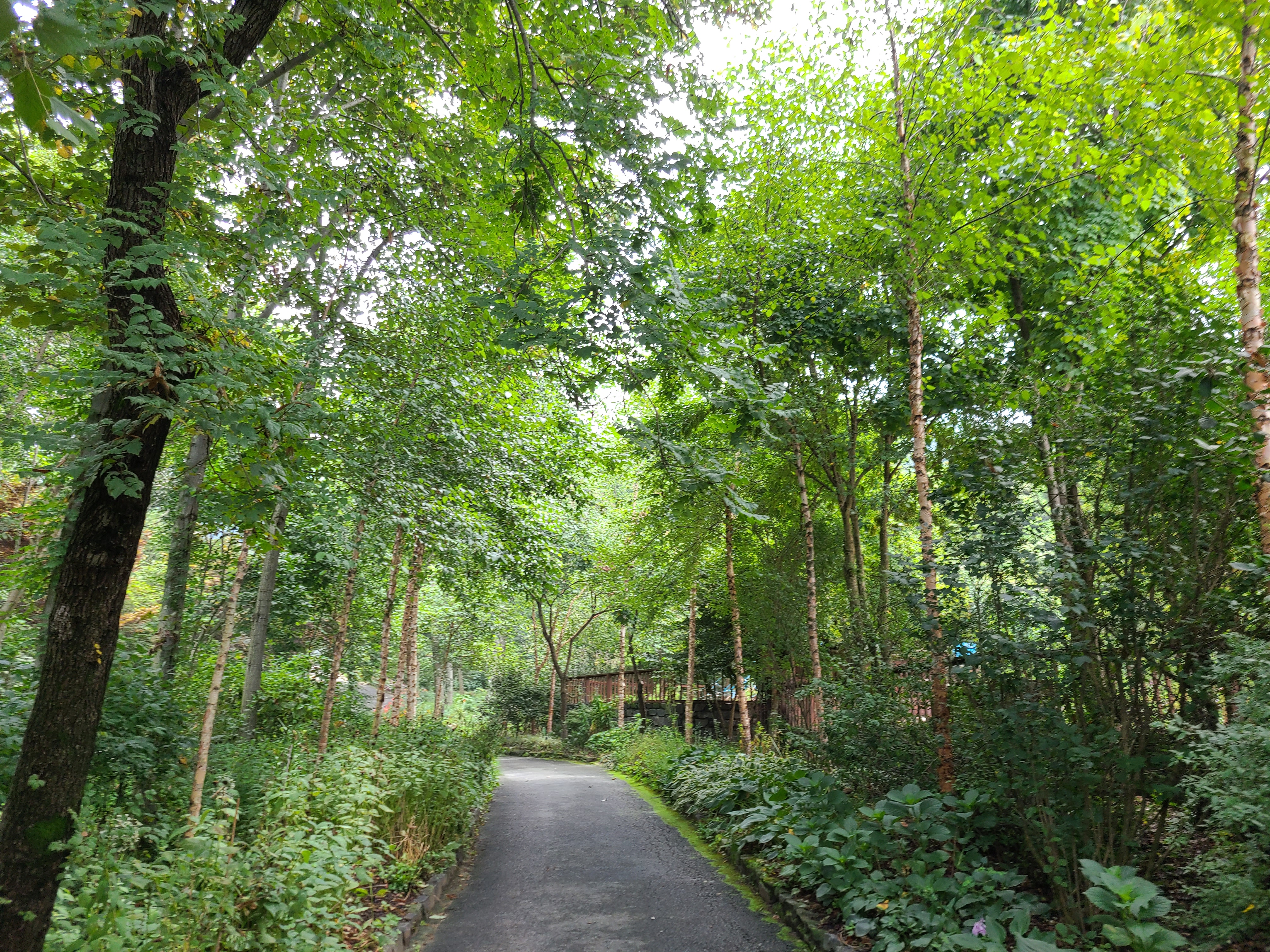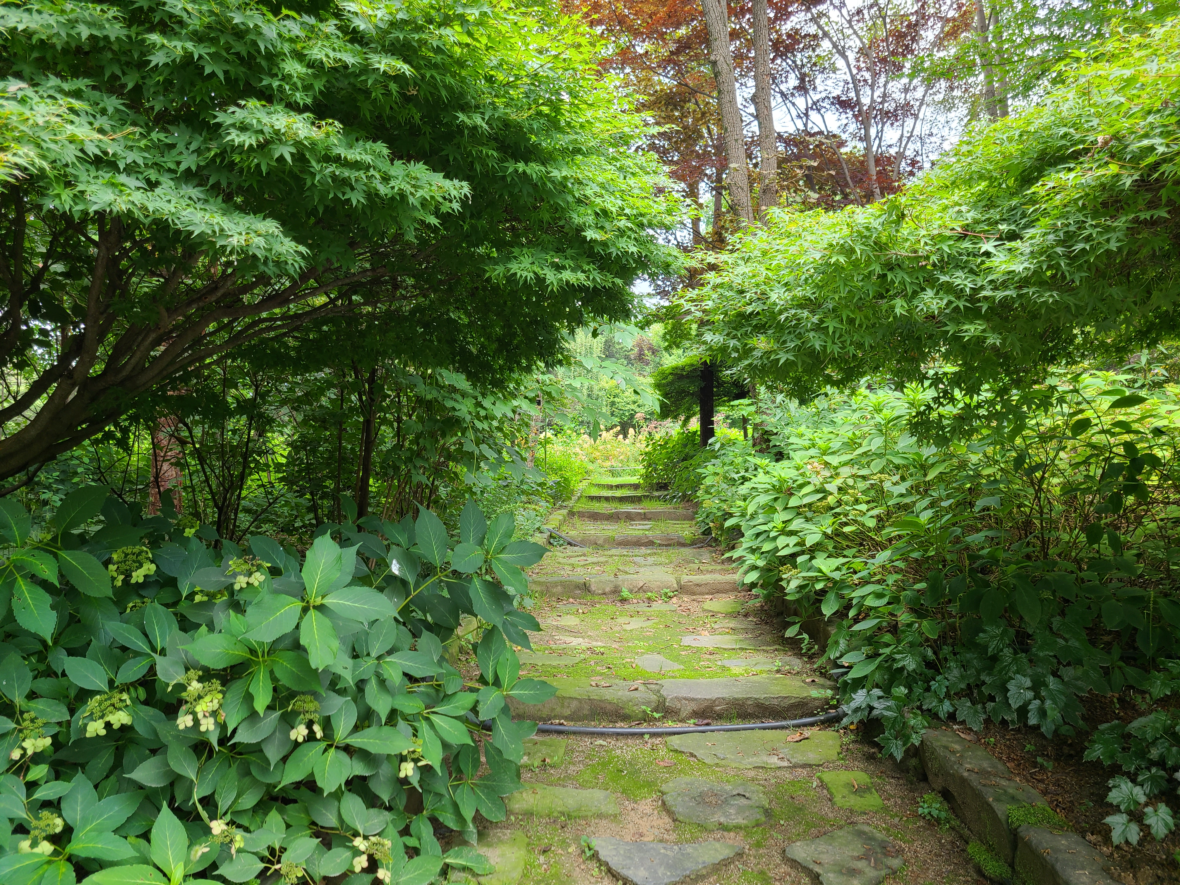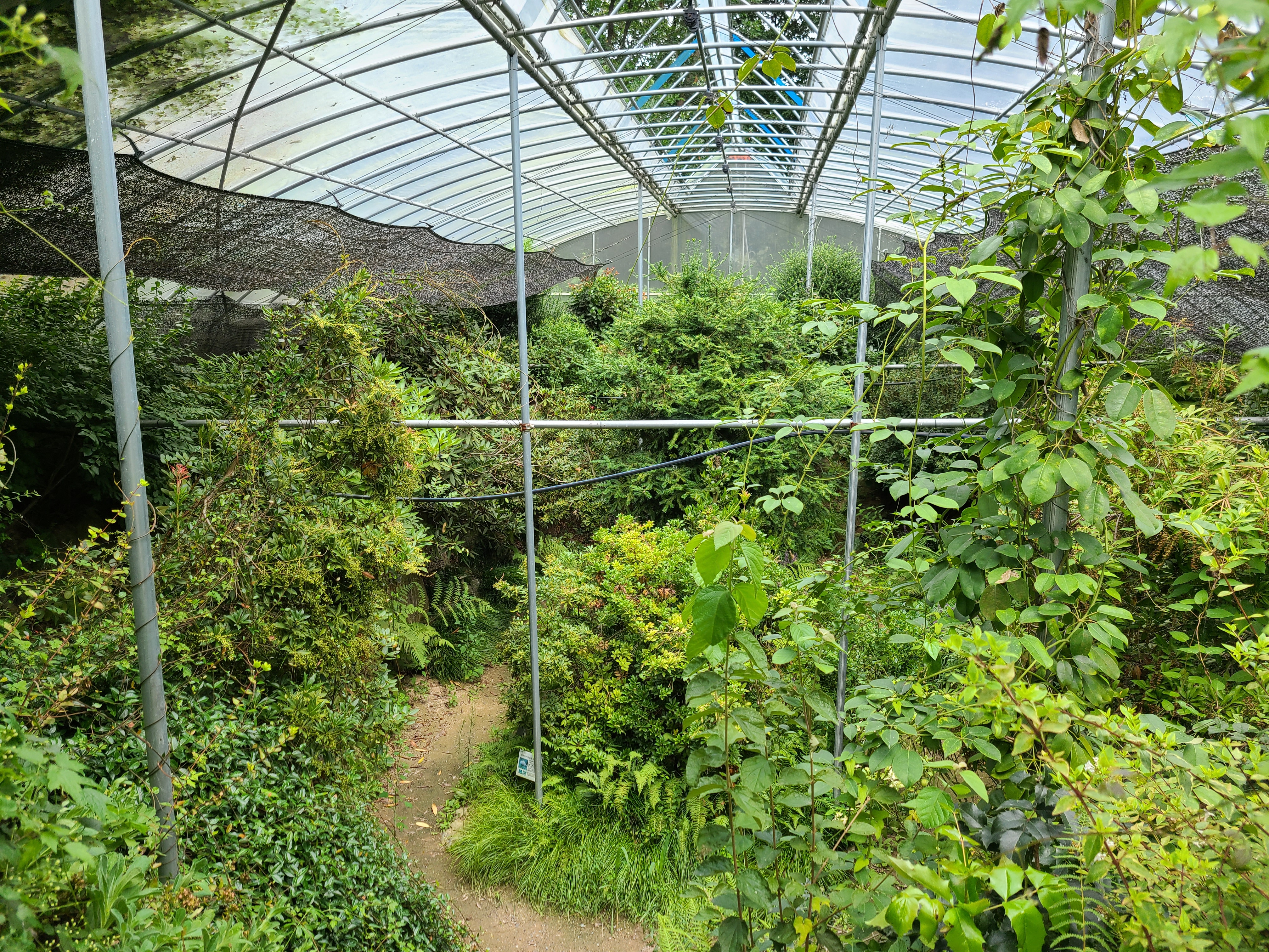 어린이 정원을 지나 아이리스원과 원추리원을 지나니 산에서 내려오는 물이 있고 다리 건너에 온실이 보인다. 다리 위쪽으로는 비가 와서 둑이 무너졌는지 공사를 하고 있었다.