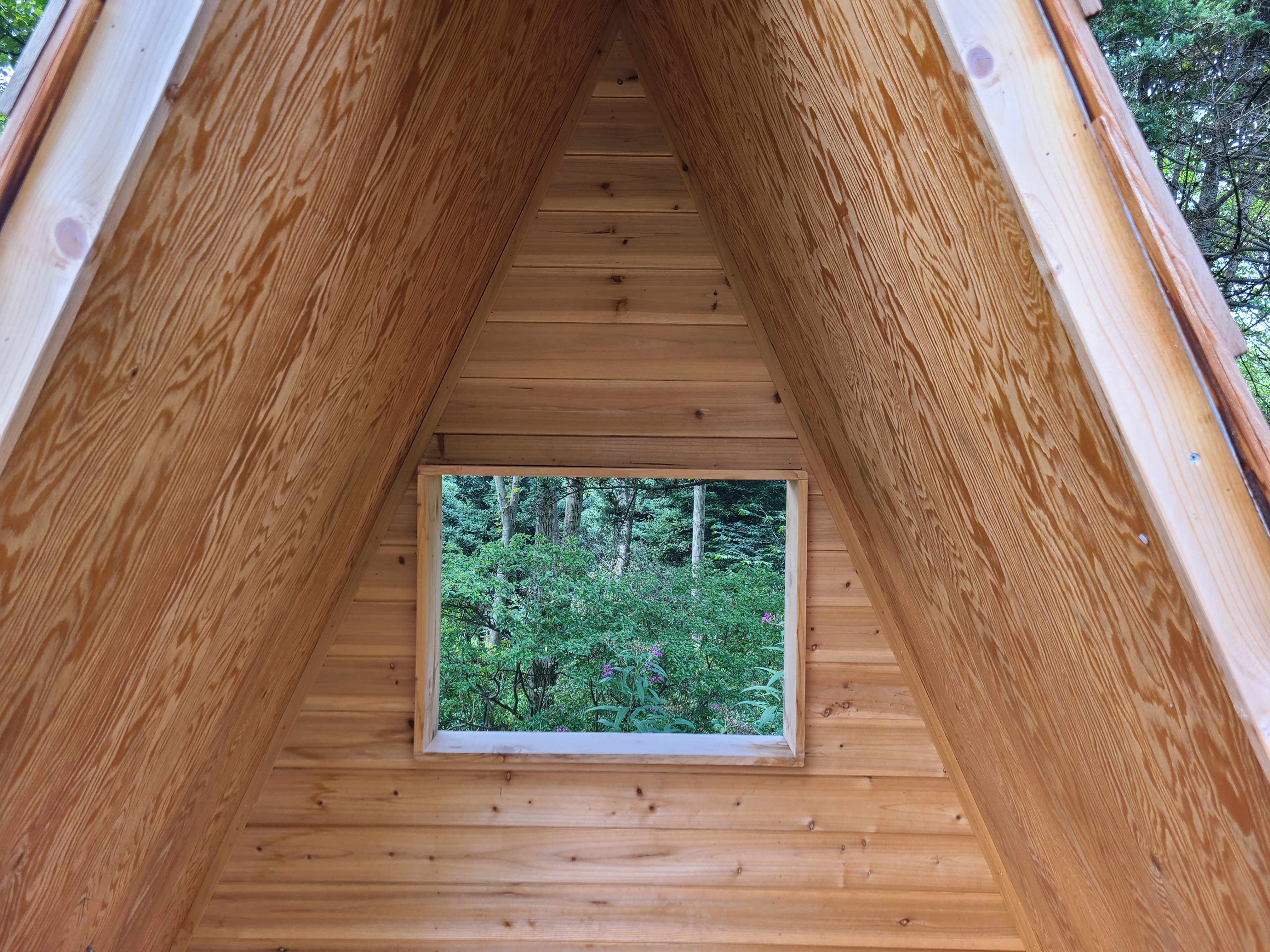 세모 집에는 창까지 뚫려 있었다. 친구와 둘이 편백나무로 된 세모 집에 들어가 앉았는데 편백향이 엄청 진하게 향을 내뿜는다.