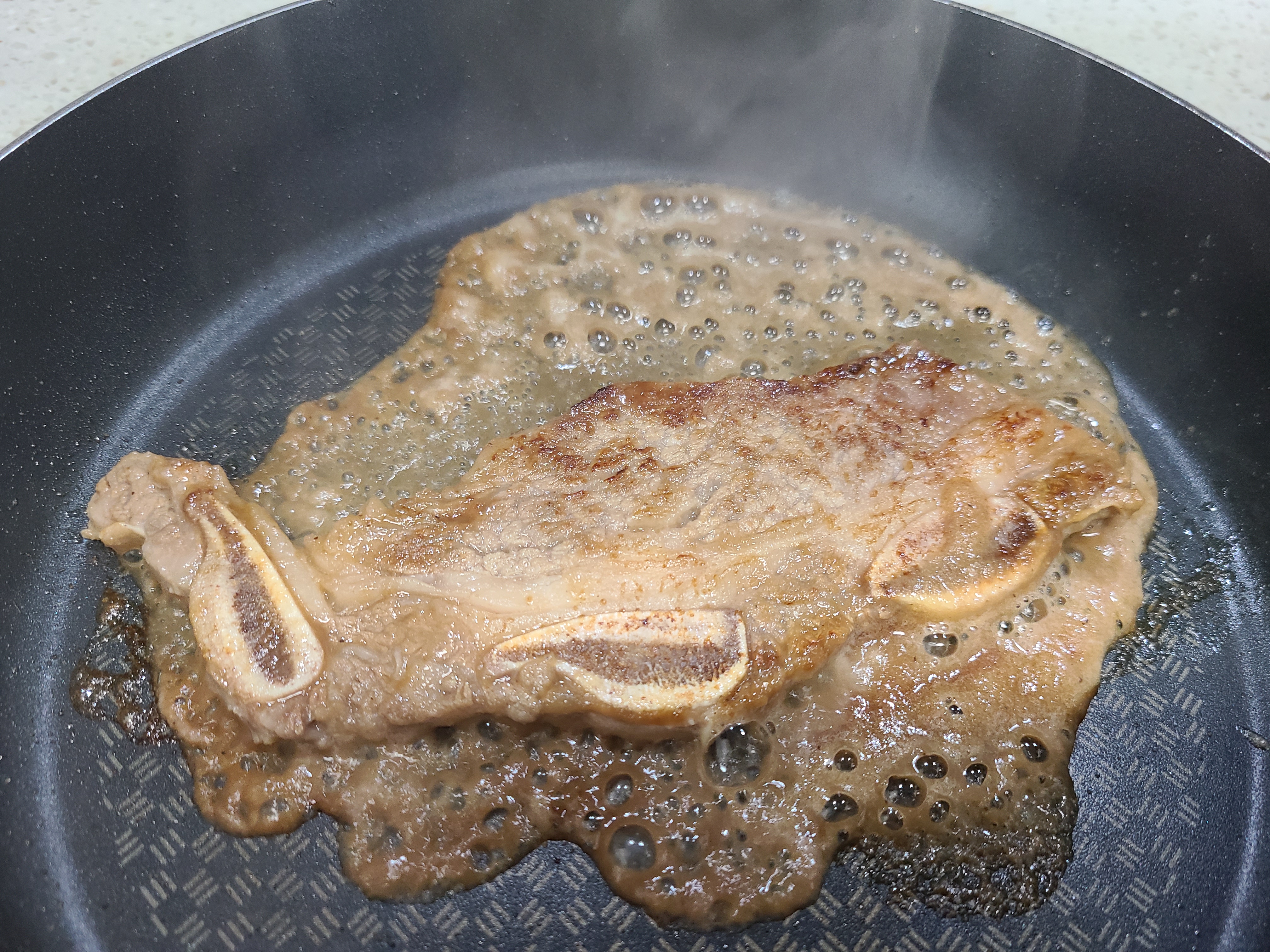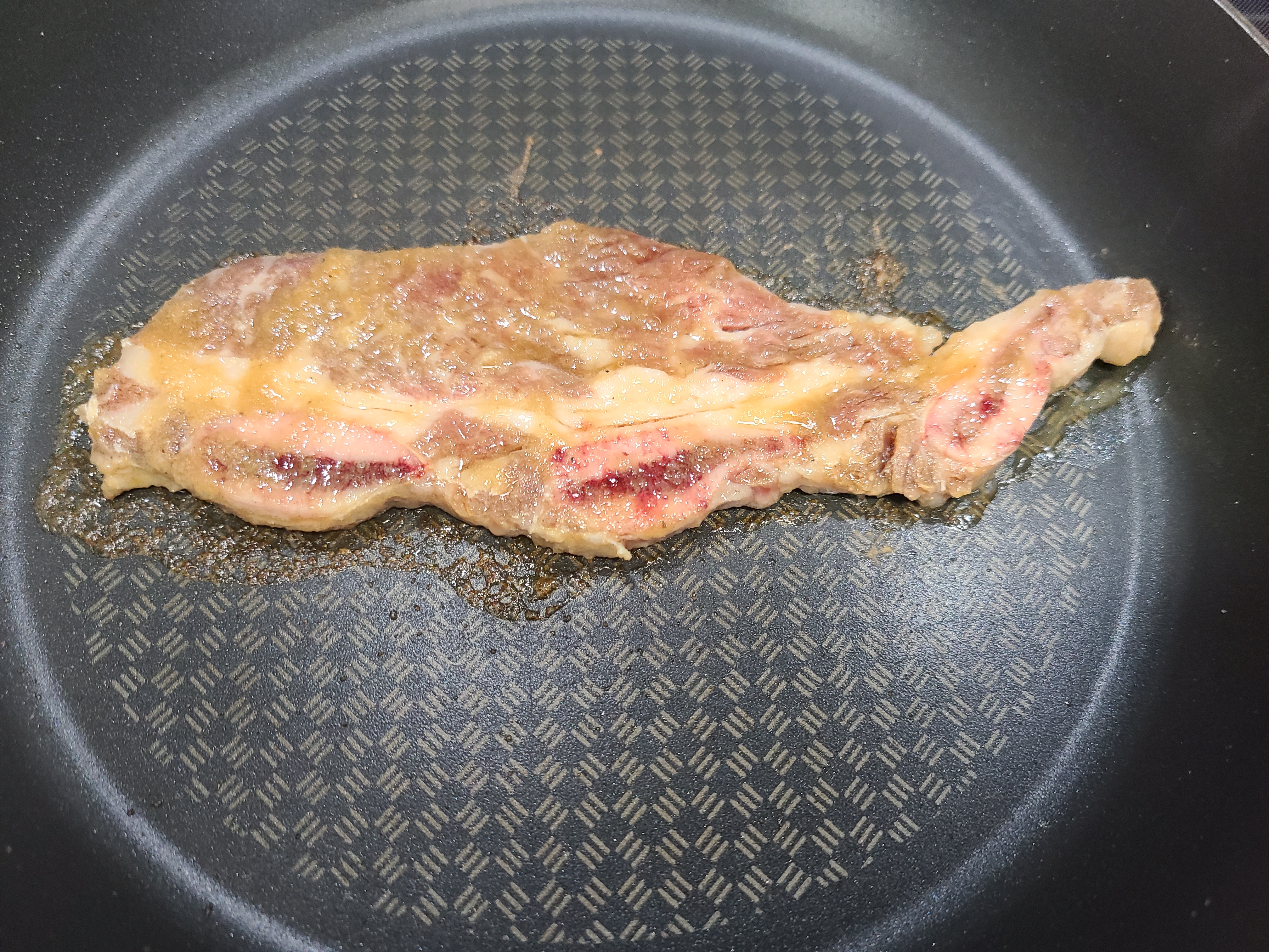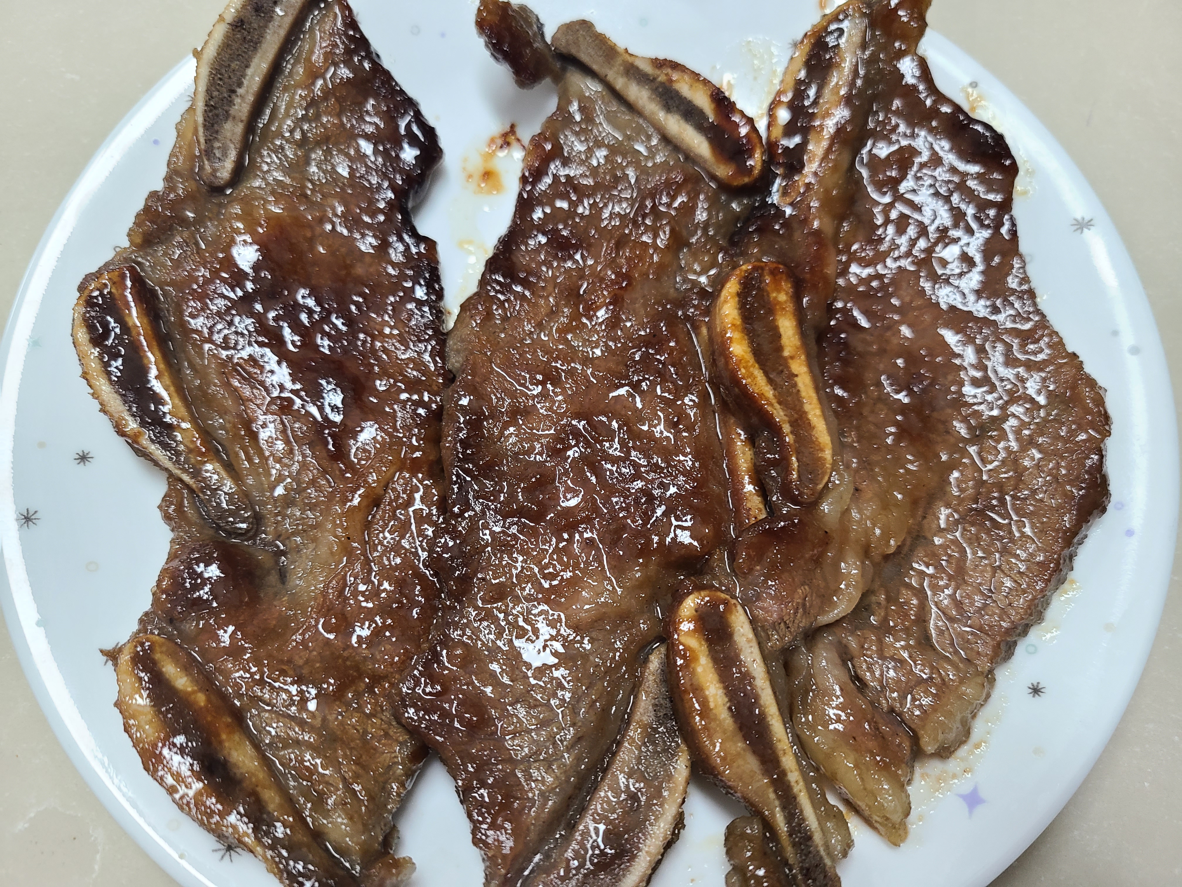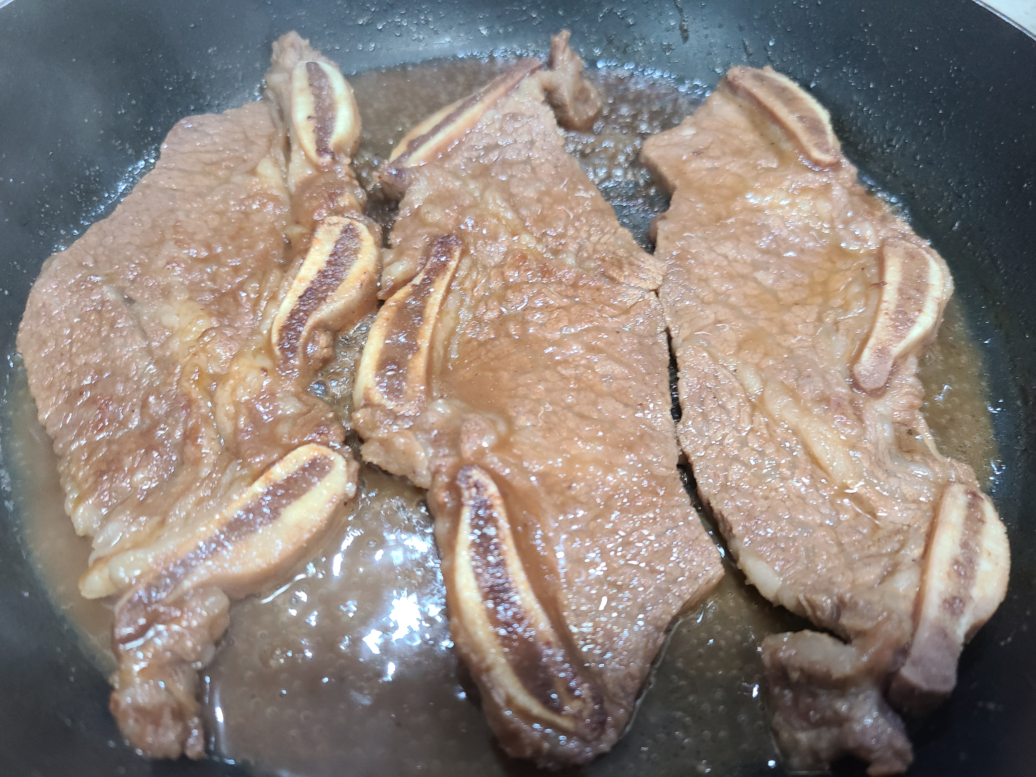 1. 양념된 LA갈비를 코팅된 팬을 달군 후 한 개를 얹어주었다.
