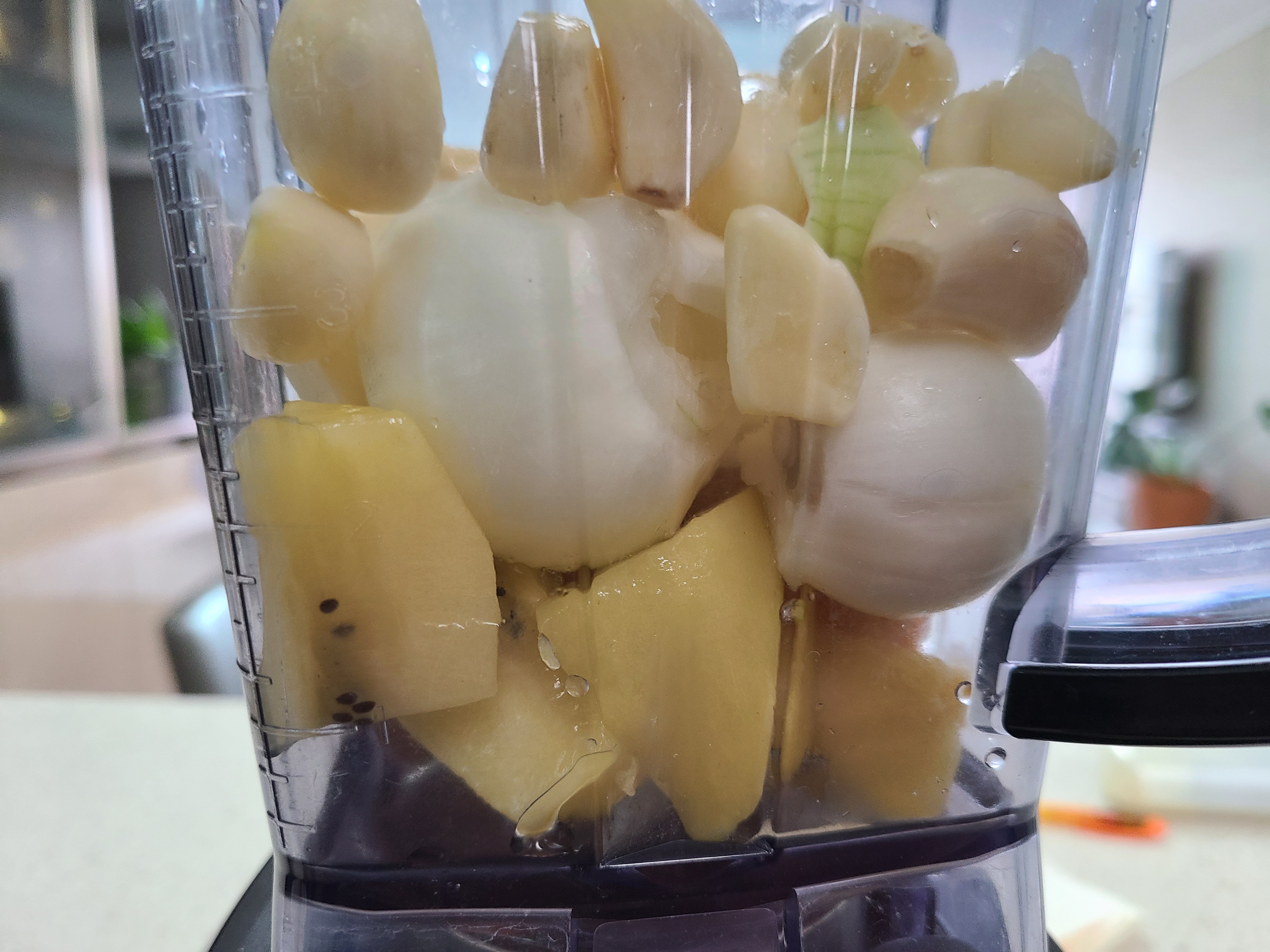 2. 블렌더에 준비한 배, 키위, 통마늘, 양파를 넣고 양조간장 , 표고버섯 육수, 원당, 맛술, 청주, 생강가루, 후추를 넣어준다.