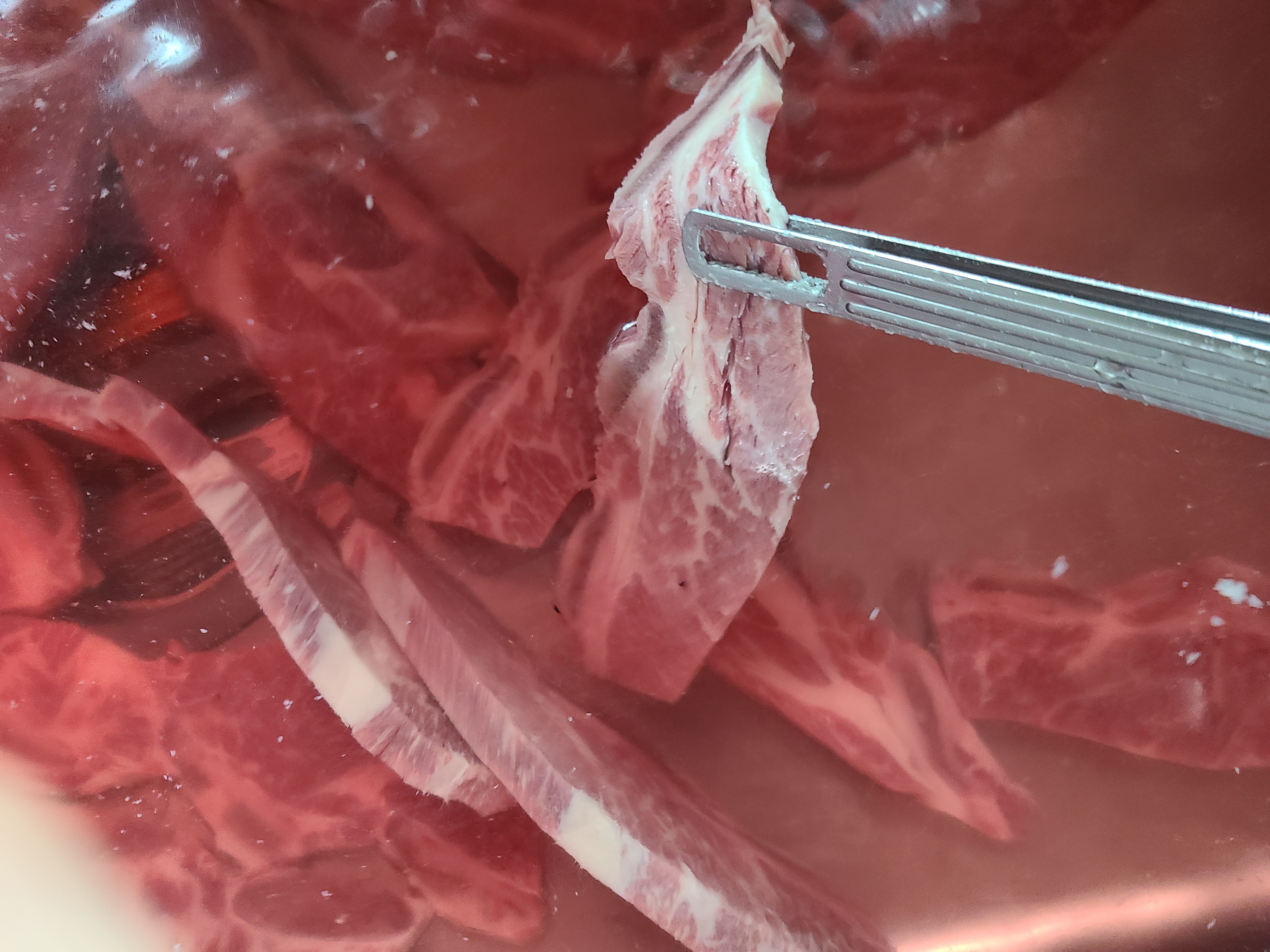 3. 한 시간 정도 담가주니 핏물이 빠져나와있고 기름 일부도 떠있다. 너무 오래 담가 두면 고기의 단맛까지 빠지니 너무 오래 담가 두지 않는 것이 좋다.