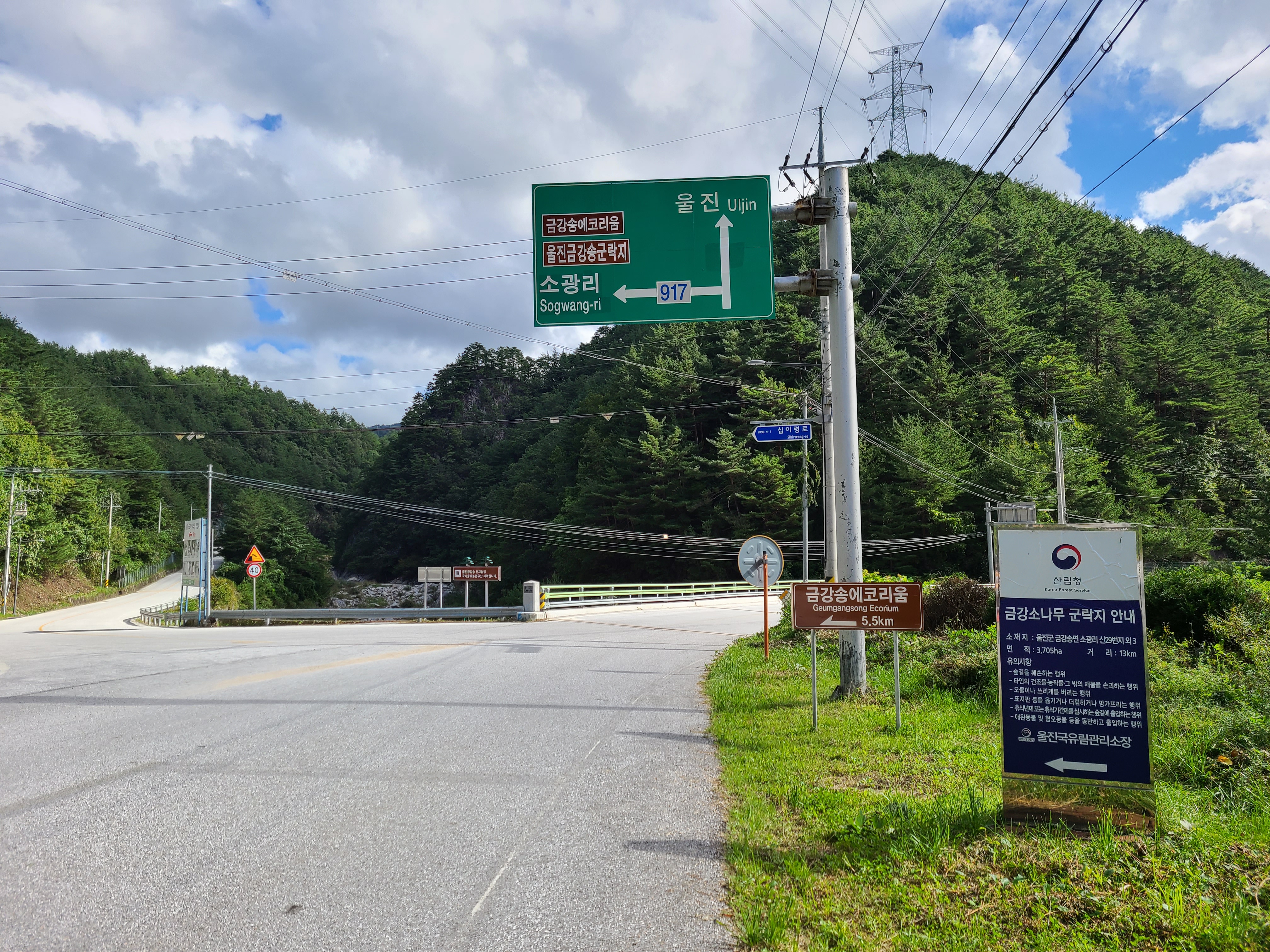 왼쪽 길로 들어가면 금강송 에코리움과 울진금강송 군락지로 들어가게 된다. 가족 탐방로 지점까지 이곳에서 13km를 들어가야 한다. 오지 중에 오지인 듯하다.