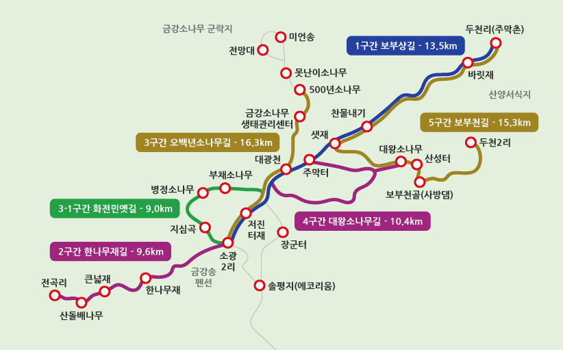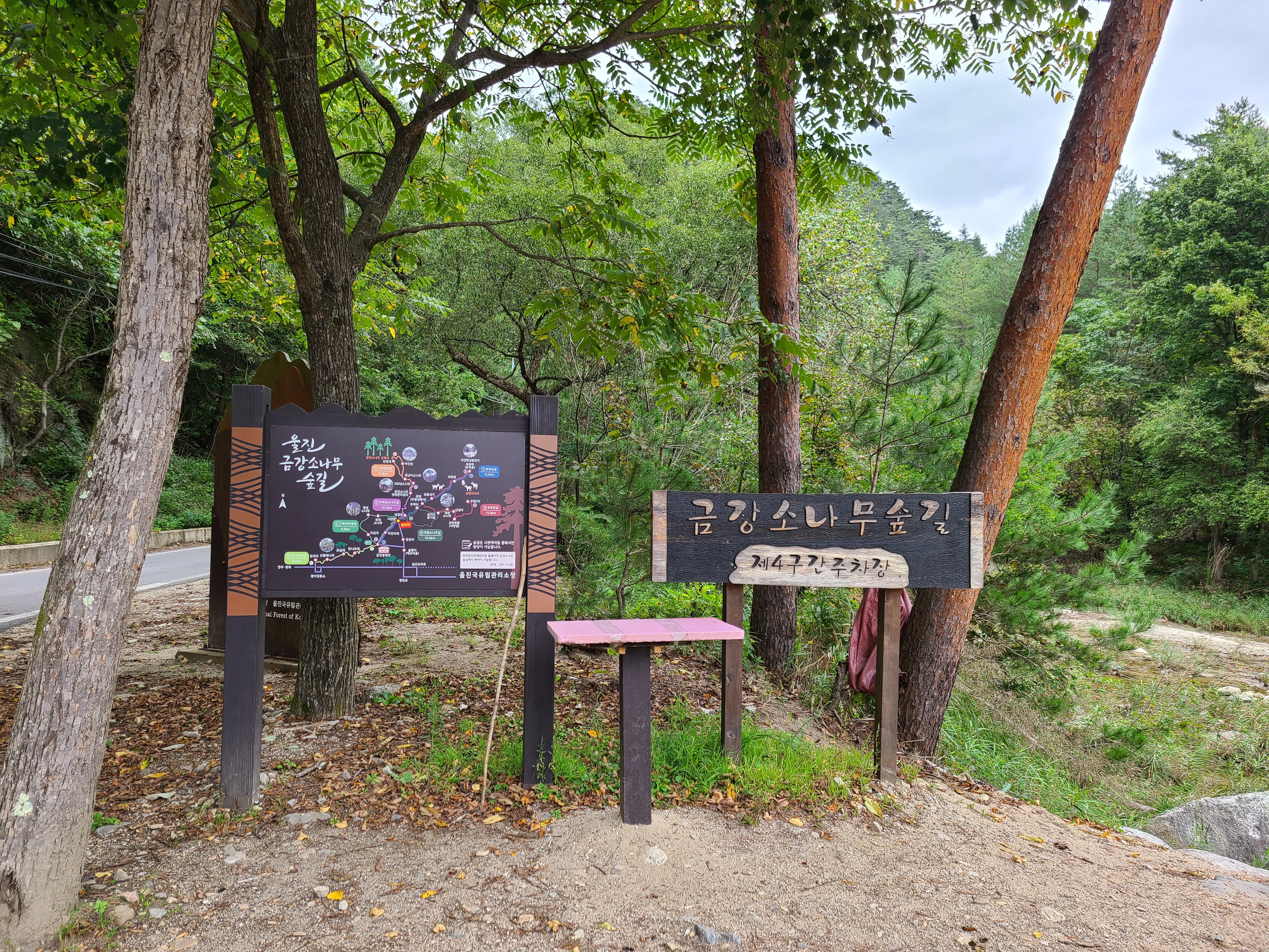 숲 해설사 분에게 다음에 탐방할 곳 추천을 부탁했더니 무리 없이 걷기로는 4구간을 추천한다고 했다. 나오는 길에 제4구간 주차장을 만나 다시 탐방로를 살펴보았는데 4구간은 10.48km로 약 5시간 정도 소요가 된다고 한다. 대왕 소나무를 만날 수 있다고 하니 다음에는 금강소나무숲길 4구간을 탐방해 보아야겠다.