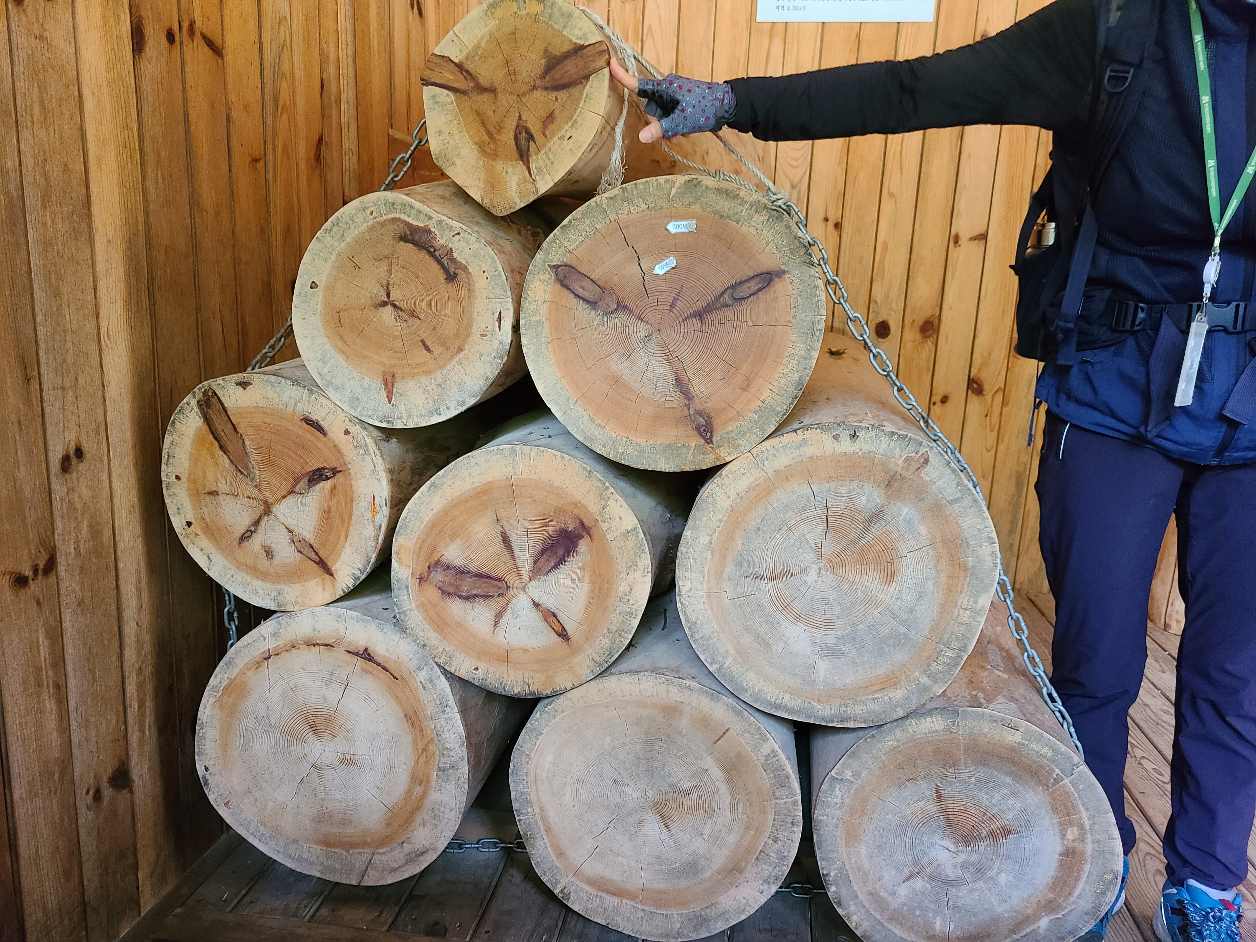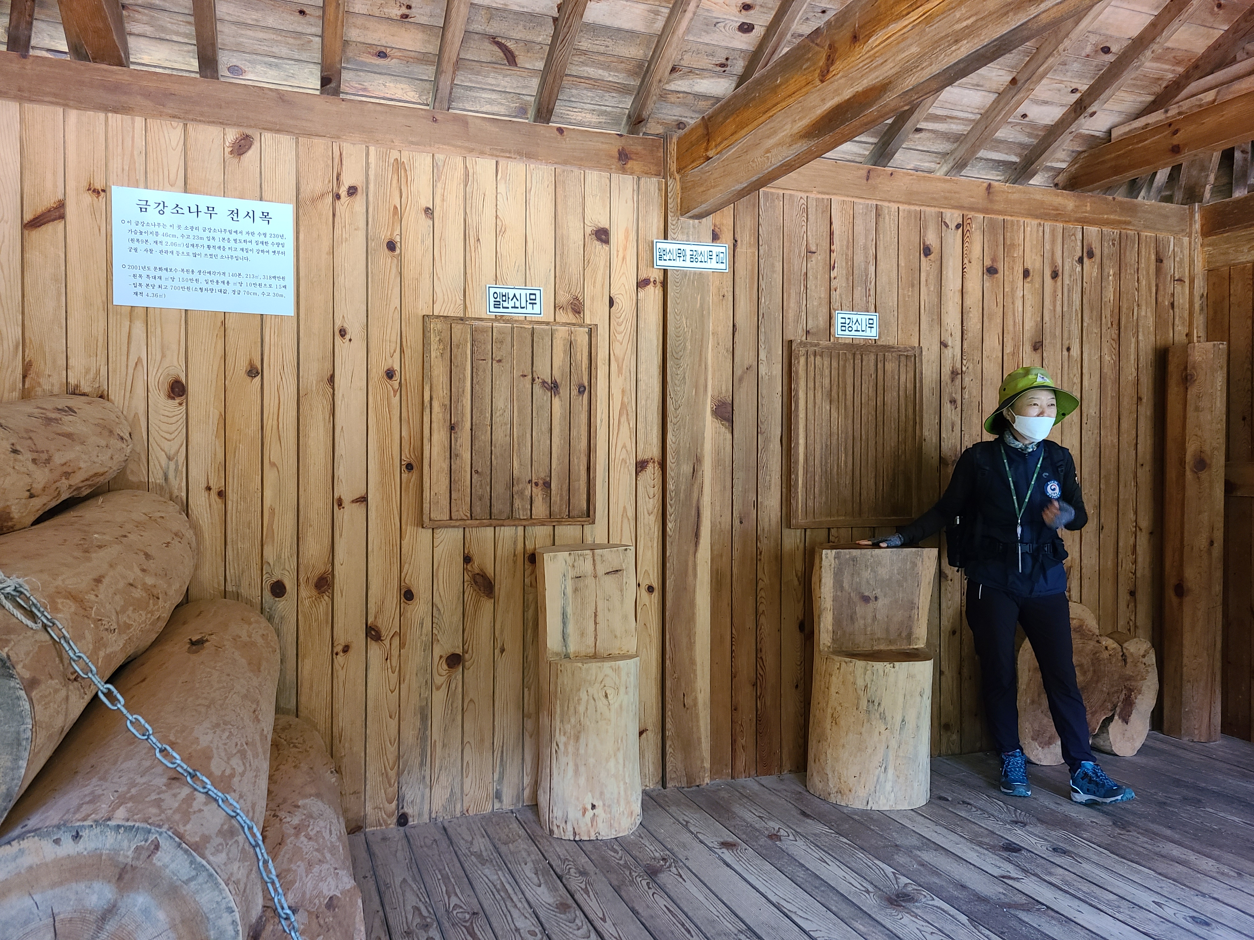 하나의 소나무를 9개로 잘라 놓았는데, 나무의 절단면을 보면 타원으로 길쭉하게 남아 있는 검은 자욱이 소나무의 가지가 잘려나간 부분이다. 금강소나무가 하늘을 향에 뻗어나가며 광합성 작용을 하는데 그늘에 가려진 밑 가지는 햇빛을 받지 못하고 영양분을 섭취하지 못해 서서히 죽어간다고 한다. 죽은 가지는 태풍이 불 때 자연으로 가지치기가 되는데 그 자욱은 남게 된다고 한다. 사람도 피부에 상처가 나면 아물듯 소나무는 가지가 남아 있는 자욱이 시간이 흘러가며 기둥 안으로 감싸여 들어가며 상처가 아물듯 그 자욱도 서서히 없어진다고 한다. 밑동이 부분에 흔적이 거의 없어지는 것도 세월의 흐름 때문이다