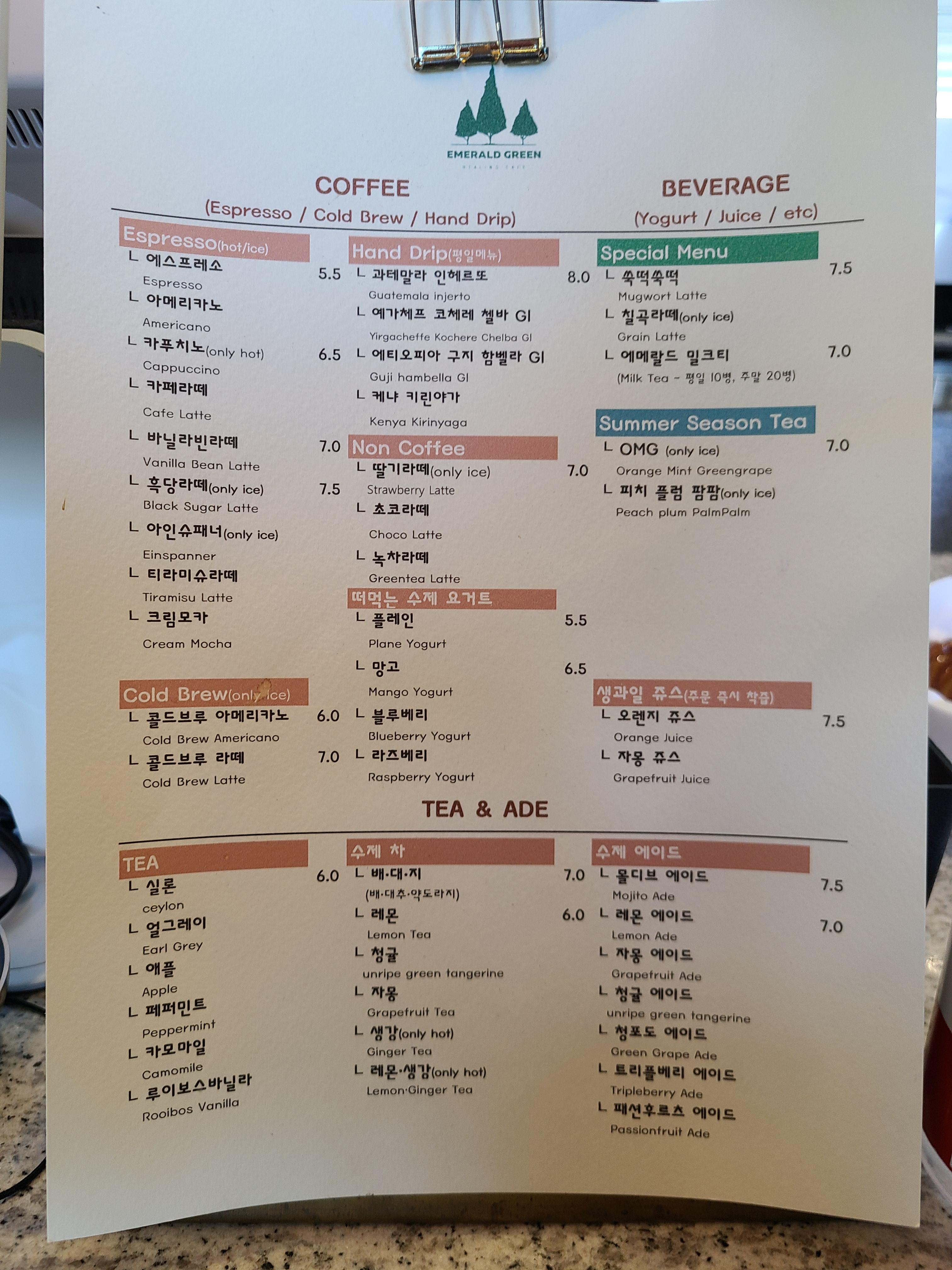 진열되어 있는 빵이 자리가 많이 비어있는 걸 보니 맛이 좋을 듯했다. 점심을 먹은 지 얼마 되지 않아 빵은 구입하지 않고 아이스 아메리카노와 에메랄드 밀크티 그리고 패션후르츠 에이드를 주문했다.