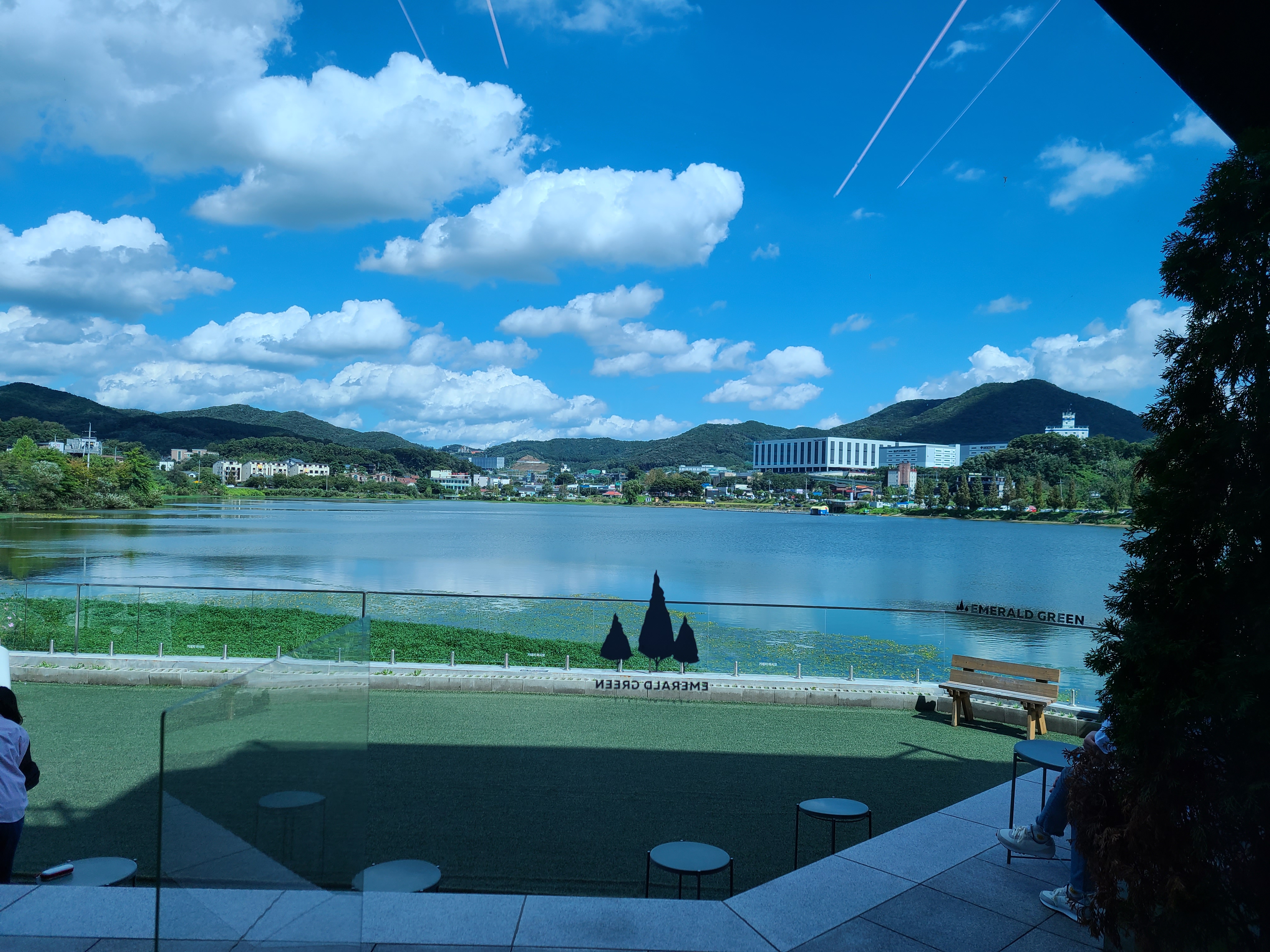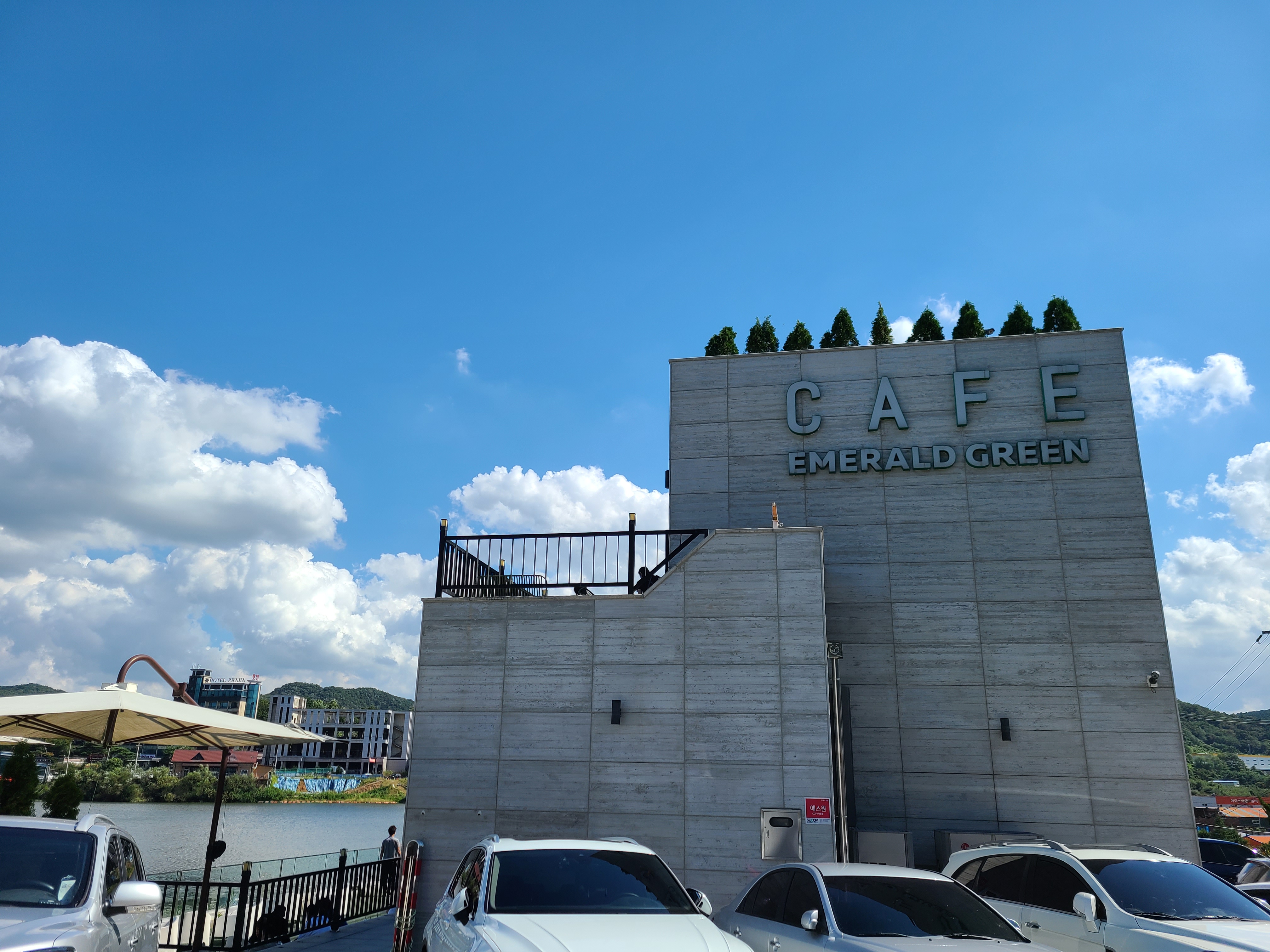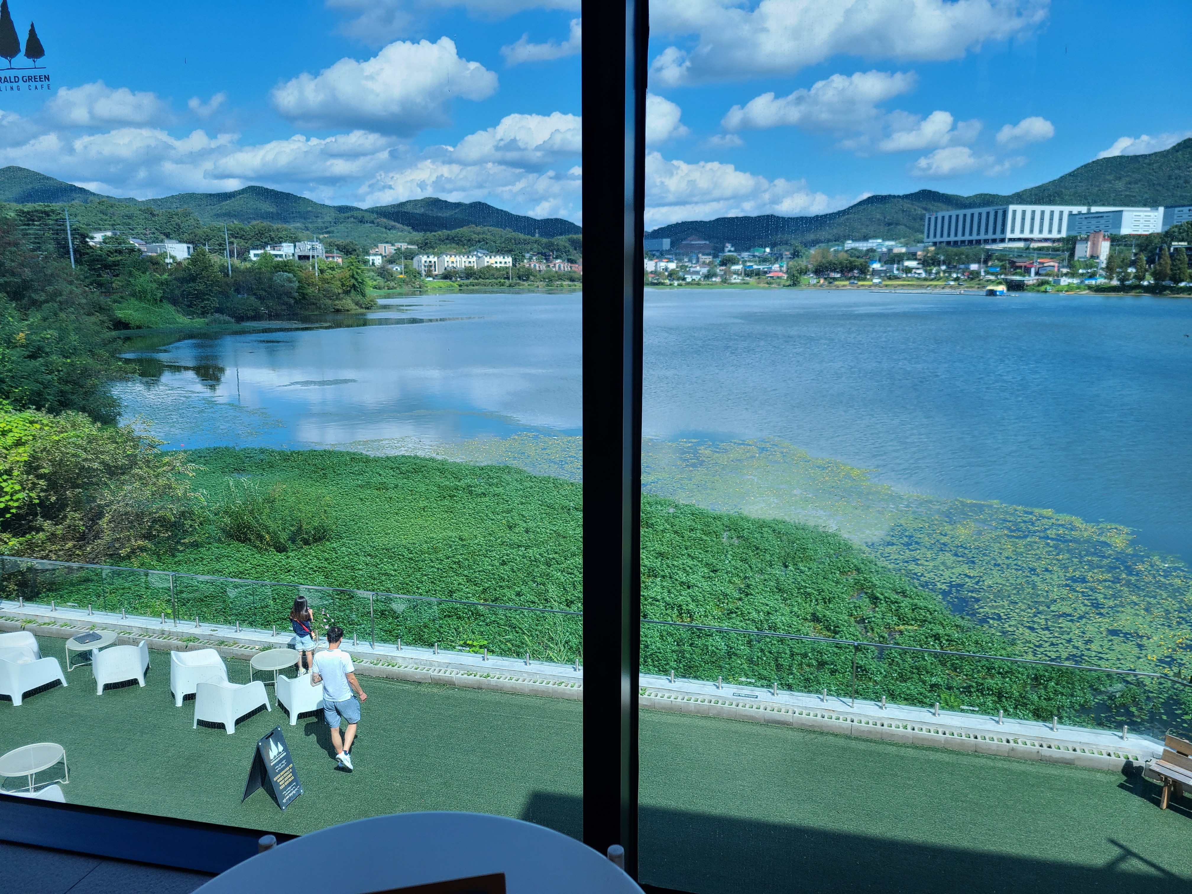 카페 에메랄드그린 1층 야외에 놓인 흰색의 의자와 테이블이 파란 하늘과 저수지 그리고 수초와 너무 조화롭게 어울린다. 아직은 햇살이 뜨거워서인지 그늘이 있는 곳에만 사람들이 앉아있는데 야외에 앉아 저수지 바람을 쐬고 있는 모습들이 너무 여유로워 보였다.