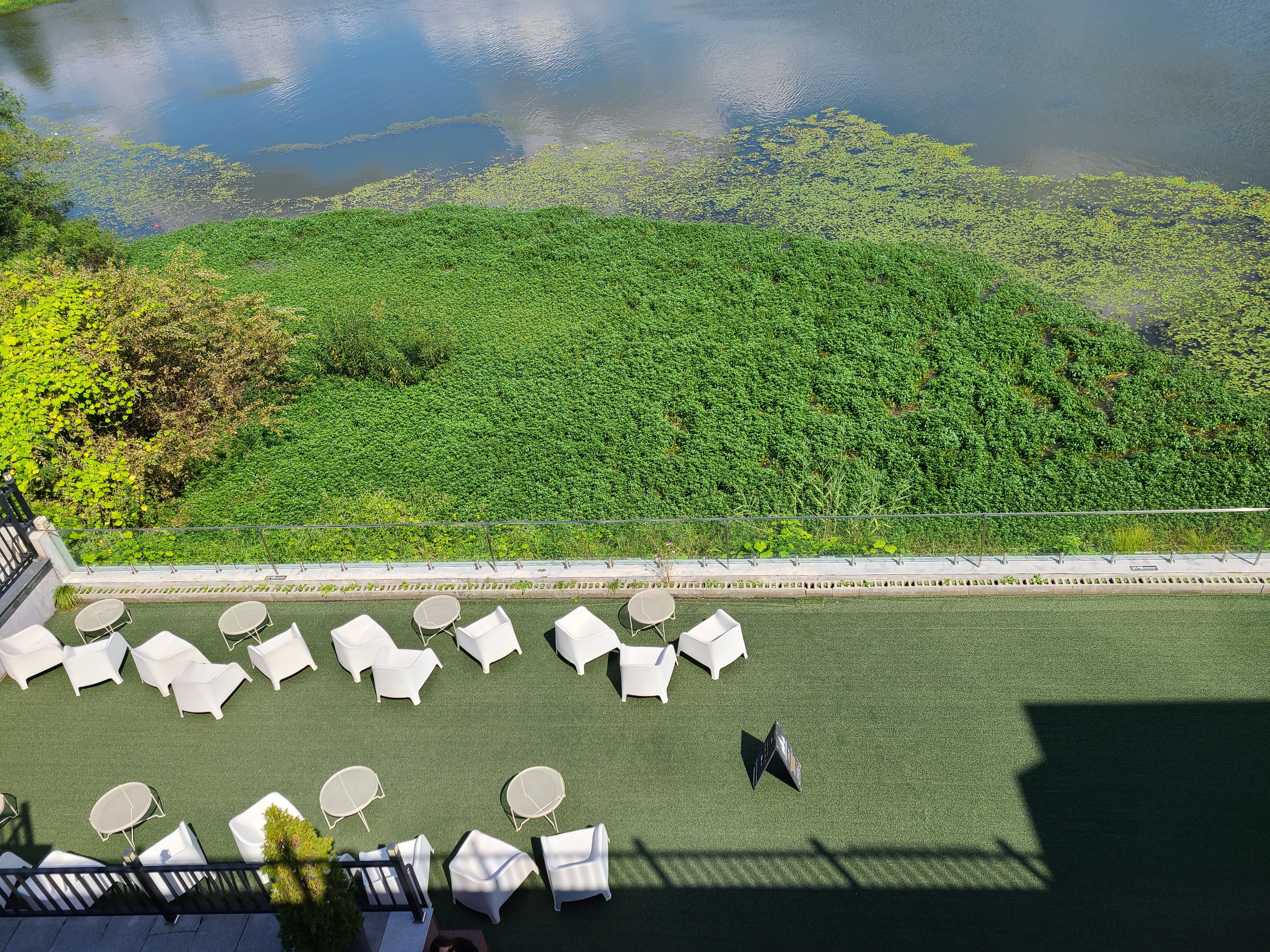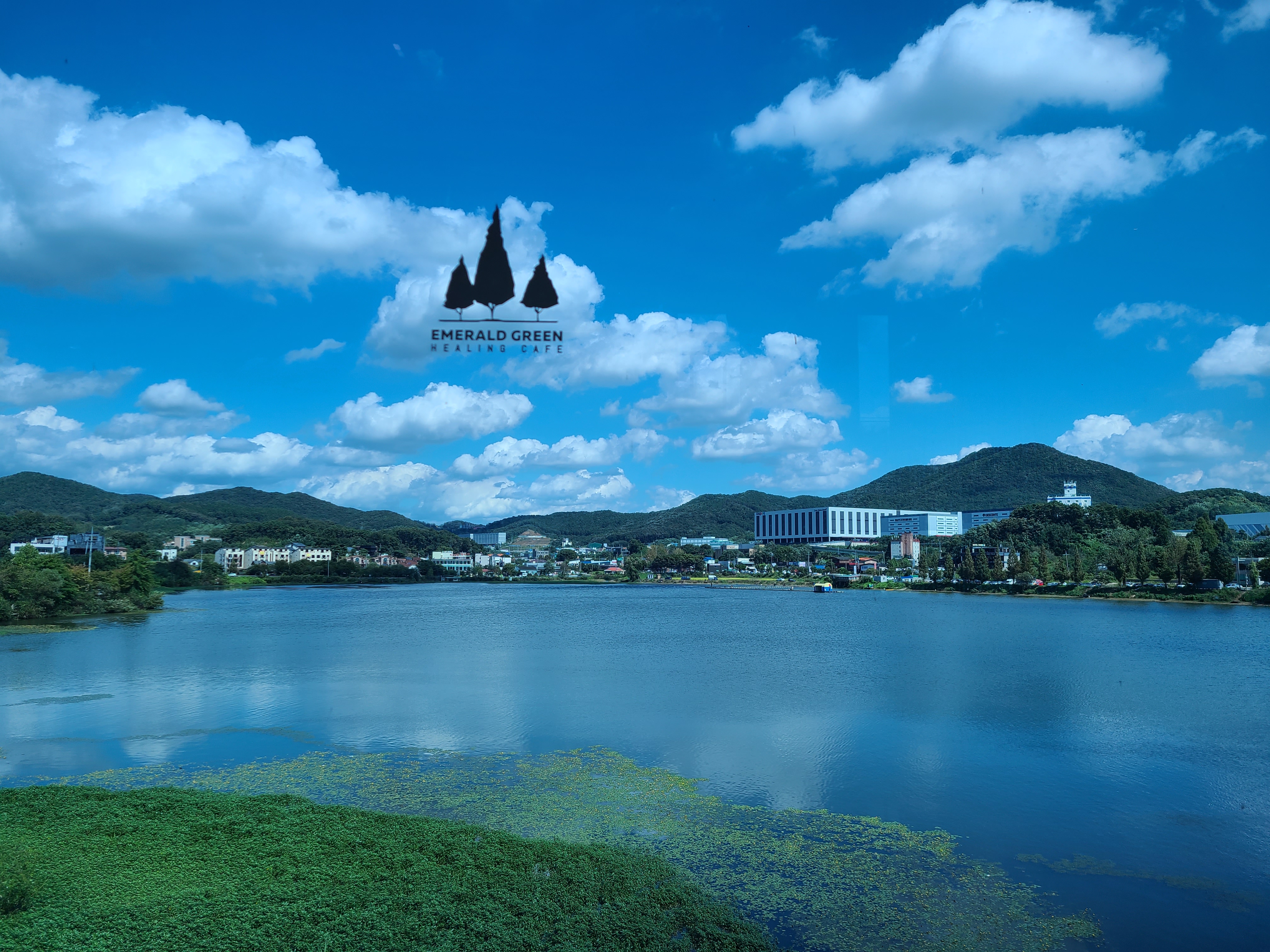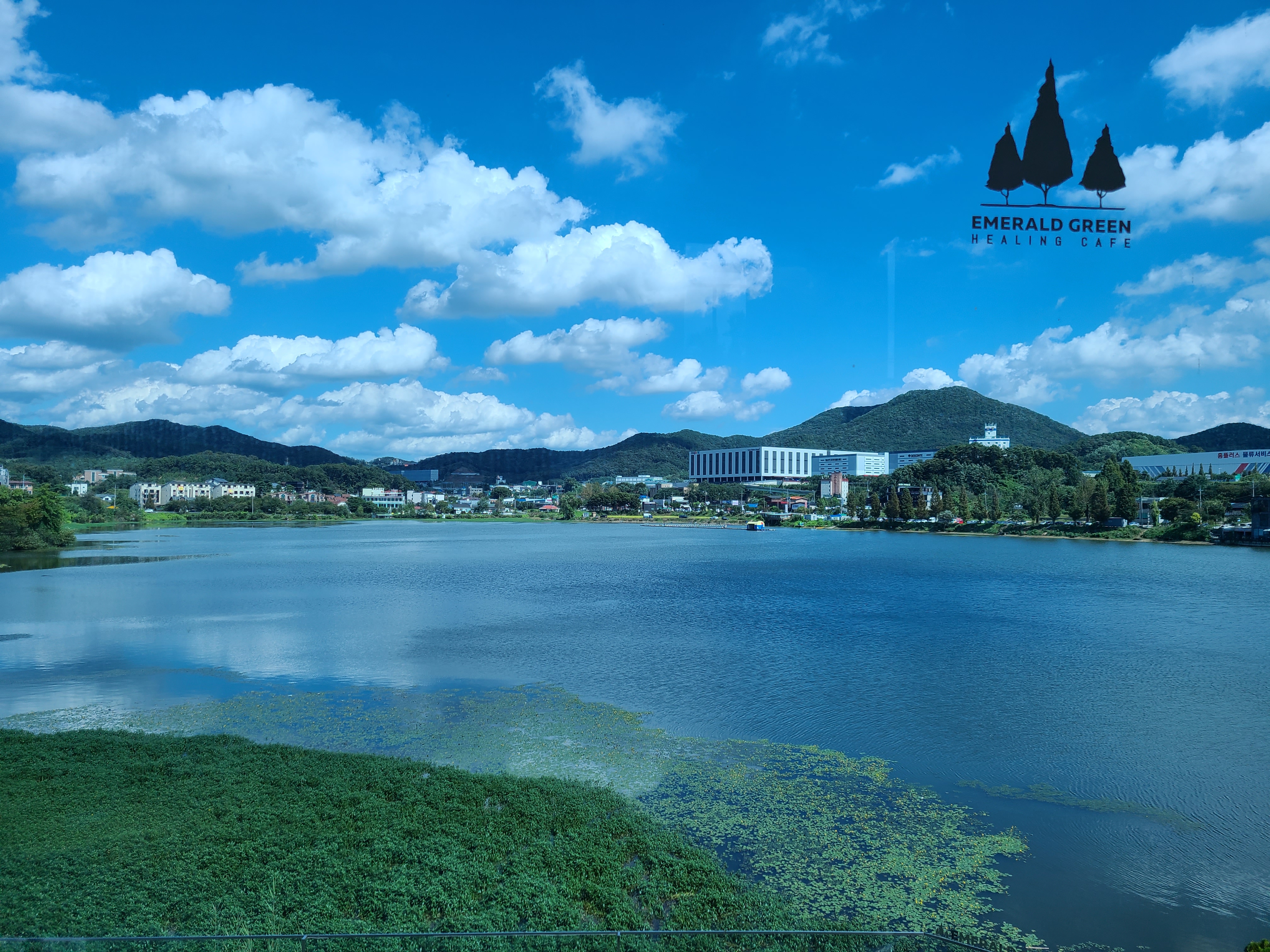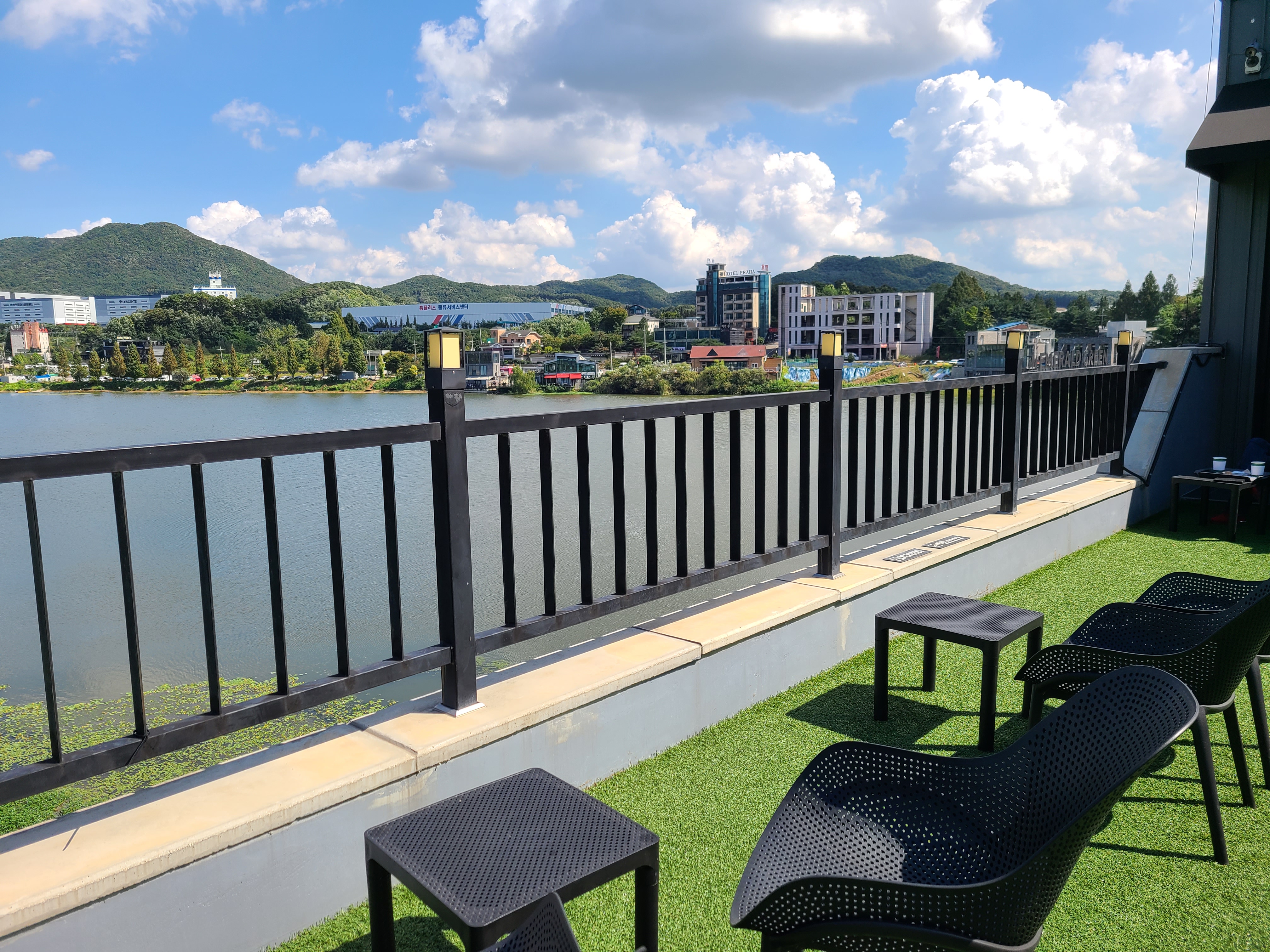 카페 에메랄드그린 1층 야외에 놓인 흰색의 의자와 테이블이 파란 하늘과 저수지 그리고 수초와 너무 조화롭게 어울린다. 아직은 햇살이 뜨거워서인지 그늘이 있는 곳에만 사람들이 앉아있는데 야외에 앉아 저수지 바람을 쐬고 있는 모습들이 너무 여유로워 보였다.
