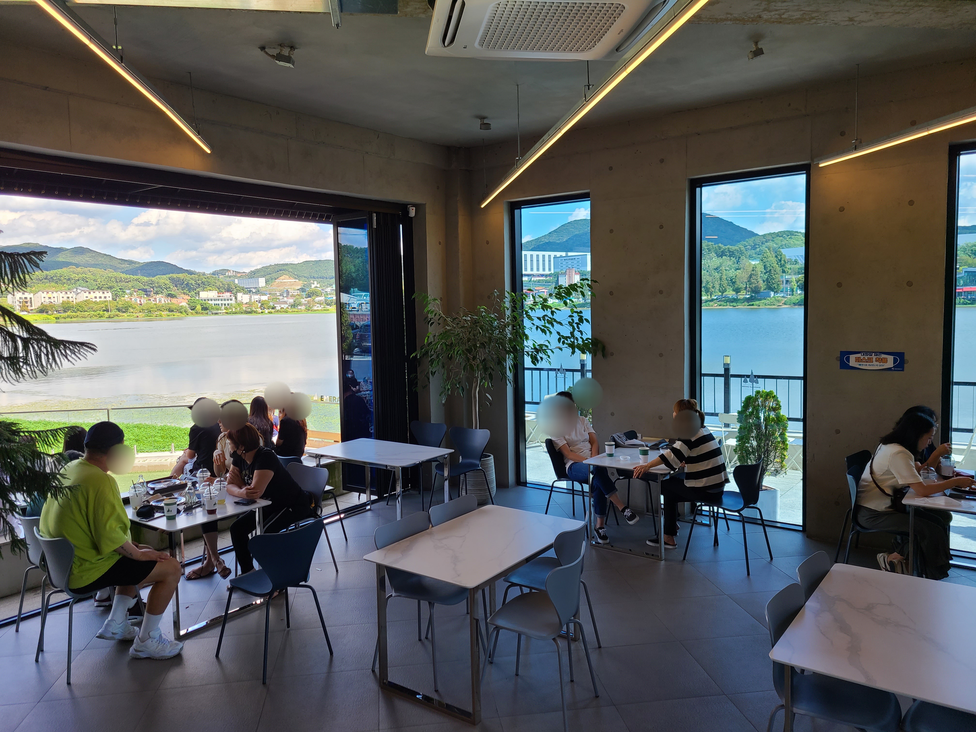 차를 주차하고 카페에 들어서니 야외에도 다양한 위치에 테이블과 의자가 놓여 있었고 칠곡저수지가 한눈에 들어왔다.