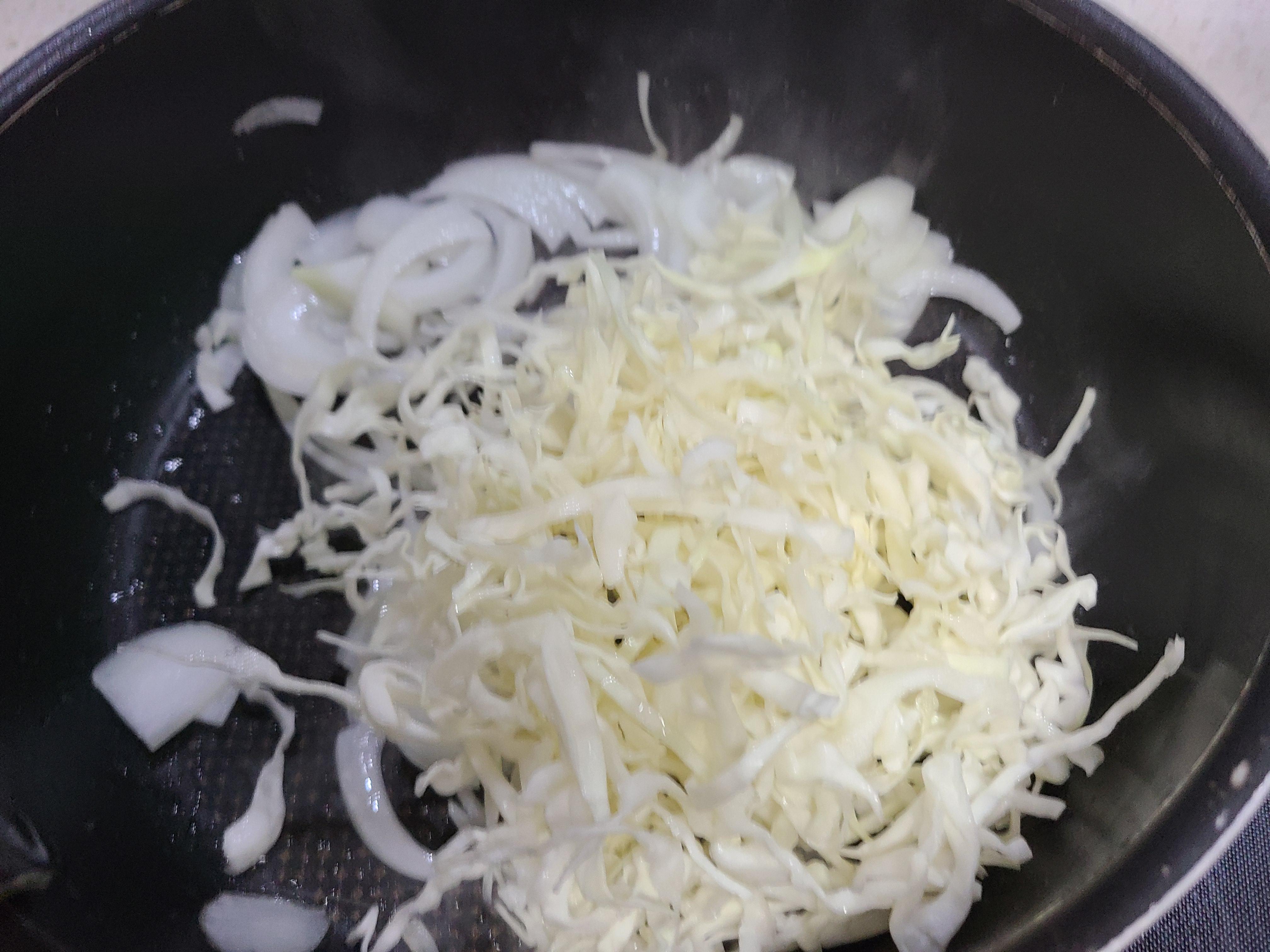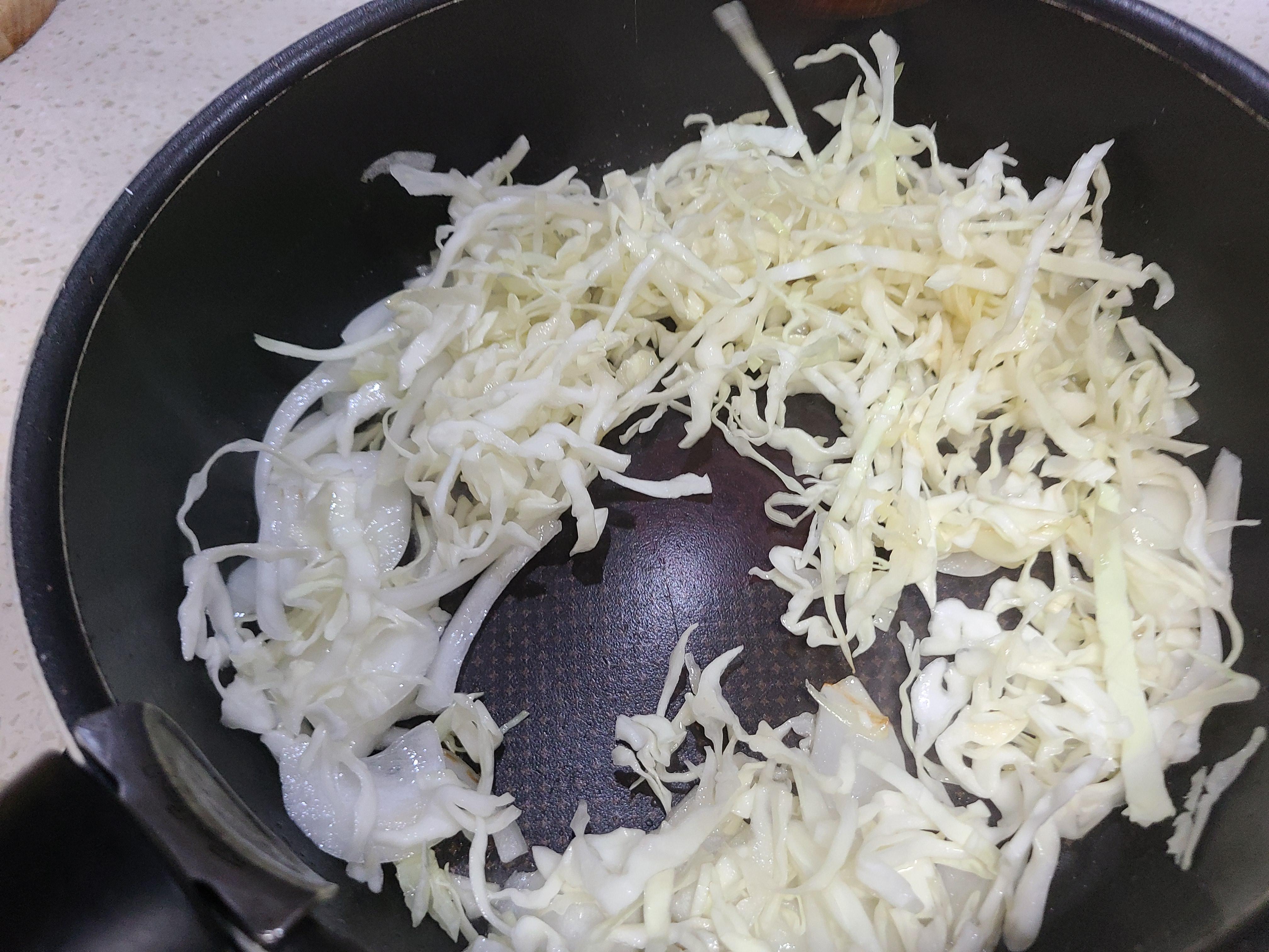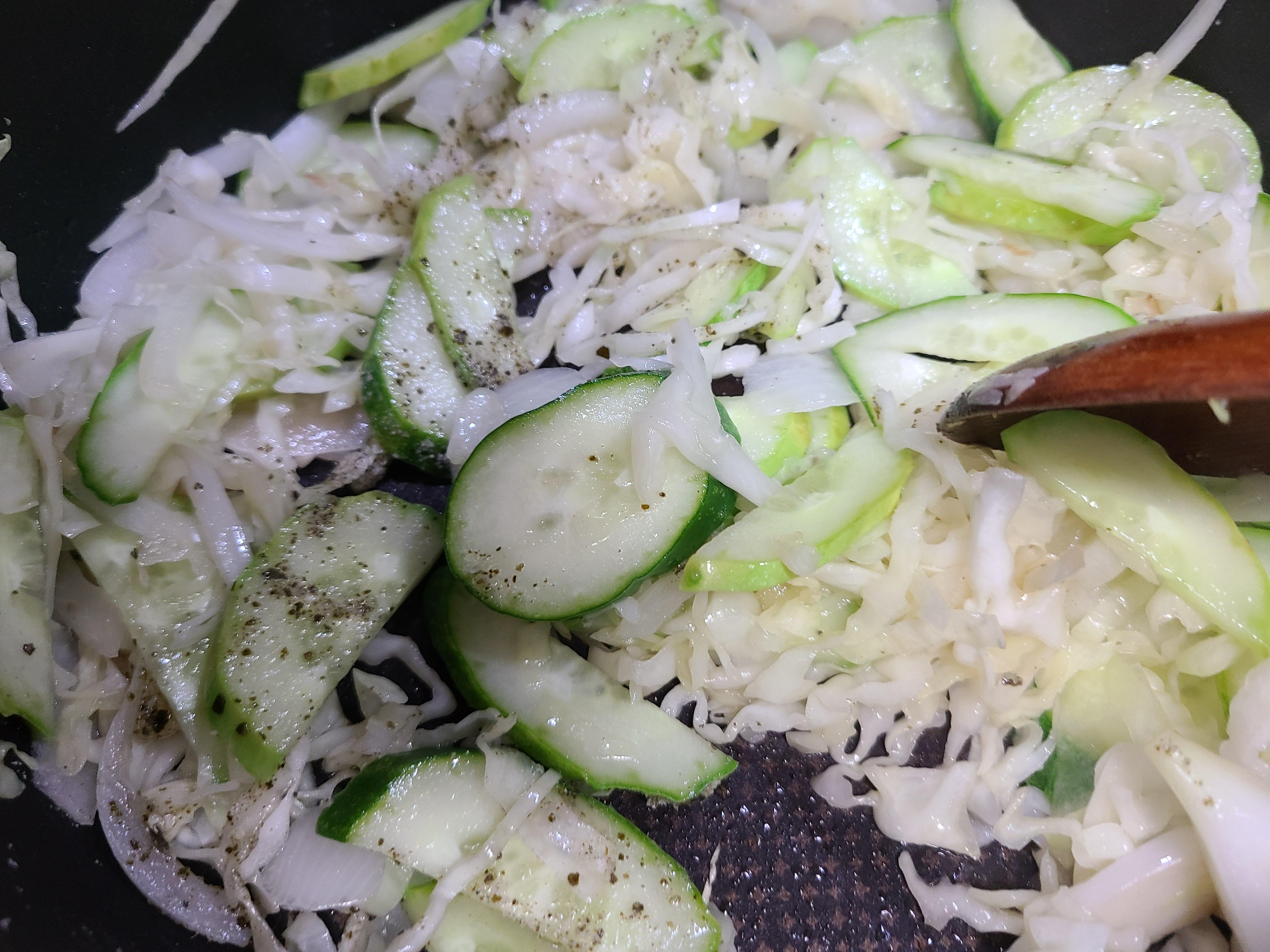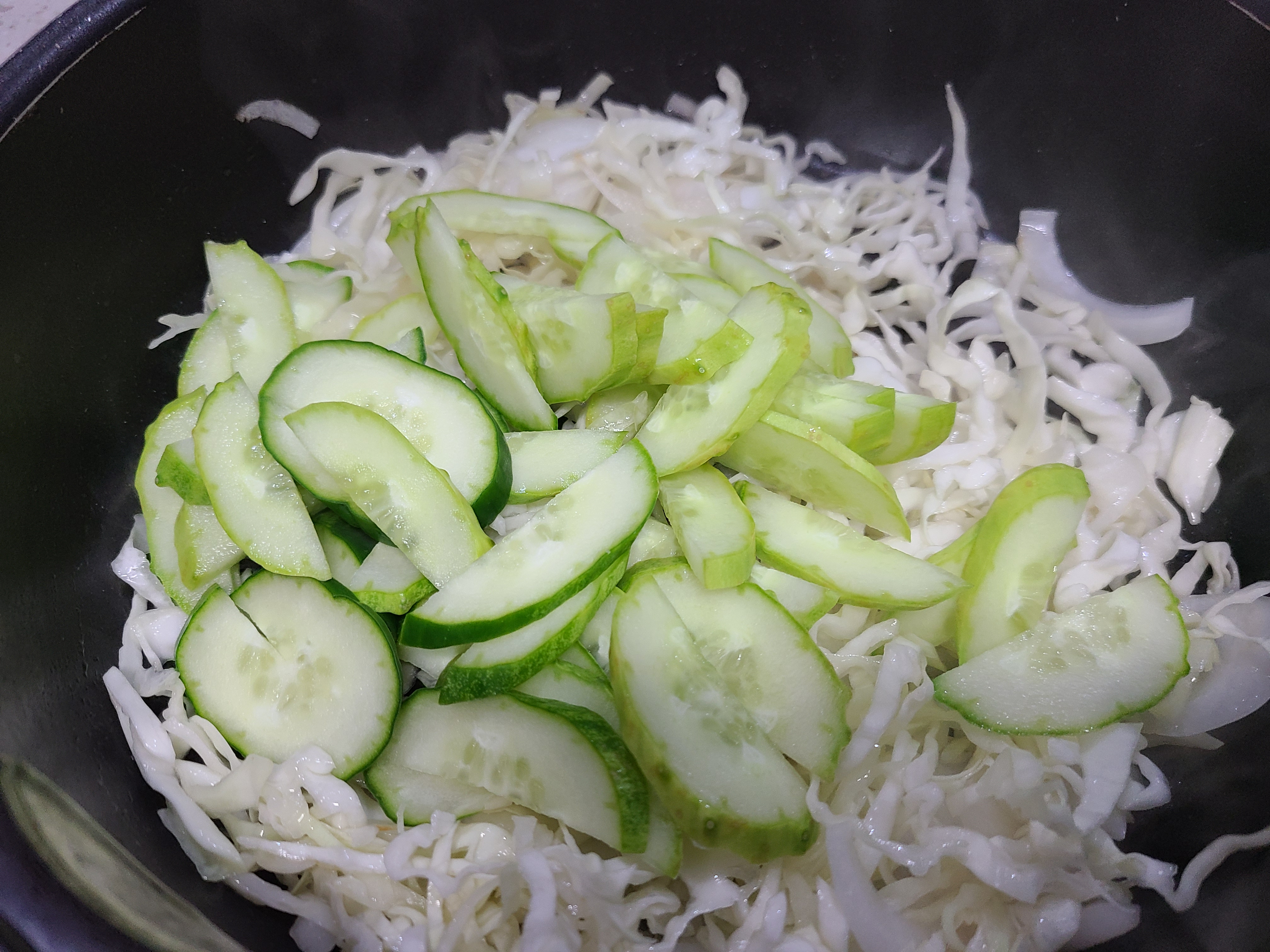 3. 양배추 채친 것을 넣고 볶다가 썰어놓은 오이를 넣어 함께 볶아준다.
