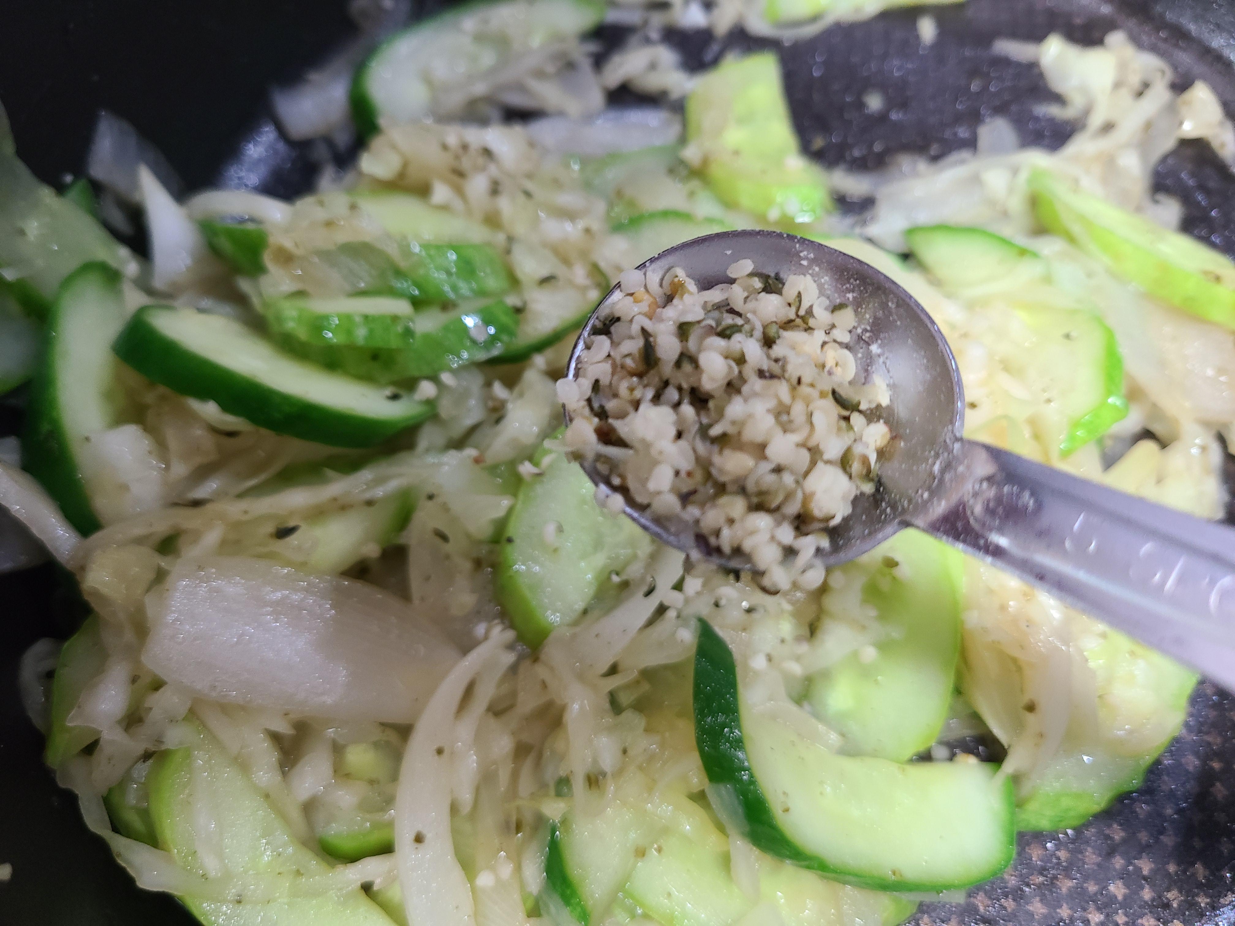 5. 양배추가 숨이 죽으면 불을 끄고 햄프 시드 1작은술과 참기름 한두 방울을 넣고 마무리한다.