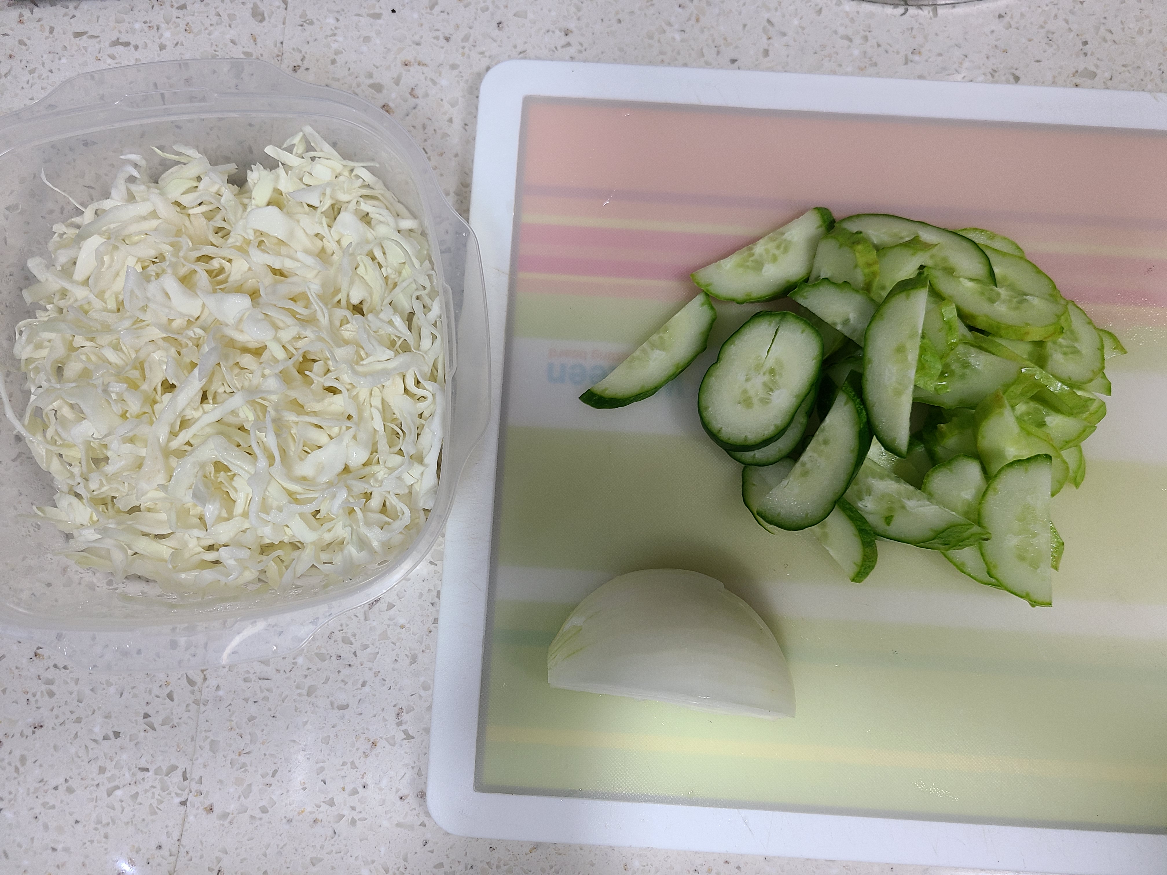 1. 채친 양배추 외로 오이와 양배추를 얇게 채 썰어준다.