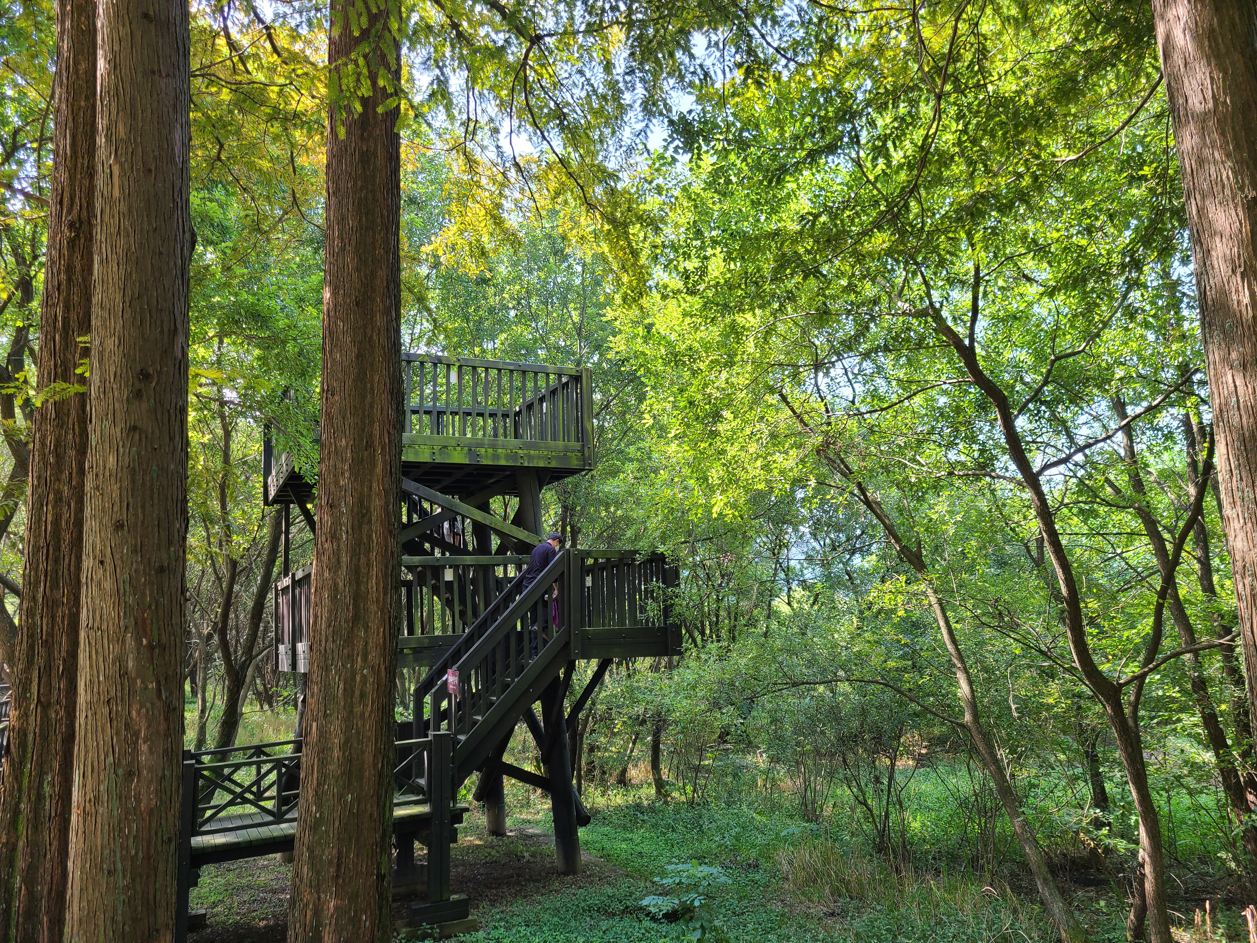 메타세쿼이아 숲에 있는 전망대에 올라가 보았는데 나무에 가려 전망을 볼 수가 없었다.