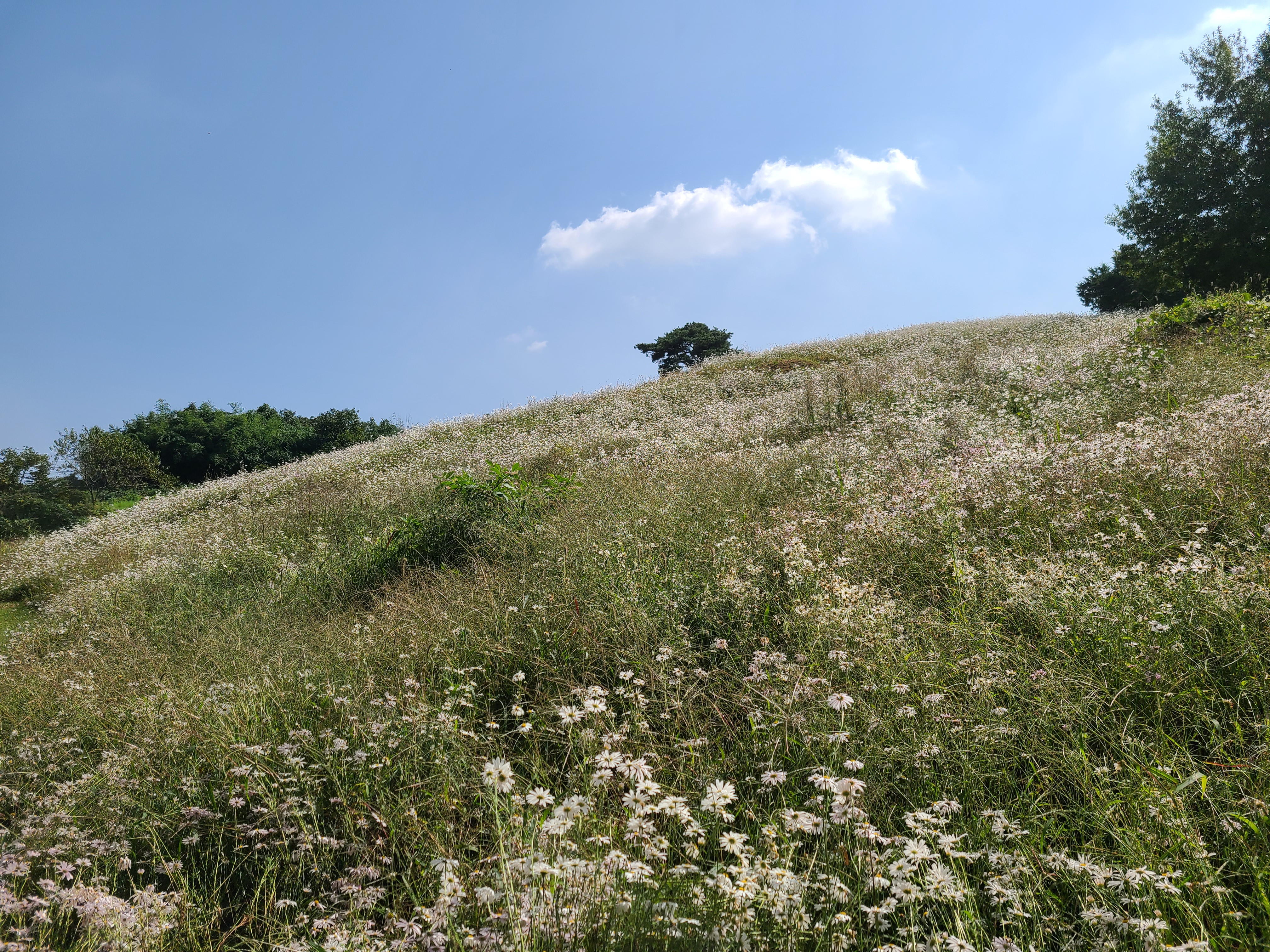 가까이 가보니 구절초가 군락을 이뤄 하얗게 피여 있었다. 많이 이들이 구절초 주변에서 사진을 찍기에 바빴다. 구절초 동산 옆으로는 꽃무릇을 많이 심어놓았는데 이미 꽃이 다 지어 소 꽃은 볼 수가 없었다.