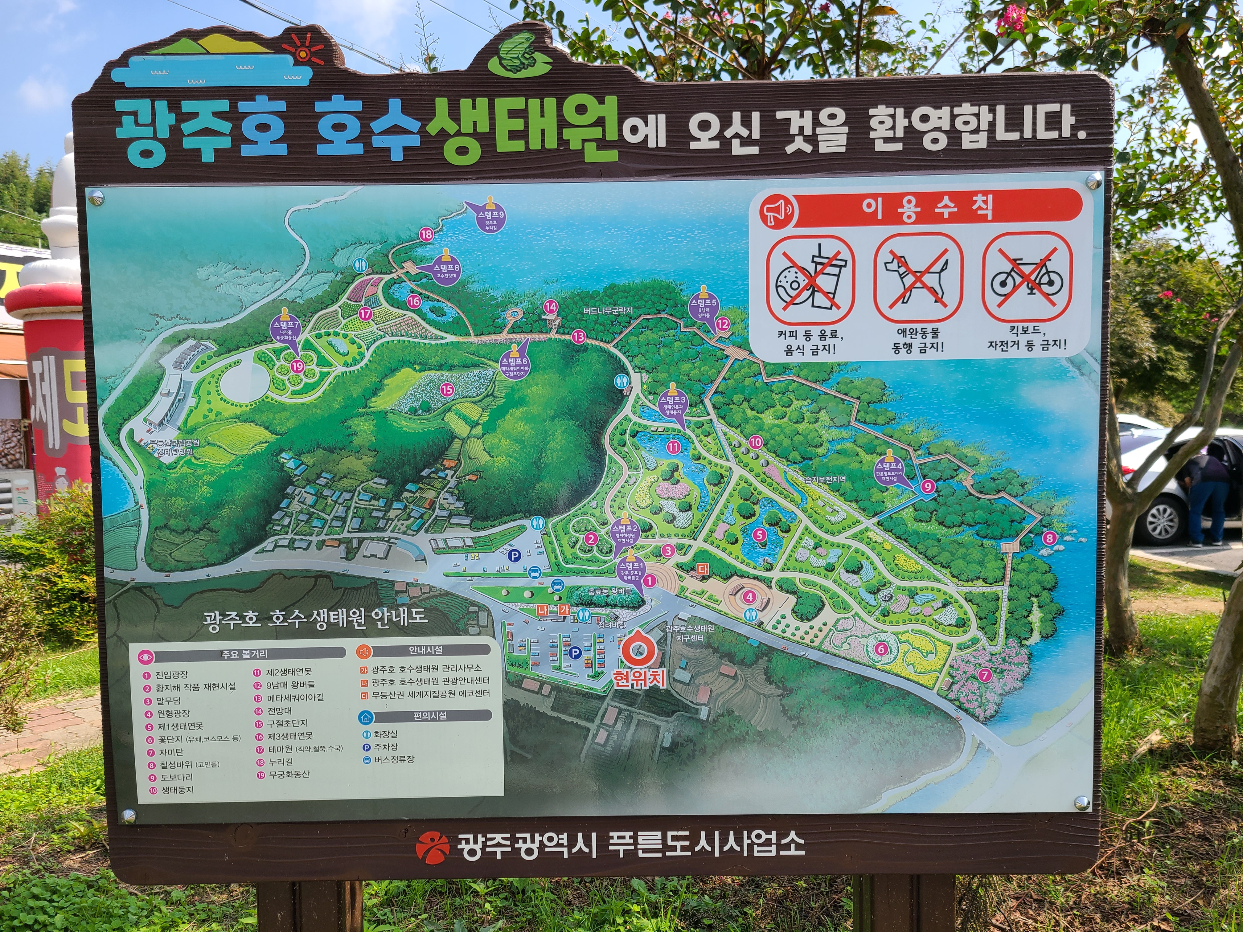 광주호 호수생태원 입구에서 발열체크와 출입 안심콜을 하게 하는데 커피 등 음료, 음식을 갖고 들어가지 못하게 하였고, 애완동물 동행과 킥보드, 롤러스케이트, 자전거 통행금지로 되어있으니 참고하면 좋을 듯하다.
