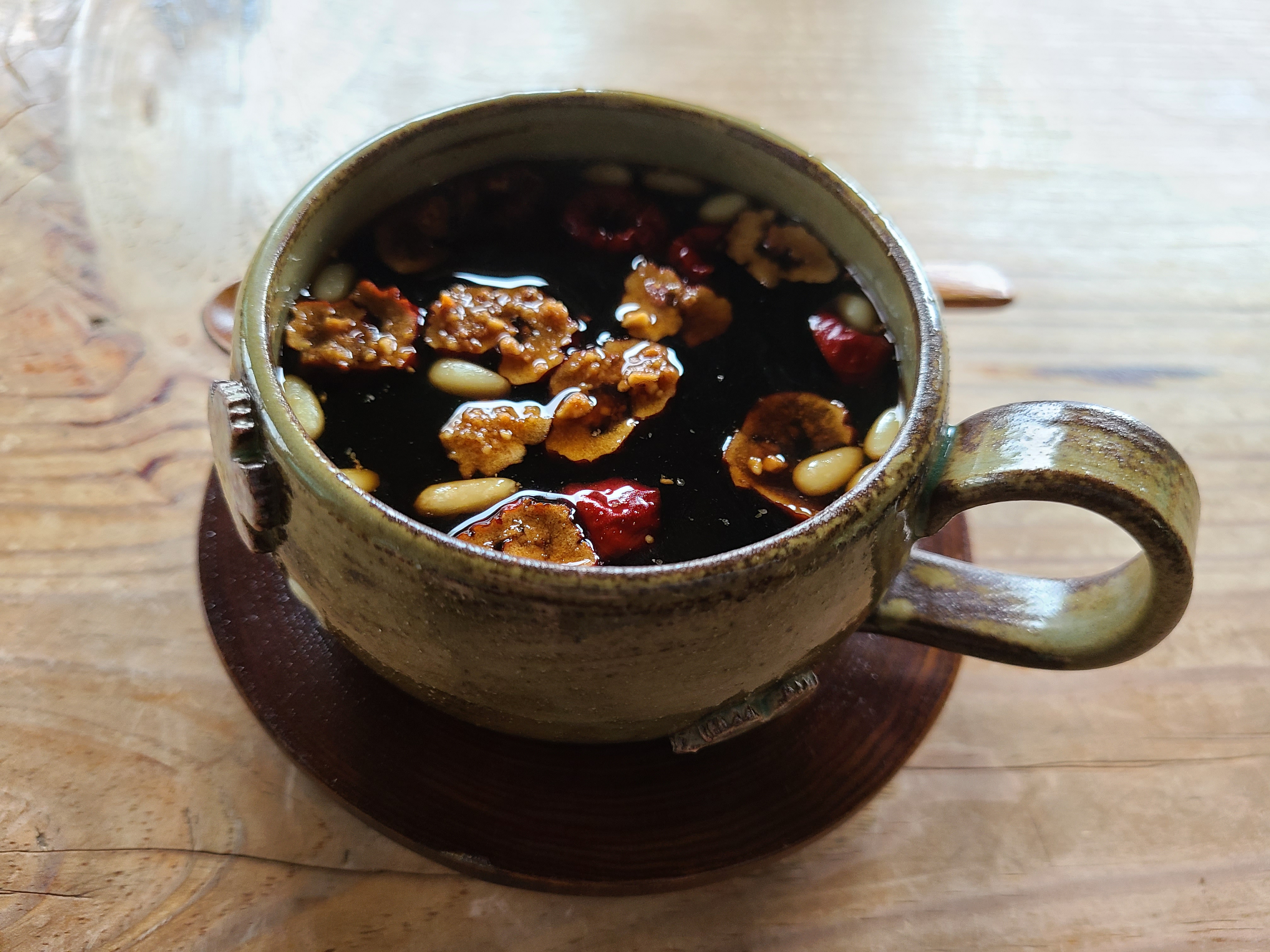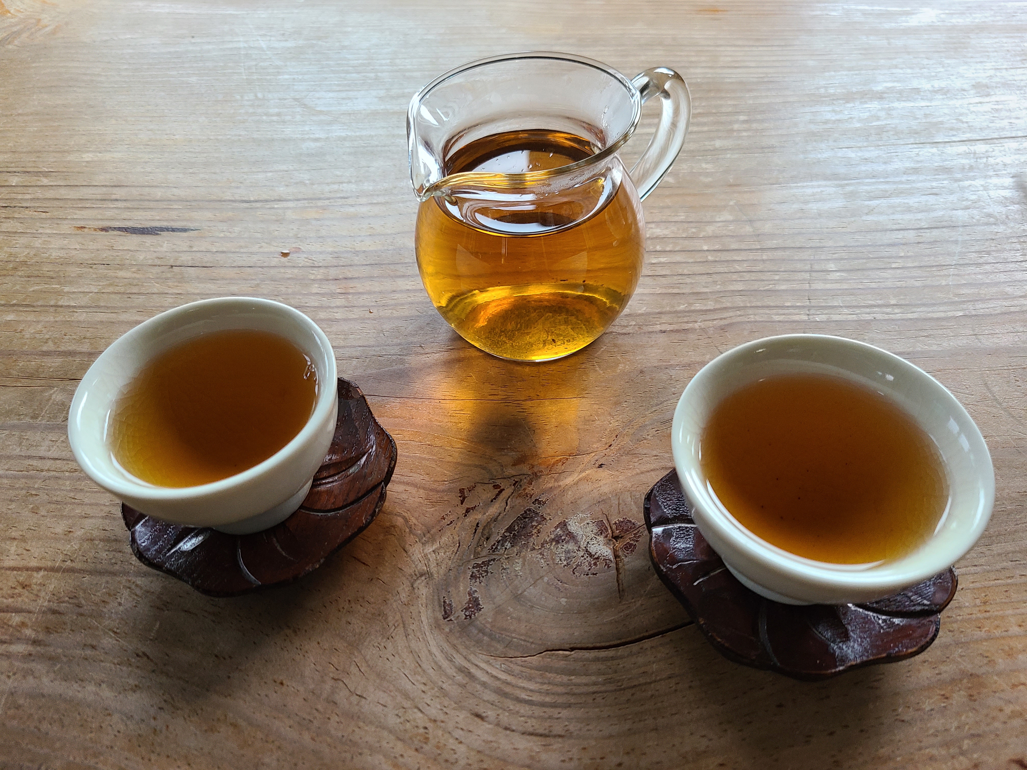 따뜻한 차의 향을 먼저 맡은 후 한 모금을 마시니 보이차 맛이 느껴졌다. 보이차 맛이 느껴진다고 하니 발효시켰다고 하며 녹차와 보이차의 중간이라고 생각하면 된다고 한다.