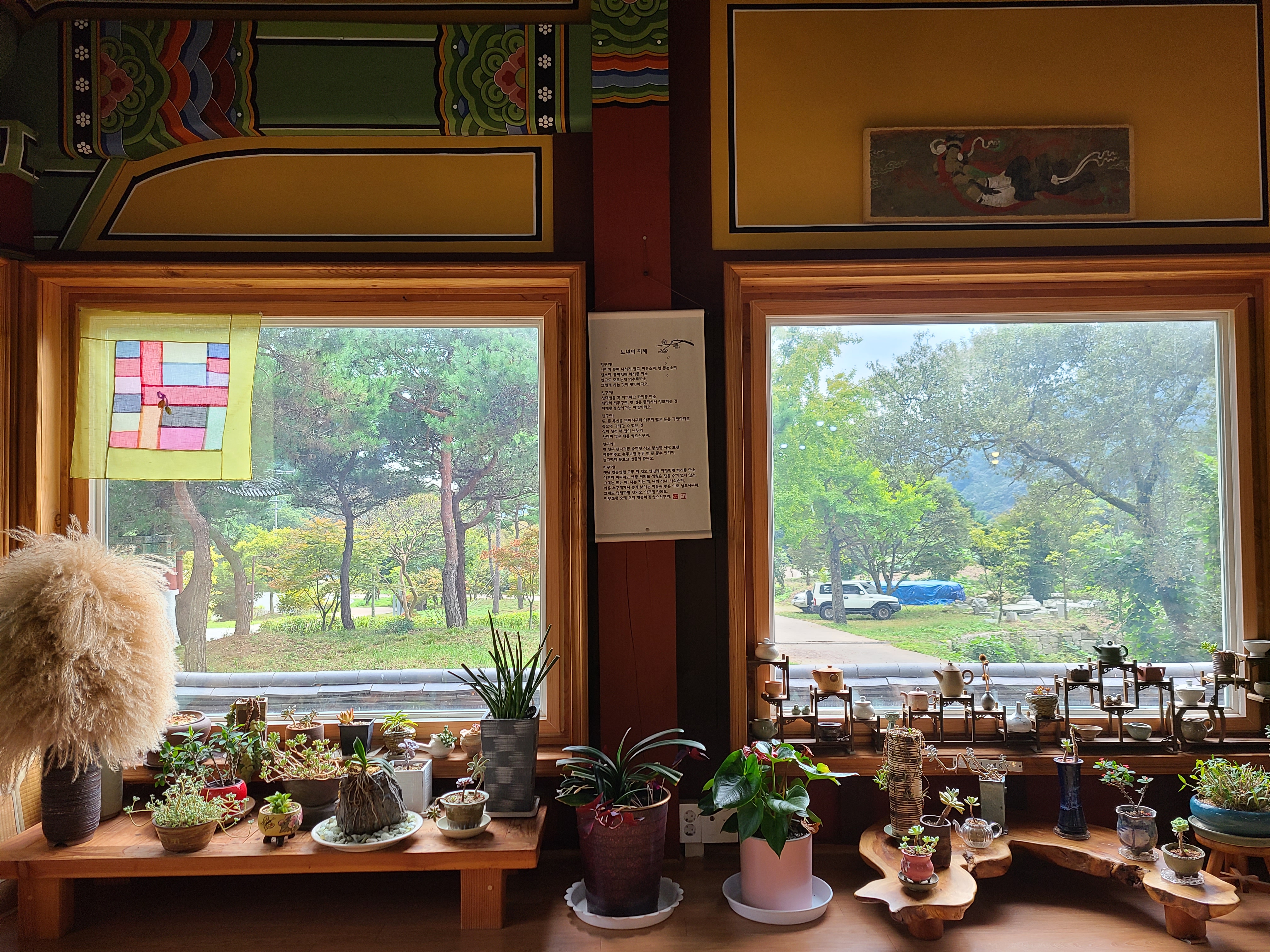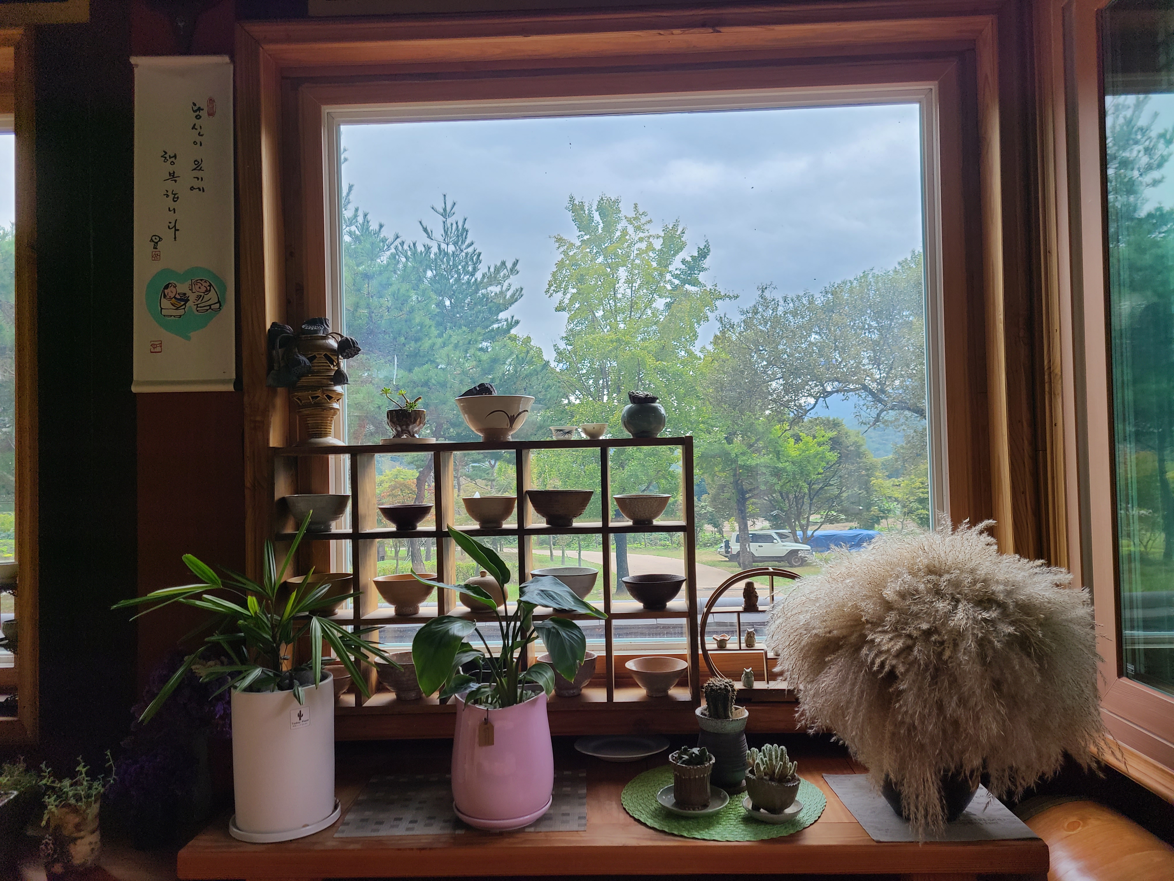 창가에 놓인 화분들과 다기들이 오밀조밀 아름답고 화병에 듬뿍 꽂아놓은 갈대가 가을 정취를 느끼게 한다.