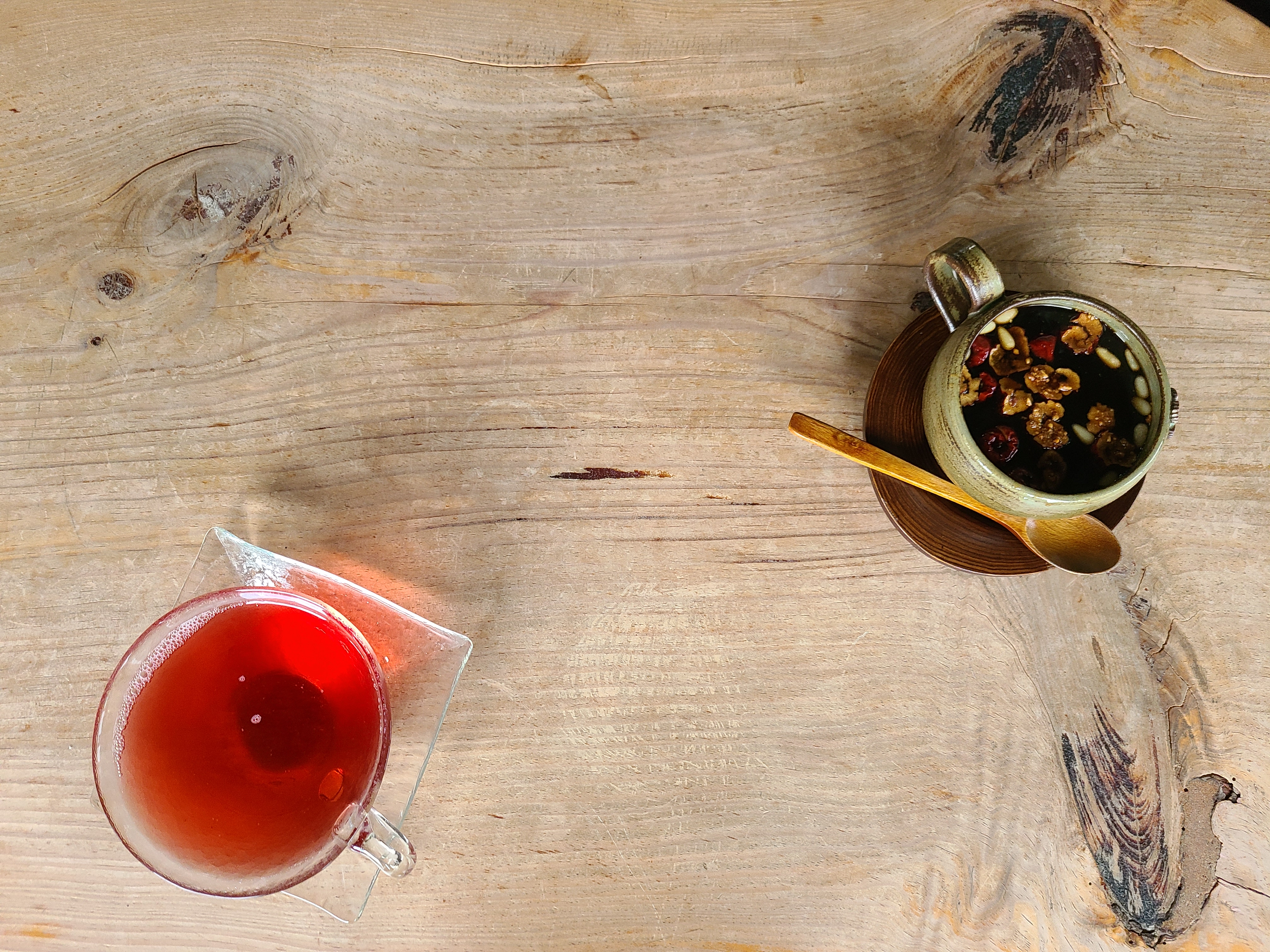주문한 시원한 오미자차와 따뜻한 쌍화차가 나왔다. 화려한 장식 없이 소박하다.