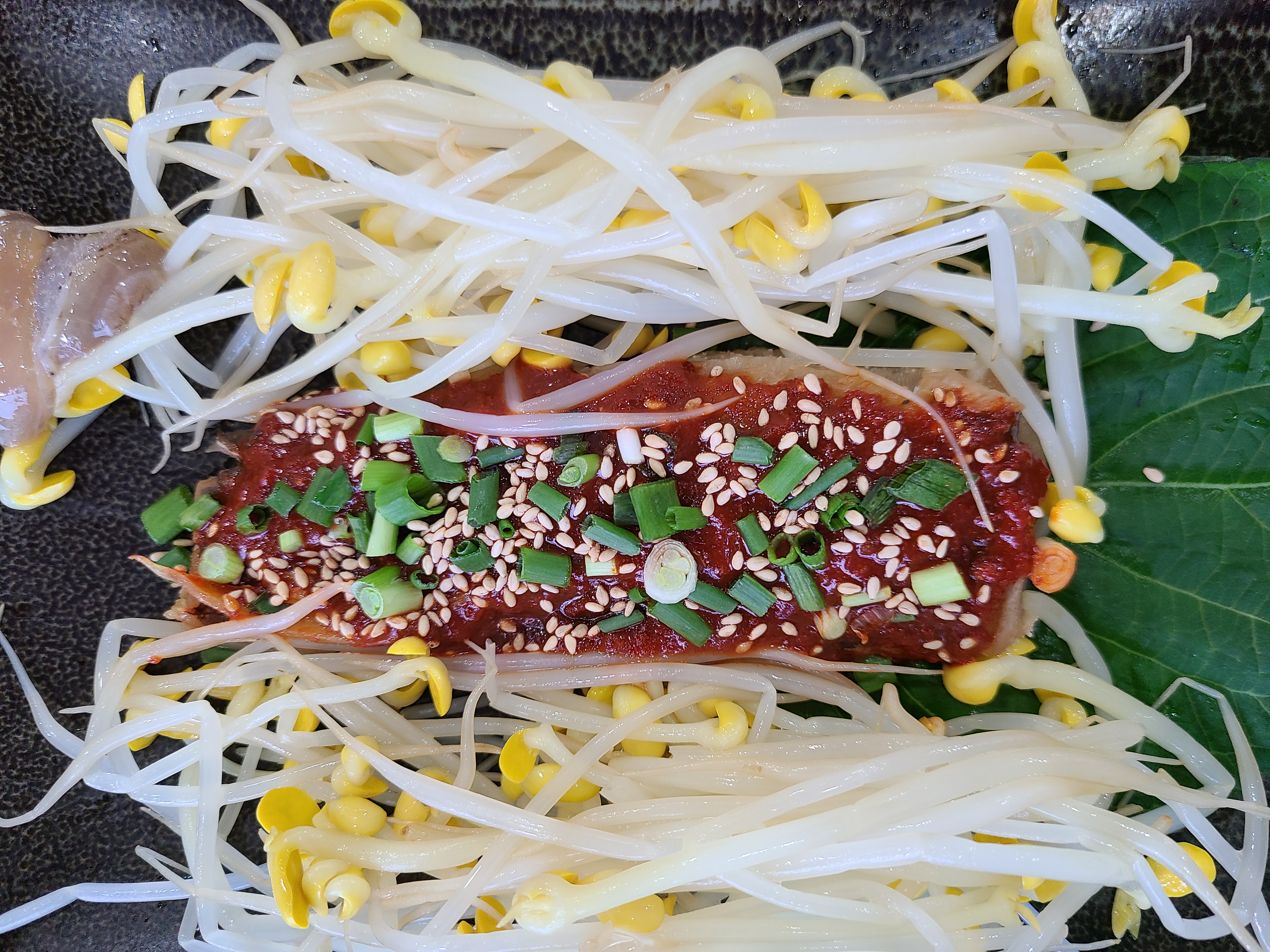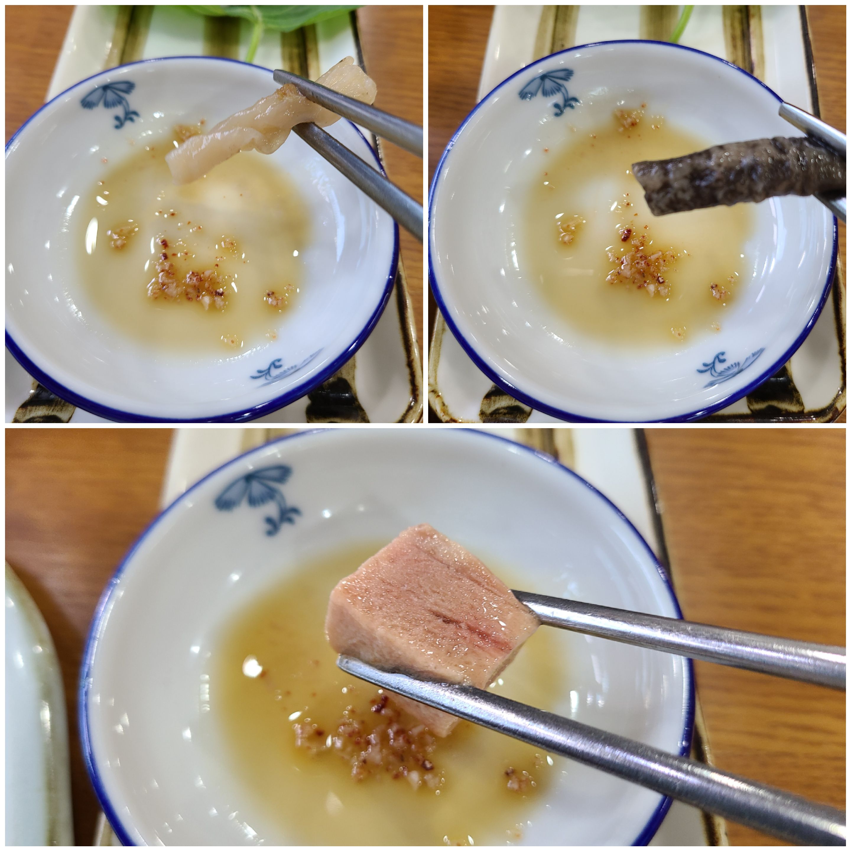 홍어껍질과 홍어 간을 기름장에 찍어 먹어보았다. 홍어 간이 큐브 모양으로 냉동상태인데 기름장에 찍어 입에 넣으니 그대로 사르르 녹아버린다. 홍어껍질도 쫄깃해서 거부감 없이 잘 먹었다.