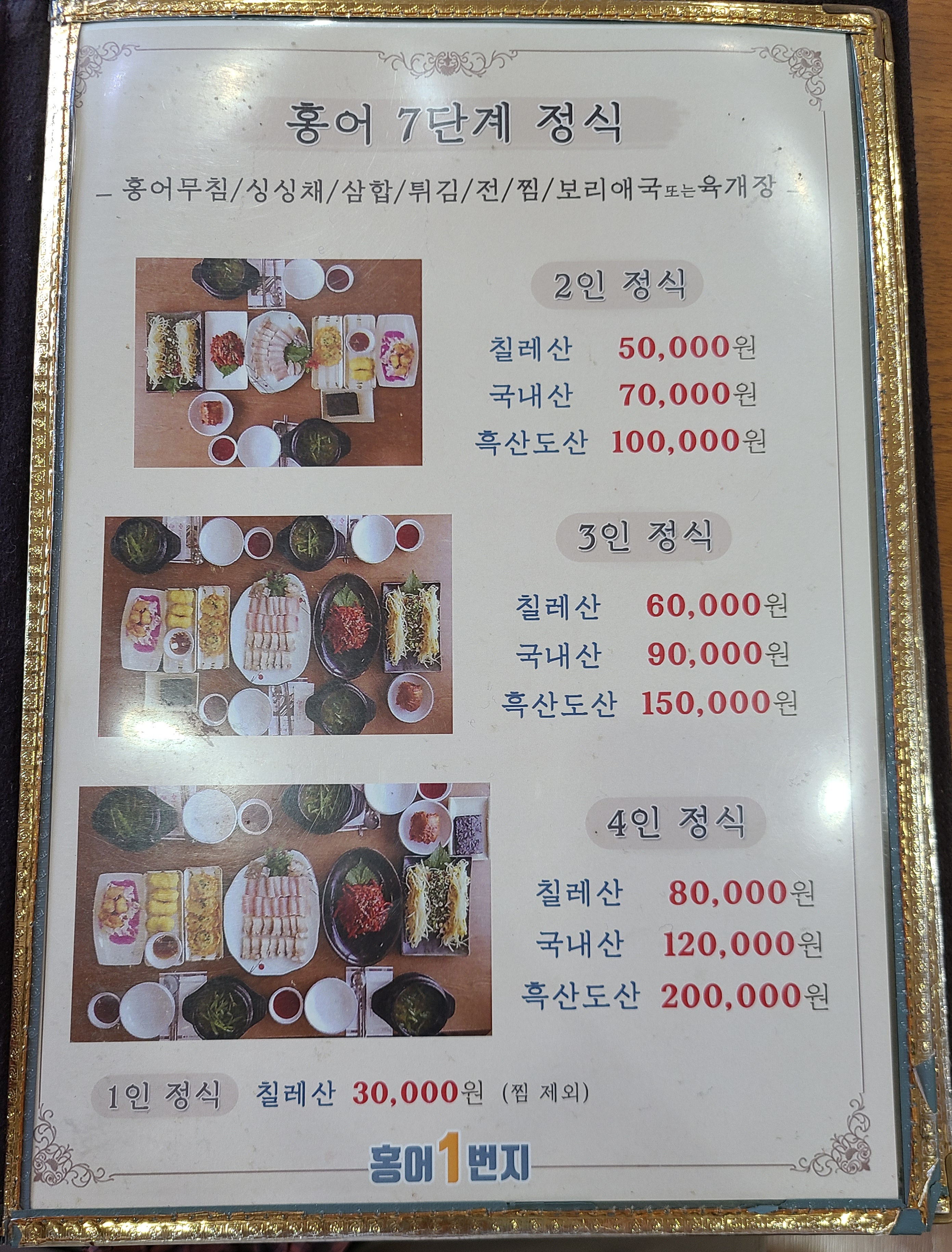 처음 간 곳이어서 골고루 맛을 보기 위해 홍어 7단계 정식 국내산으로 주문을 했다. 주문하면서 조금 약한 거로 달라고 하니 중간단계로 나가니 한번 먹어보라고 한다.