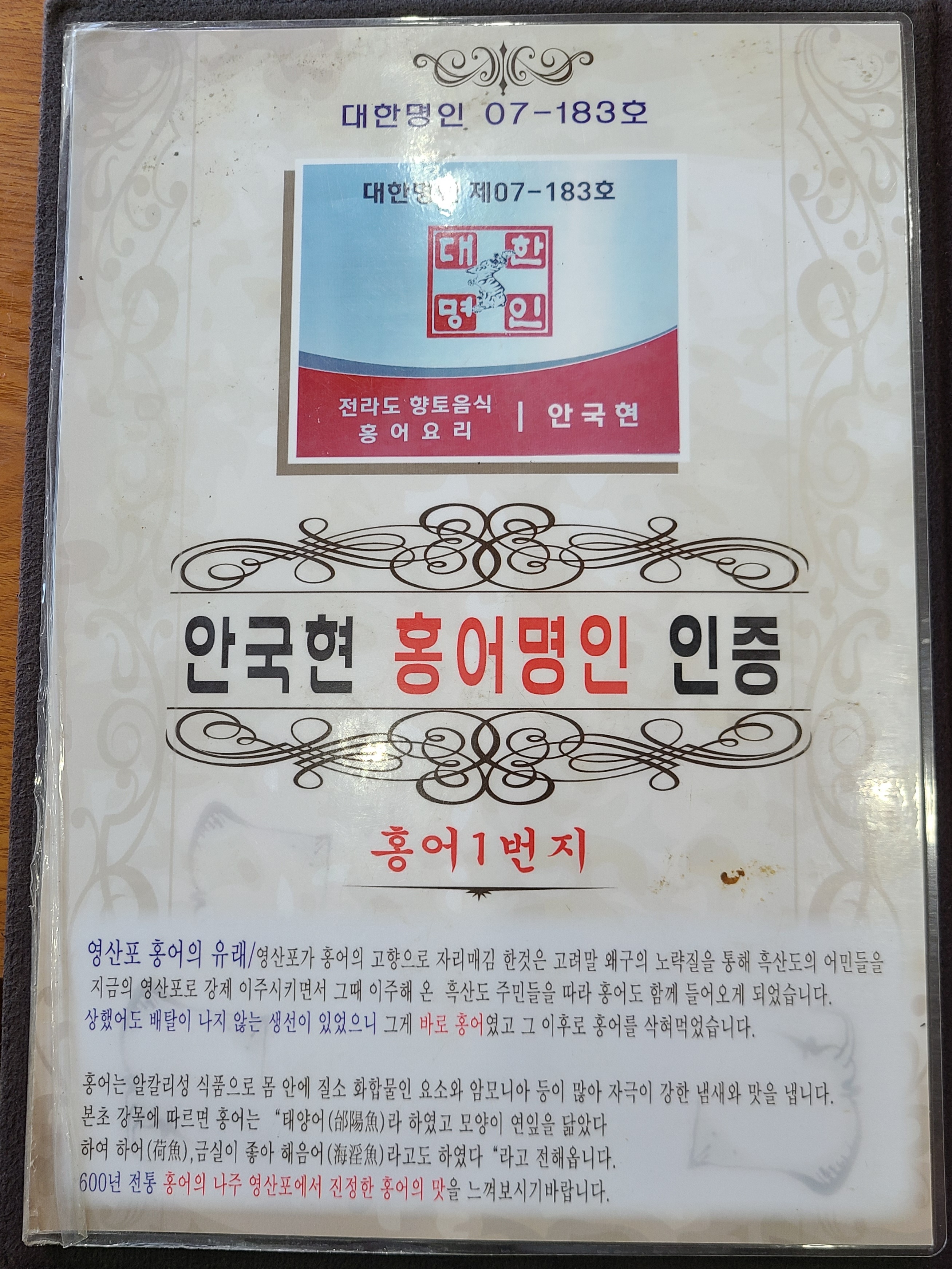 무엇보다도 전라도 향토음식 홍어요리로 대한명인으로 인증받은 인증서가 신뢰가 갔다.