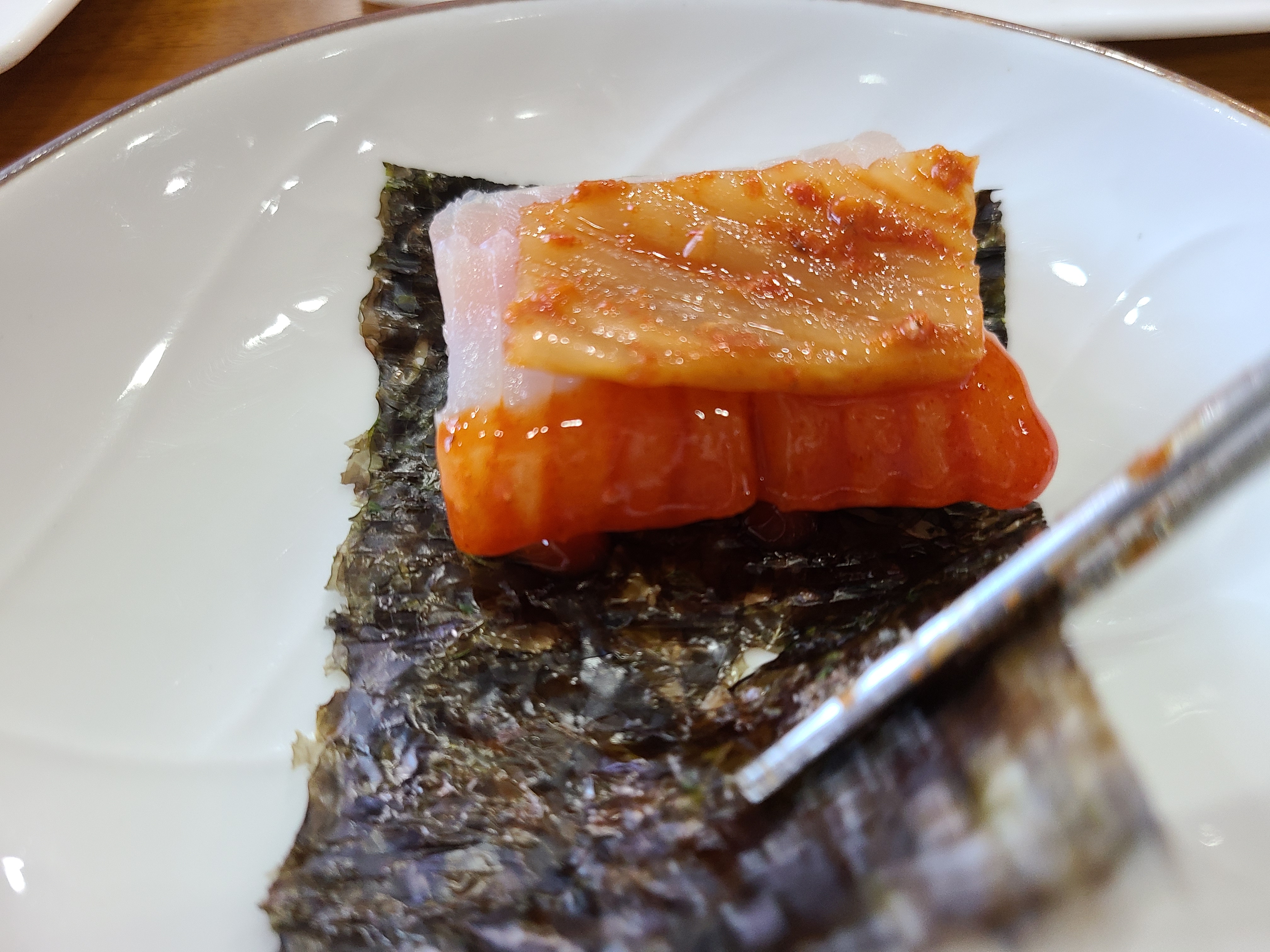 직원분이 앞접시에 김을 깔고 돼지고기 한 점을 놓고 홍어를 초장에 찍어 올린 후 묵은지 한쪽을 얹어 김으로 싸서 먹어보라고 준다.