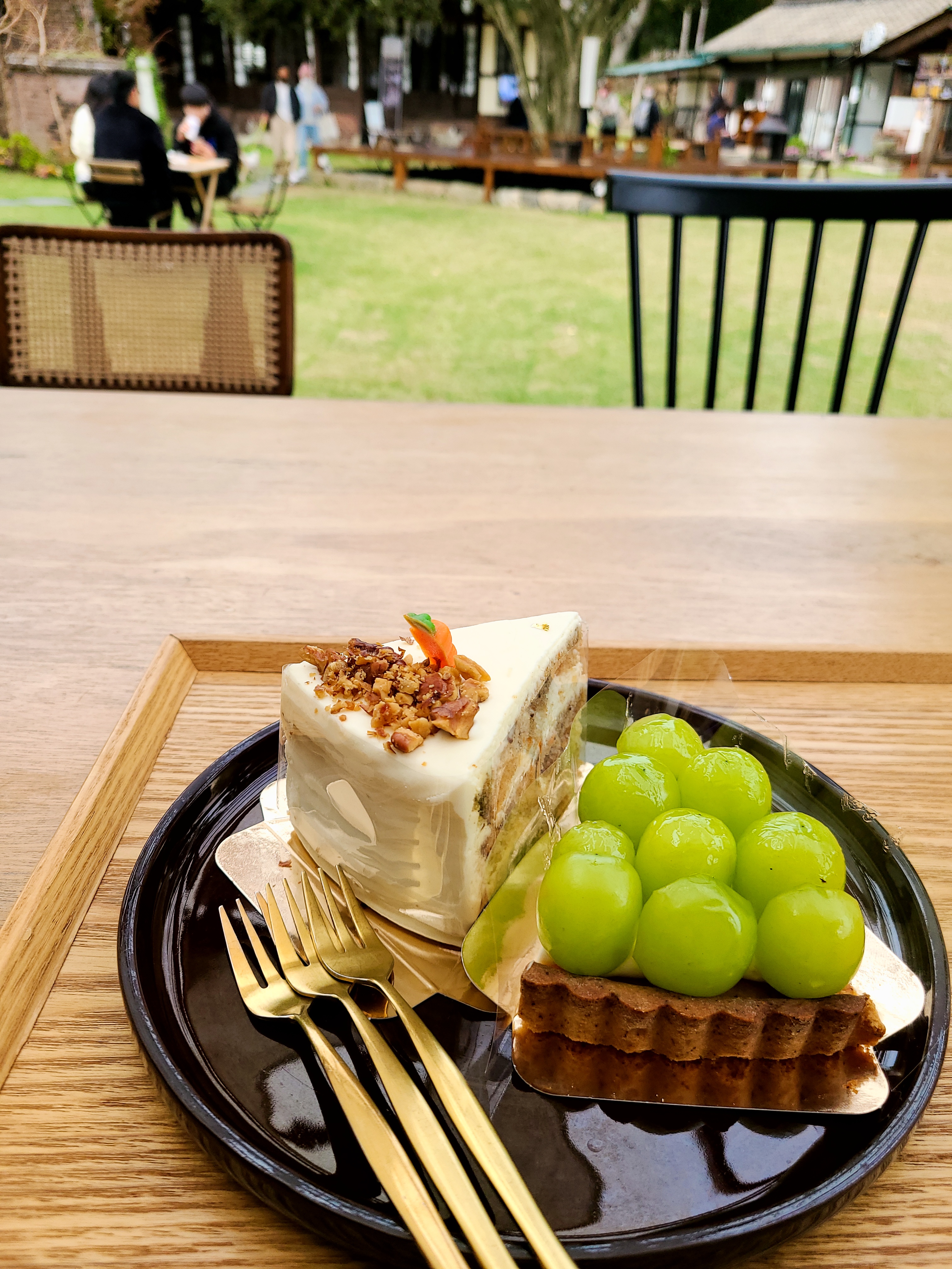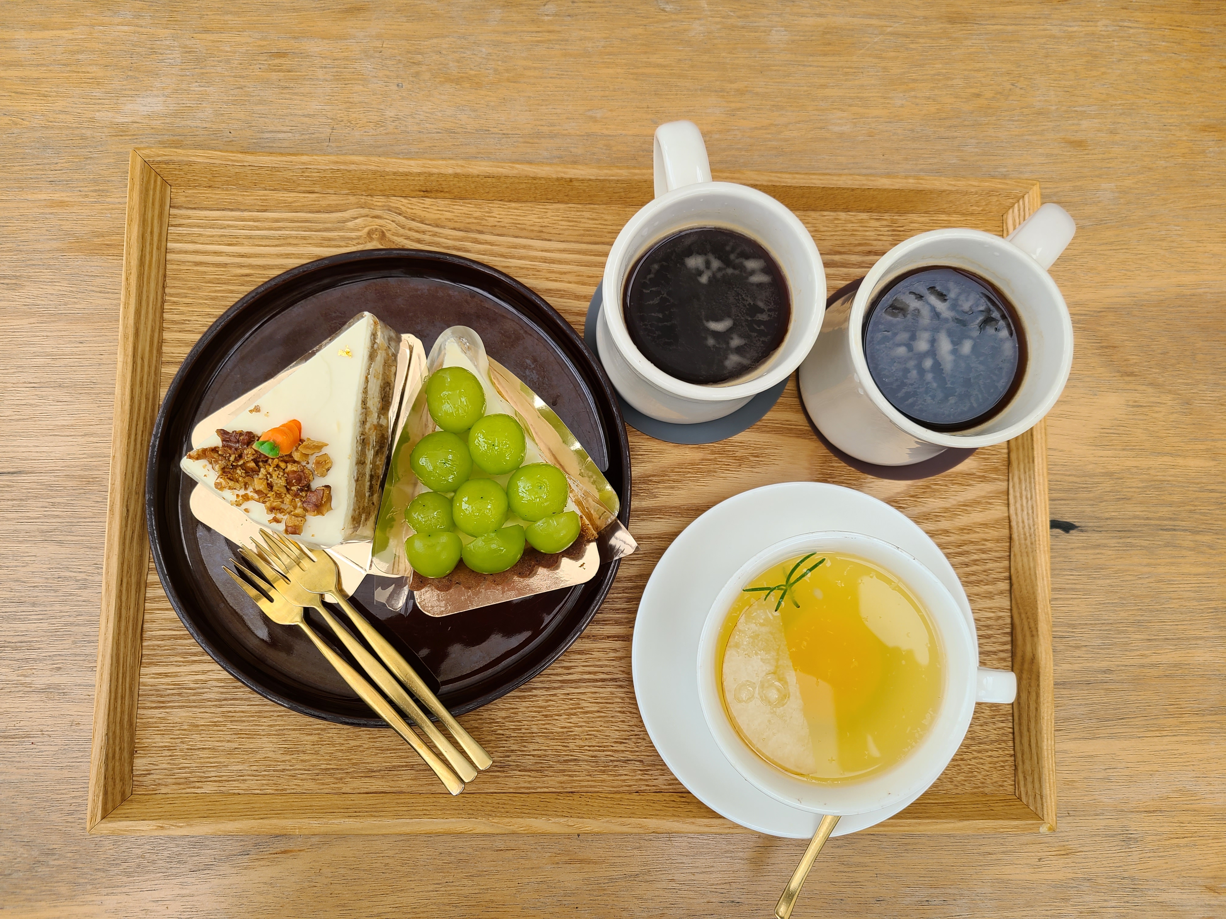 나주배 청귤 차와 커피를 그리고 당근케이크와 샤인 머스켓을 올린 크림치즈 타르트를 주문했다.