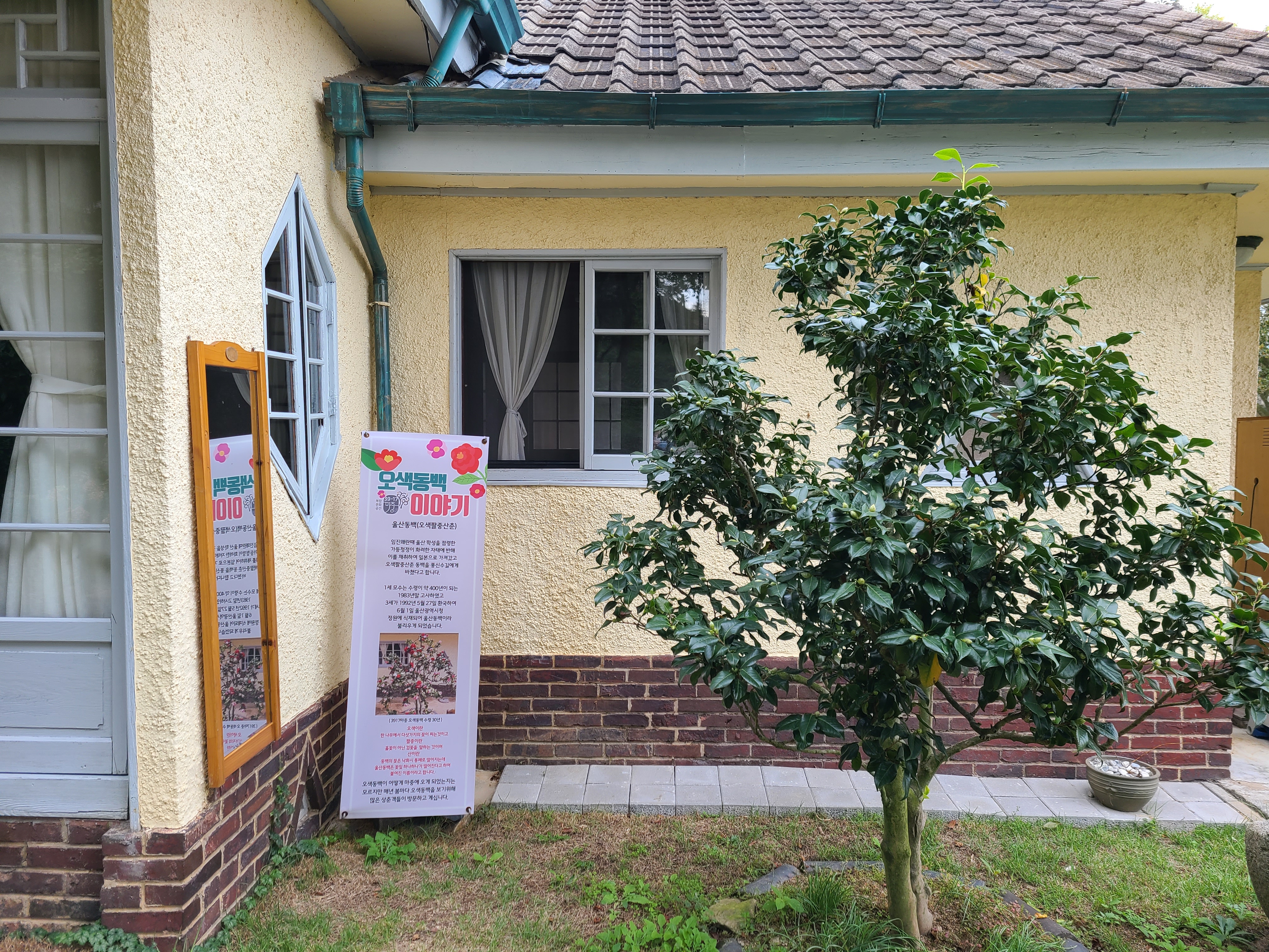 목서원 사랑채 쪽에 있는 동백나무 옆에 오색 동백 이야기가 적혀 있어 살펴보니 수령이 30년이 된 오색 동백은 울산동백(오색팔중산춘)으로 불린다고 한다. 오색이란 한 나무에 5가지 모양의 꽃이 핀다는 뜻이고, 팔중이란 홀 꽃이 아닌 겹꽃을 말하며 산춘은 동백은 꽃송이채 떨어지는데 이 꽃은 꽃잎이 하나씩 떨어져서 이름 붙여진 것이라고 한다.