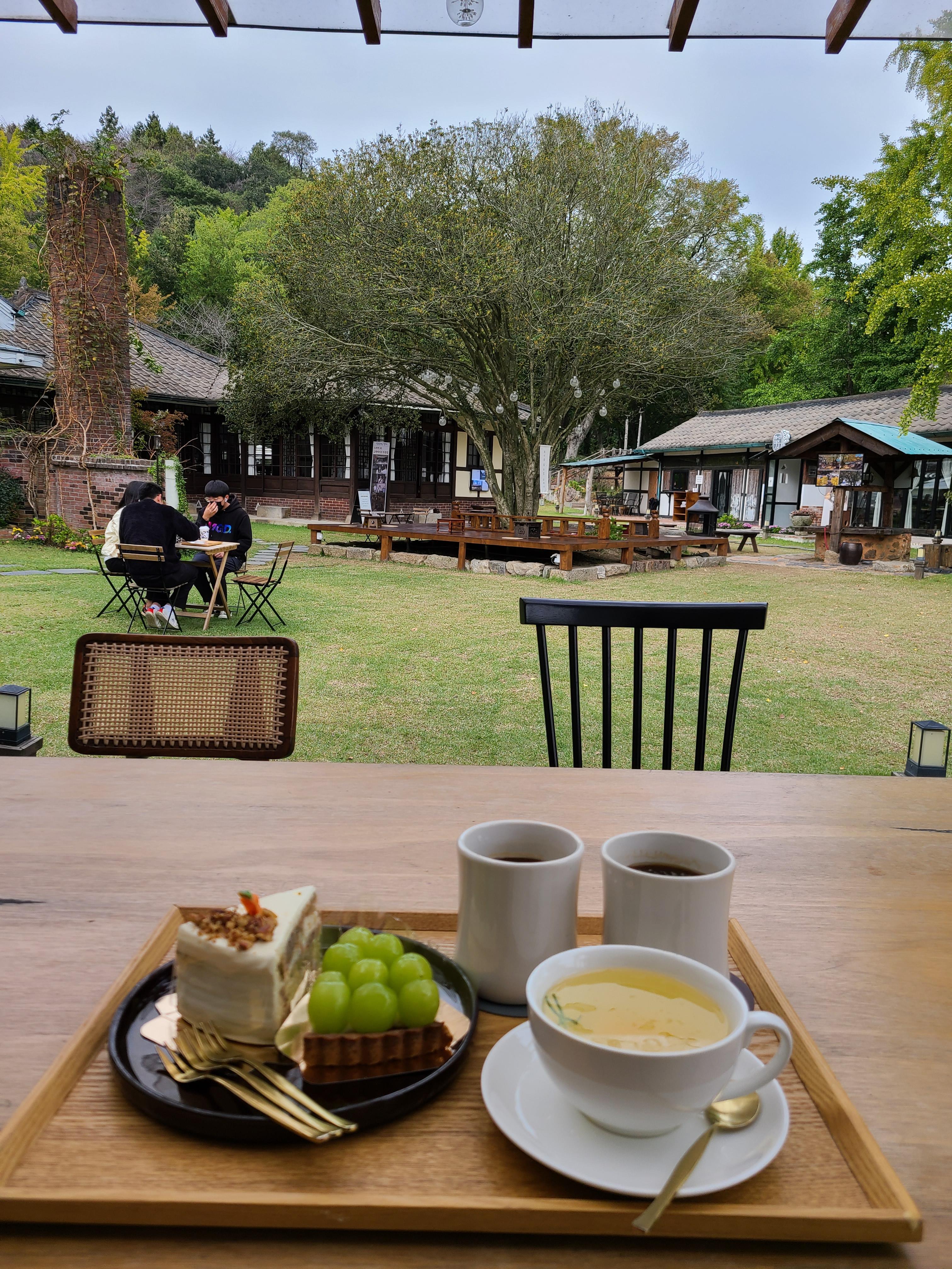 음료와 케이크를 들고 목서원과 우물 그리고 카페를 마주 하고 있는 곳에 앉아 시간을 보냈다.
