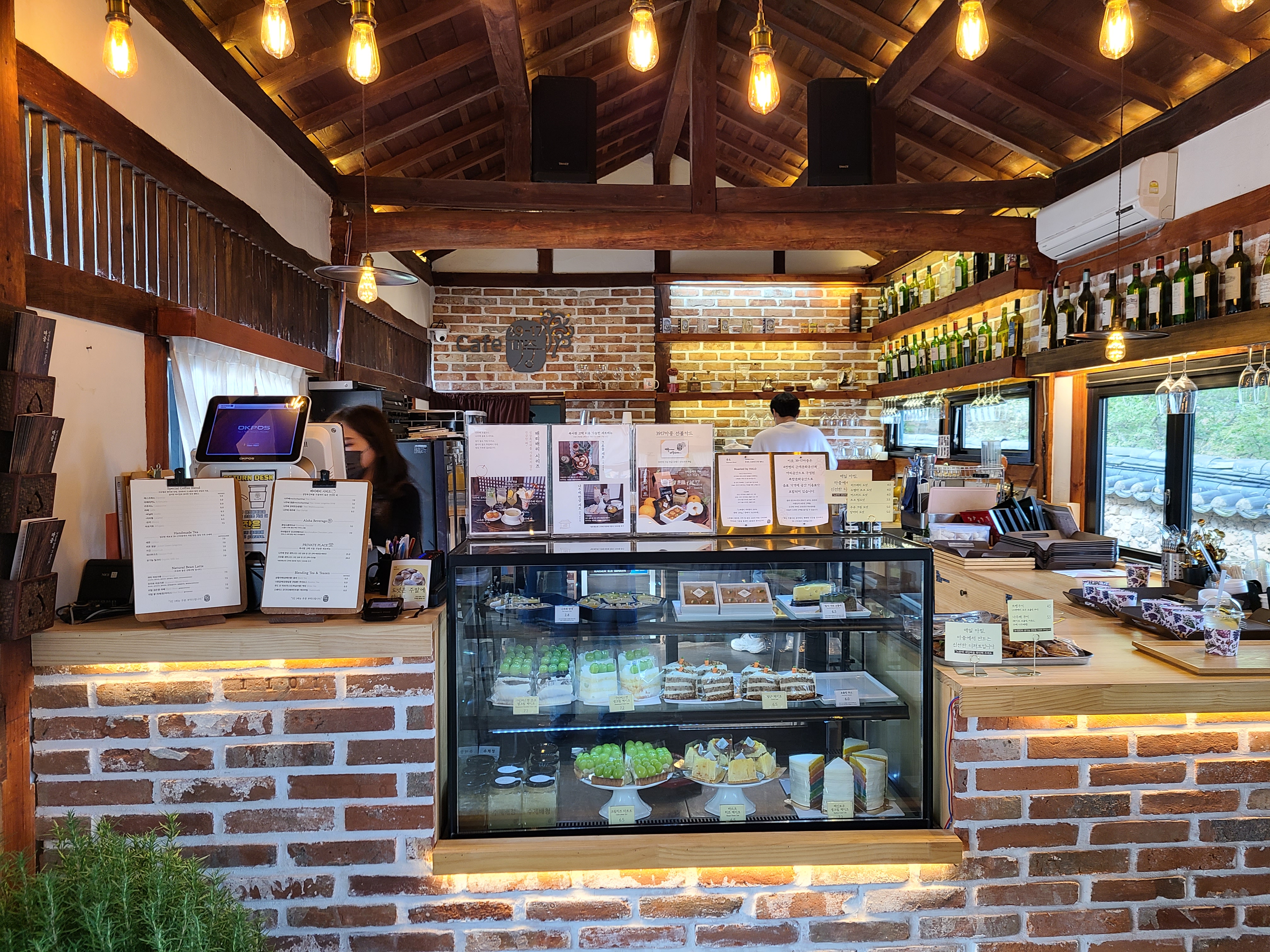음료를 주문하려고 카페에 들어갔다. 목재와 전구의 빛이 어우러져 따뜻한 느낌의 카페였다.