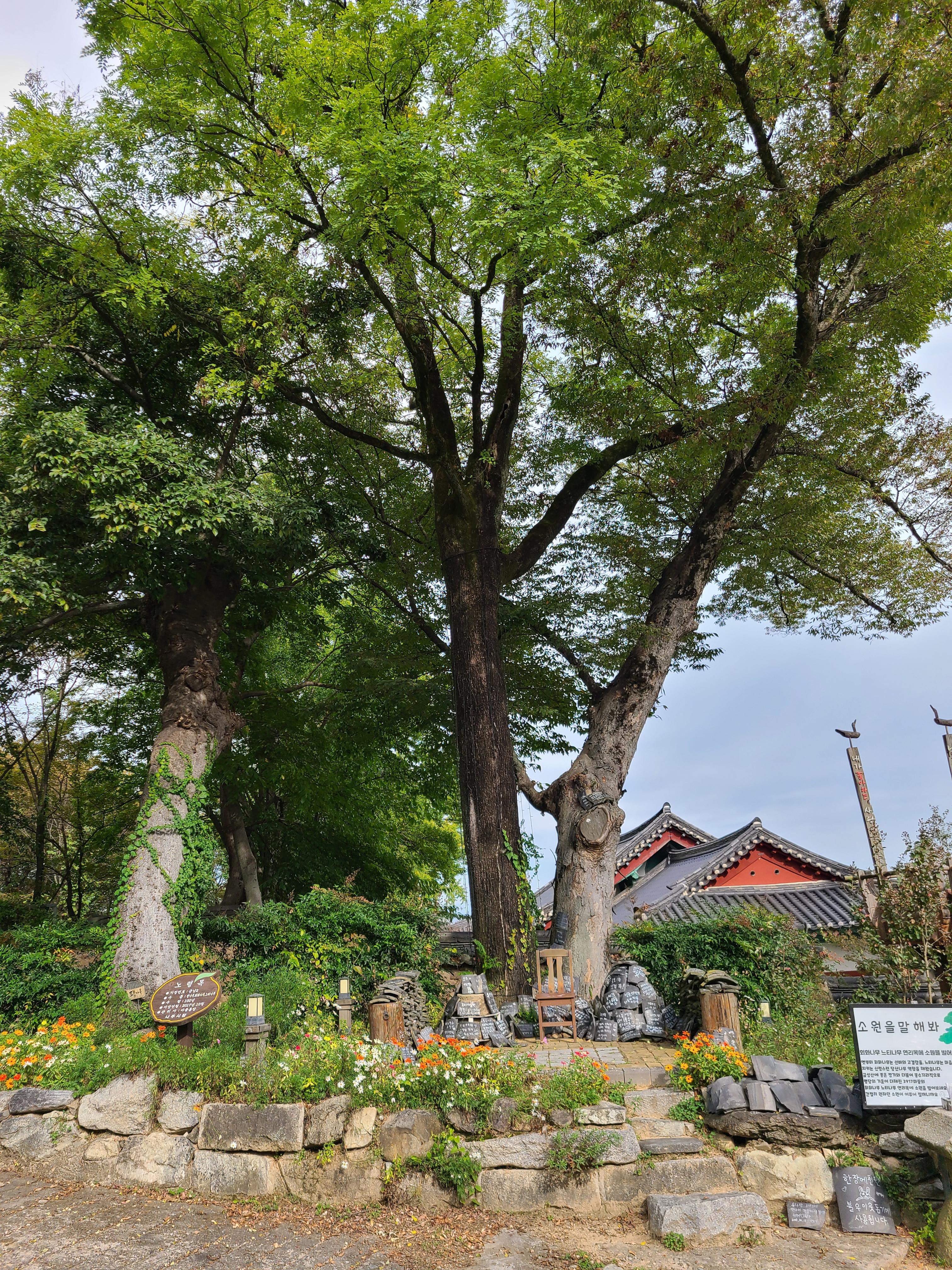 입구에 회화나무와 느티나무 연리목이 있는데, 연리목 앞에서 소원을 빌며 이루어진다며 기와 한 장에 1,000원에 판매하고 있었다. 연리목 아래에 소원 문구가 적힌 기와장이 쌓여 있는데 수익금은 불우이웃 돕기에 사용된다고 한다.