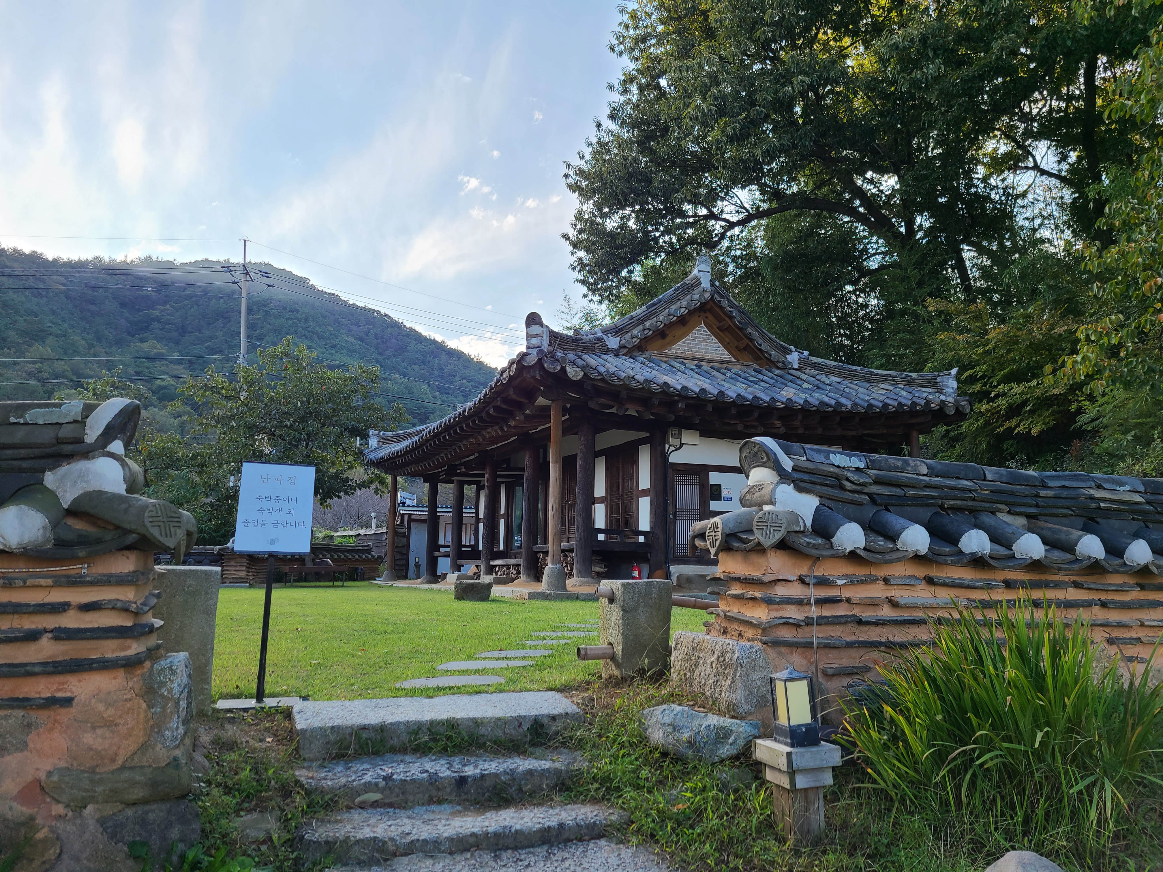 그네를 지나서 가보니 난파 정이 있다. 목서원과 함께 게스트하우스로 운영하고 있는 곳인데 마팀 숙박 중이어서 숙박객 외에는 출입을 금한다는 안내 뭄을 보고는 돌아섰다.